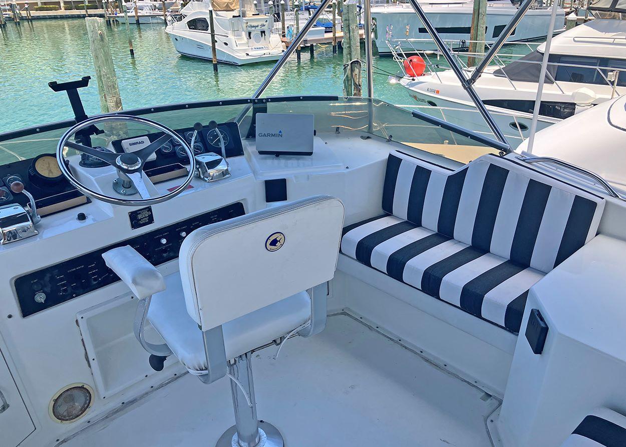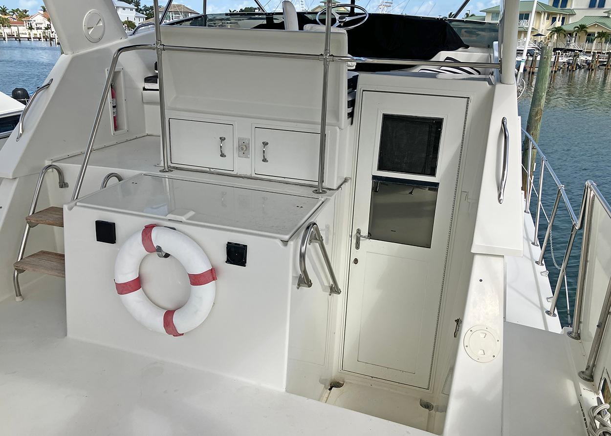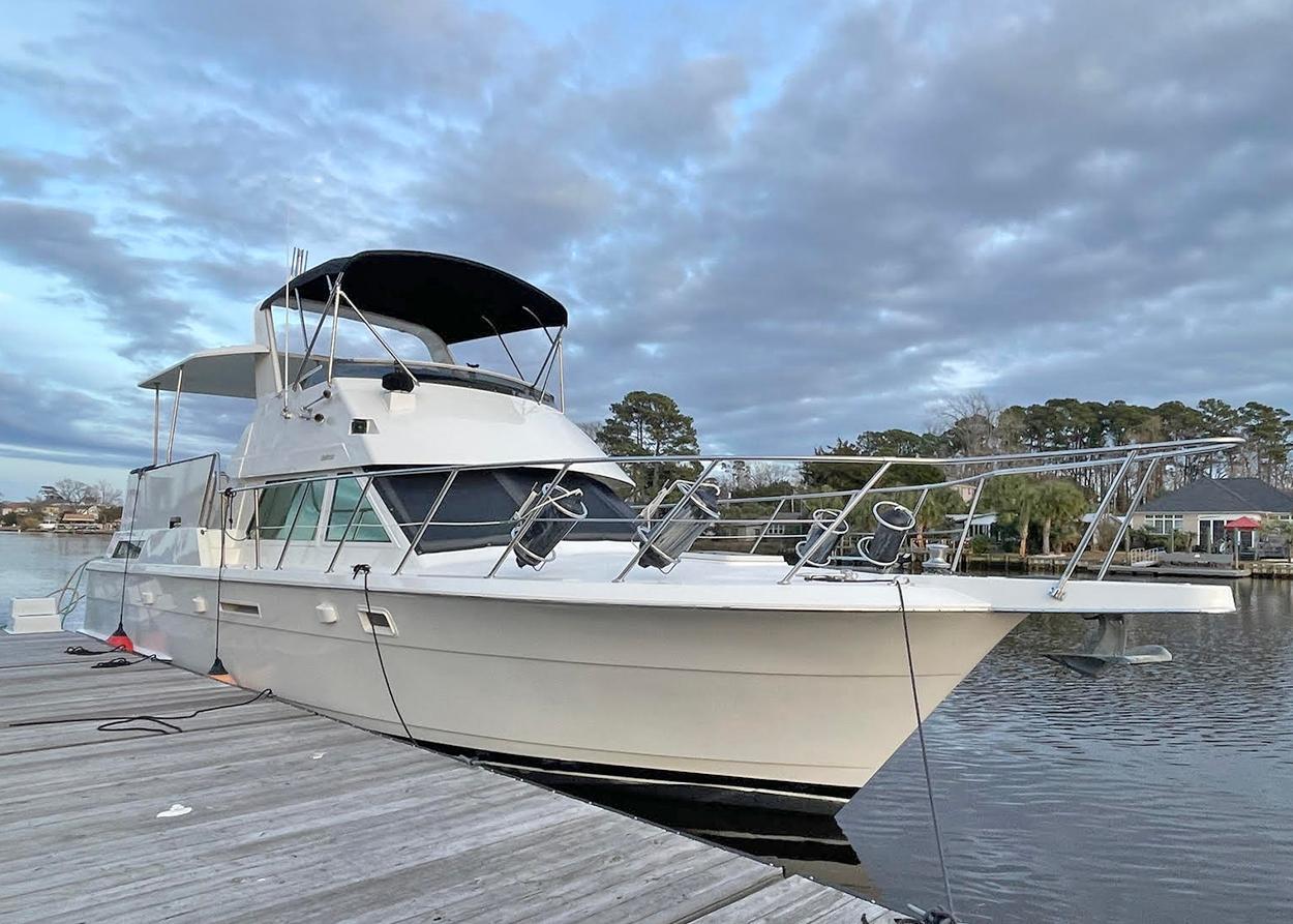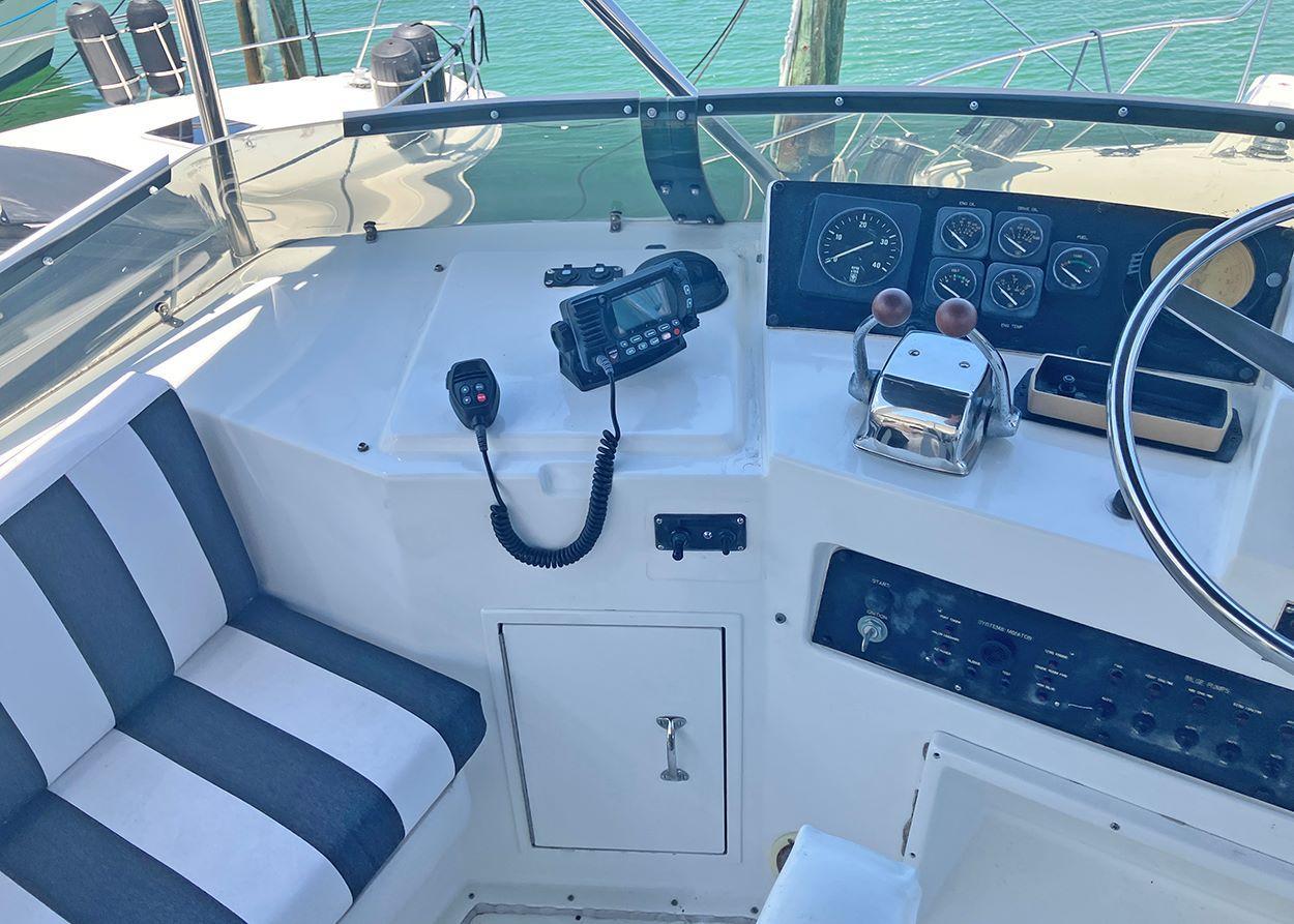 Transferable Liveaboard slip with Resort AmenitiesThree cabins, Two HeadsThis model 42' Hatteras is an aft cockpit motor yacht configuration sitting on top of the famous Hatteras 42' Sportfish hull.The boat is equipped with Caterpiller 3126 engines (425hp each). She can cruise ecomomically at 10 to 12 knots in displacement hull mode or she can get up on a plane and hit 24 knots.The spacious salon has a 42" TV that lifts out of the fold-down table. The owner's suite has a queen bed and ensuite head with separate shower. The forward cabin has a queen bed with head and walk-in shower. The galley is down and flooded with natural light. The sundeck is a great social gathering space and the flybridge has comfortable all-around seating. The lower aft cockpit makes line handling easy and the full width swim platform is accessible thru a tuna door.