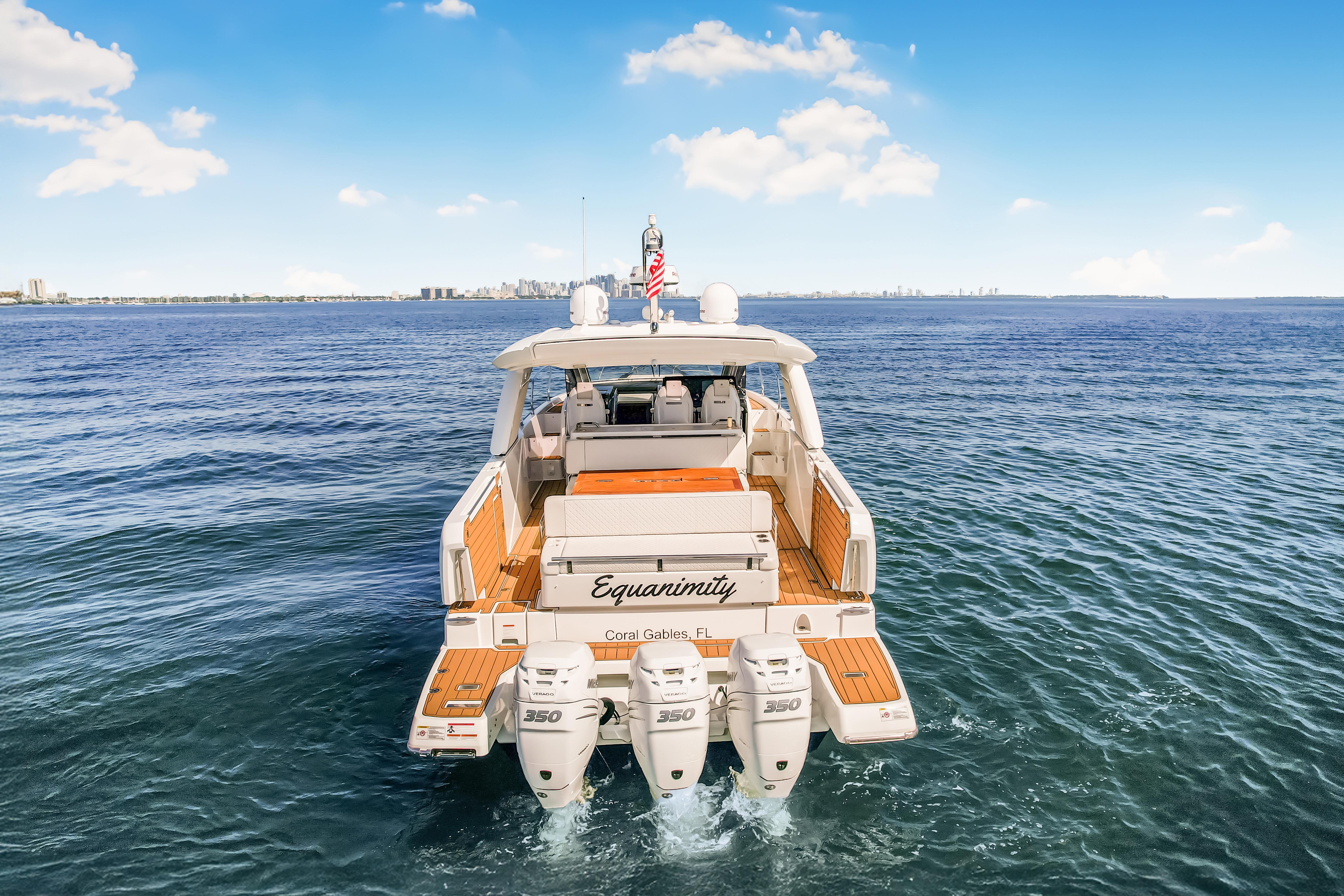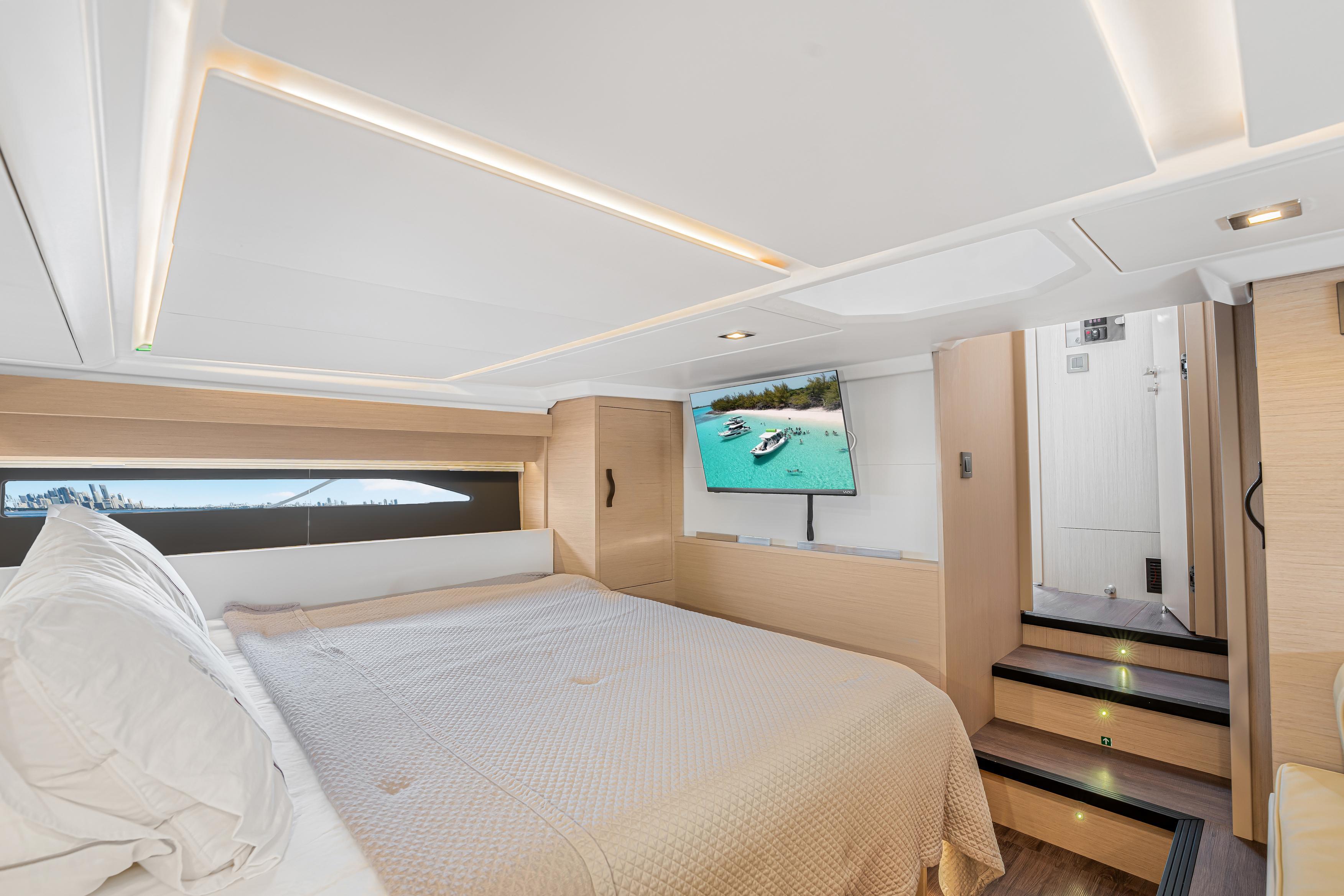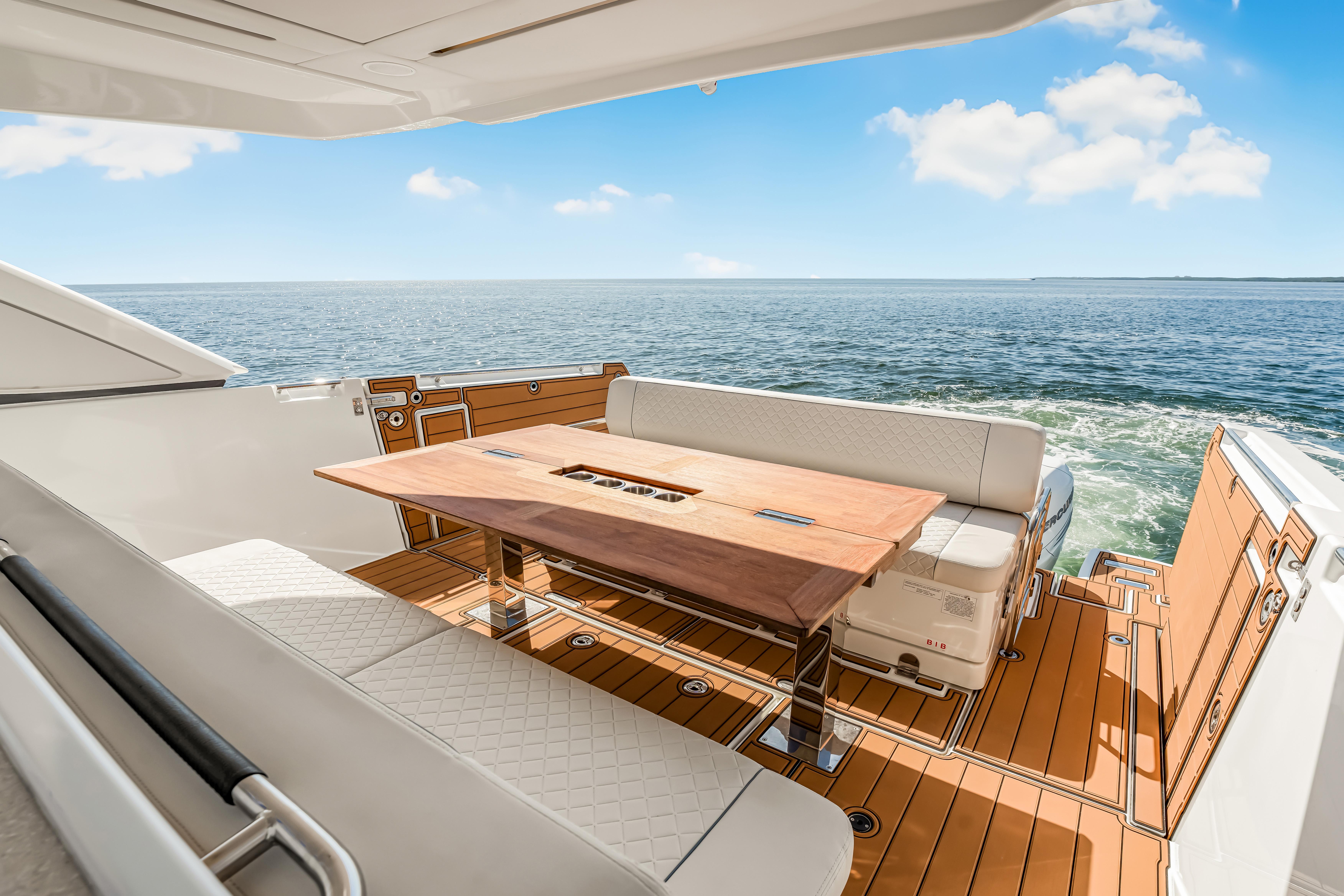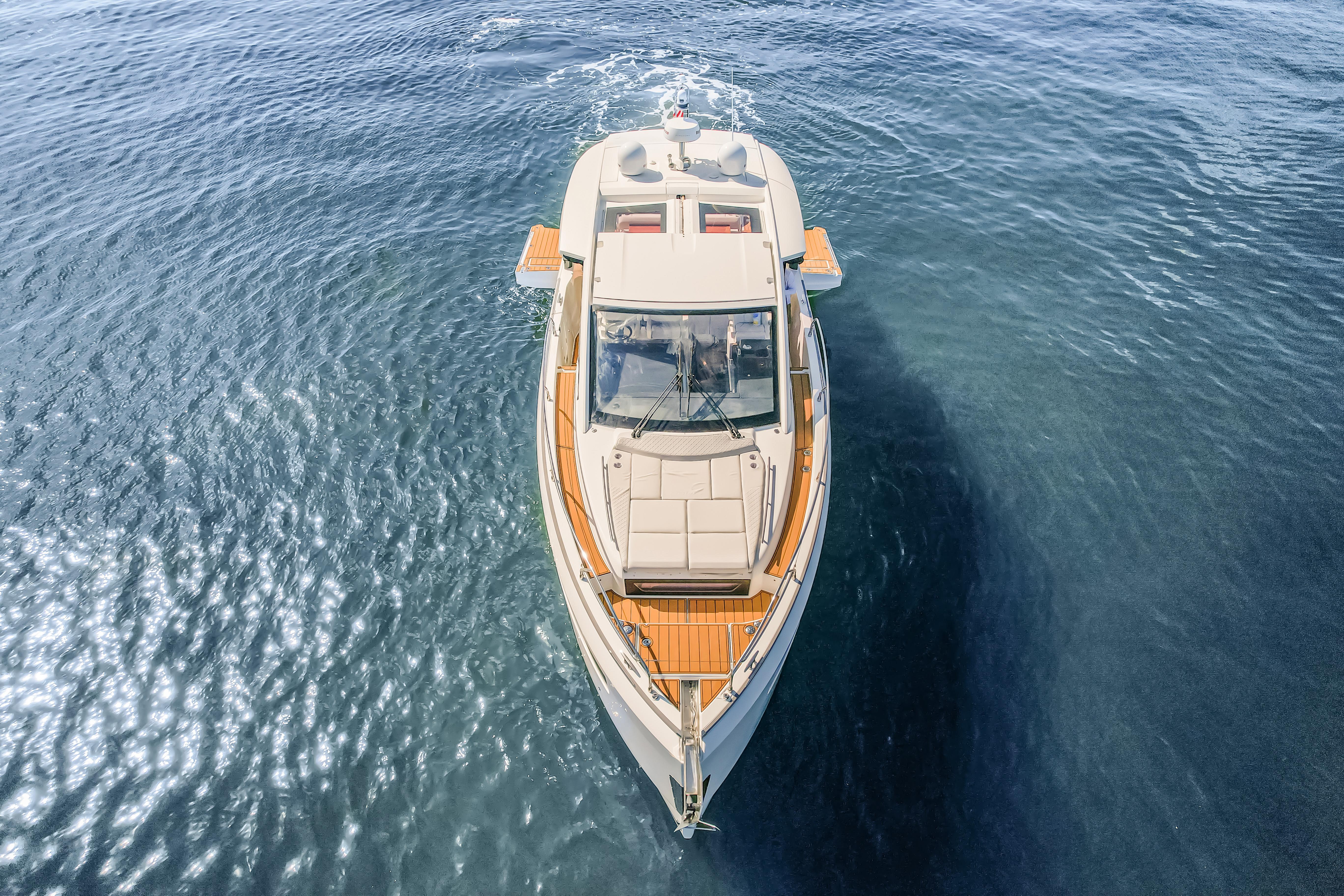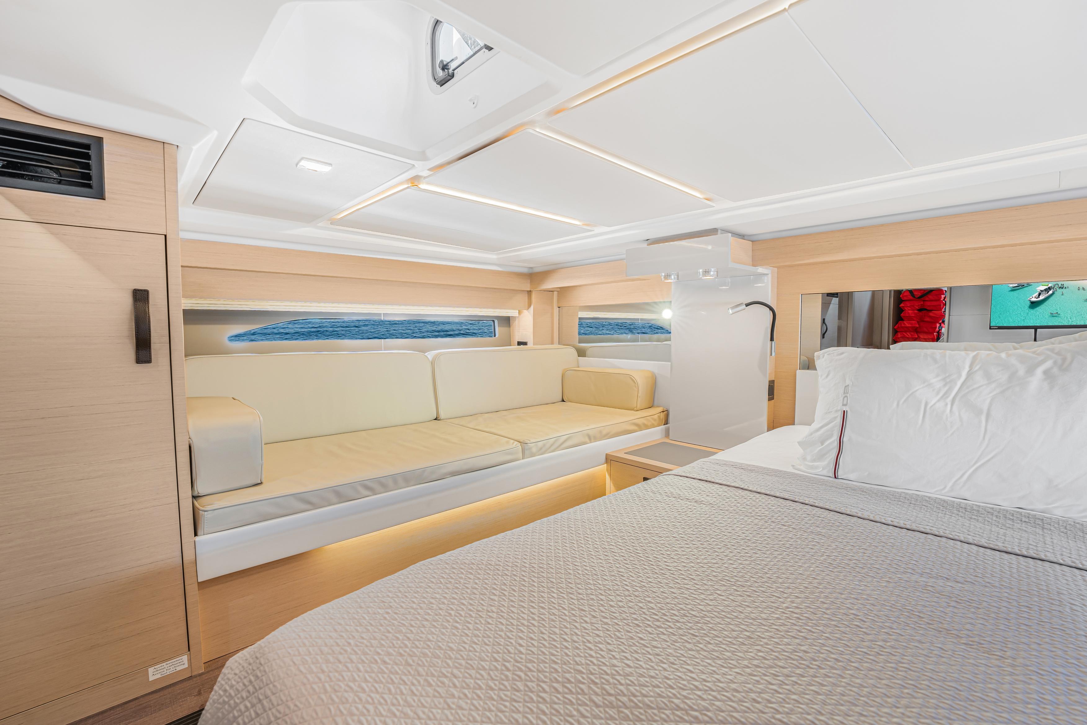 Jeanneau's DB43, A uniquely designed cruiser for the day, the week, or even longer. Jeanneau developed this boat for the experienced yachtsman along with the novice boater. Easily handled by an individual or the family, the DB43 makes all of it a pleasing experience. It is a very sporty and responsive driving experience, with top speeds close to 40 knots. The seakeeping stability is amazing on the DB43, with a hull design by Michael Peters, coupled with the factory installed Sea Keeper adds even more stability. The pleasant and esthetically distinguished profile sets the DB43 apart from many other boats. The Helm has seating for 3, two to starboard at the driving station, 1 to port, with a Retractable Hardtop Separating the Helm from the Cockpit, a Center Island houses, a Refrigerator, Ice maker, Stove Top & Grill, Shelving Storage, Pop Up Accent Lighting, and more, in an Air-conditioned environment. Moving back to the cockpit, you have adjustable Seating Facing Forward for Viewing or Aft to the almost Full Beam Teak Dining Table. Then all the way Aft you have another Forward-Facing Seat for Viewing and Dining. Above the Center Island and Facing Aft is a Drop-Down Television for all of the aft seating to enjoy a movie or a game. Additionally, there are Port and Starboard terraces that open up to expand the entire Aft Cockpit area for swimming or viewing the Sunrise and Sunset with a cup of tea. The Helm and Cockpit areas offer expanded living spaces for everyone on board. On the bow there is Sunbathing for 3 and seating with a table. This area can also be covered with the Sun Tarp for shade. Going Below, there is a small hallway area that leads to the Forward Master with an Island Bed and a Jack & Jill Door to the Head, to Starboard there is the door for the Head and a door to the Aft Stateroom. Also in the hallway is a Microwave, Refrigerator and more Storage Drawers underneath the Stairs. Additionally, all Battery Controls, Generator Controls, Tank Controls are conveniently placed for quick operation. The head houses a Dry Shower, Vanity and Toilet. Entering the Aft Stateroom, to Starboard is a Couch and to Port is a Queen Bed. there is also a cushion that can fill the area in between the two for a much larger sleeping area than a king bed. With the Outboard Power there is Shallow Draft operation coupled to a Joystick at the Helm along with a Bow Thruster. Operationally this boat is a breeze to drive, and dock. Finally, Electrical Power comes from a Diesel-Powered Onan Generator, housed in an ultra-quiet cabinet keeping engine noise whisper quiet