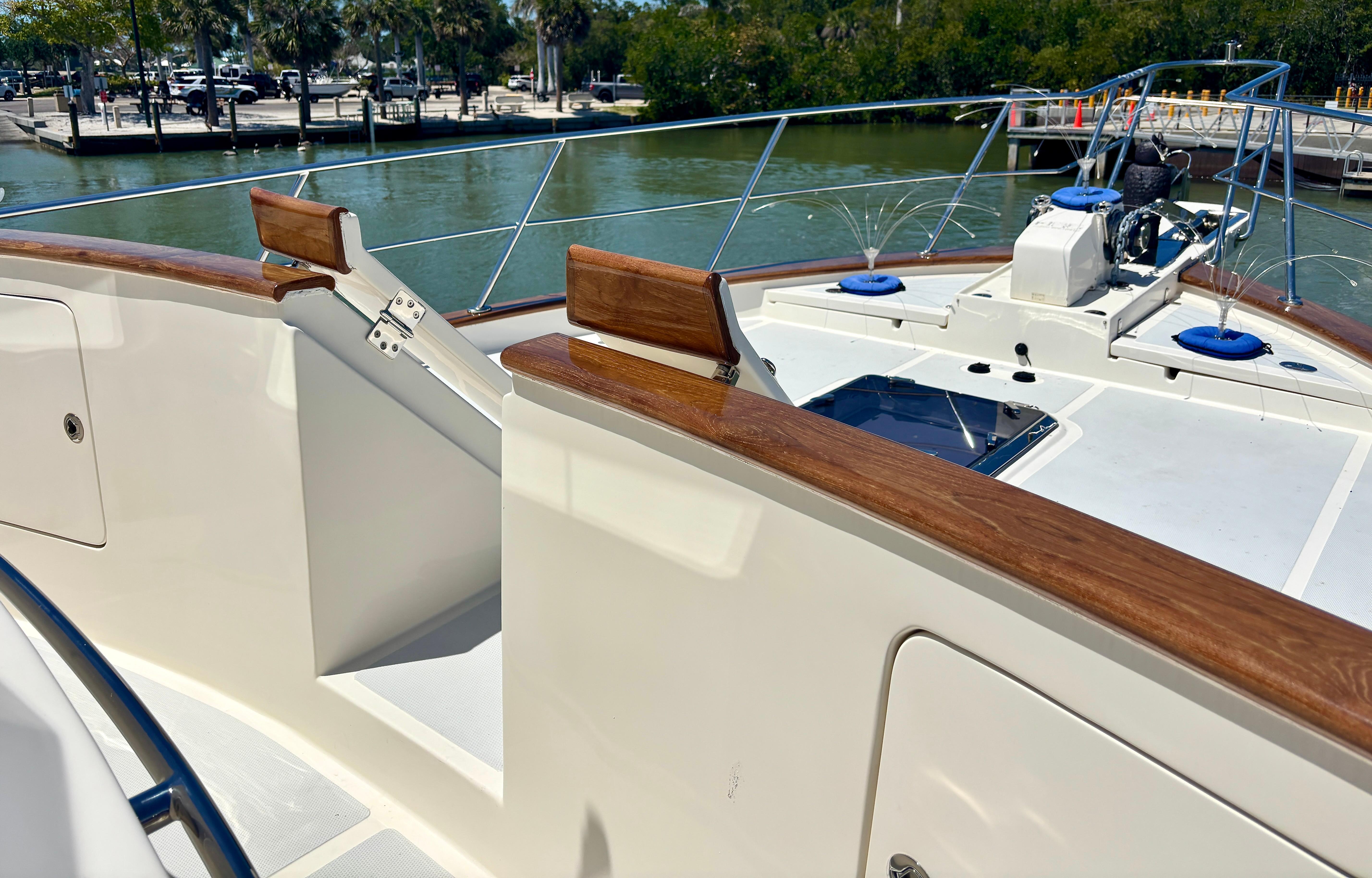 Deck & CockpitYou can board “FOREVER FUN” from the swim platform or from one of the boarding gates on either side of the cockpit. From the swim platform looking forward you can walk up to the cockpit from the steps on port or starboard sides. The tender can be conveniently stored on the hydraulic swim platform making it a breeze to launch.