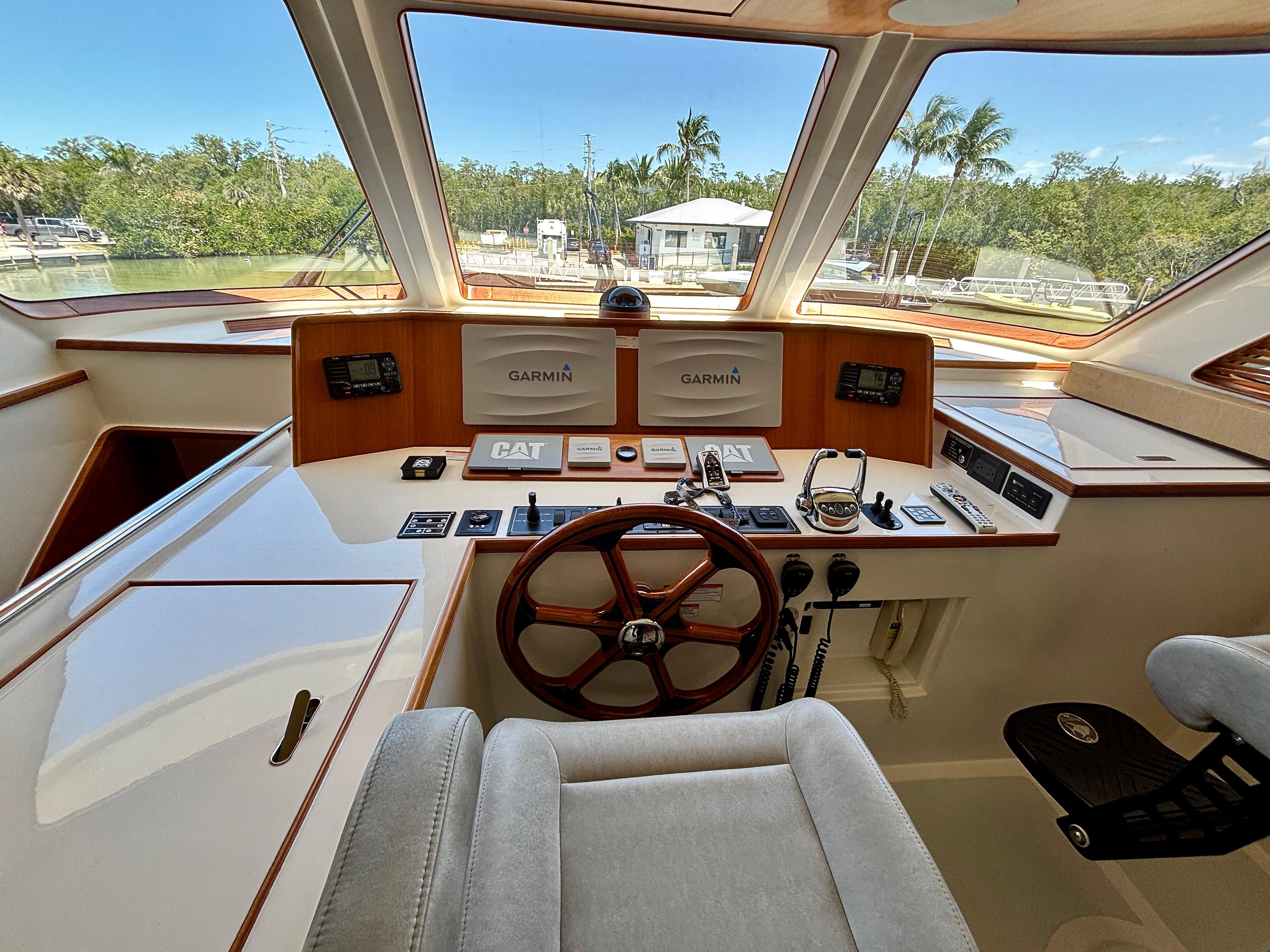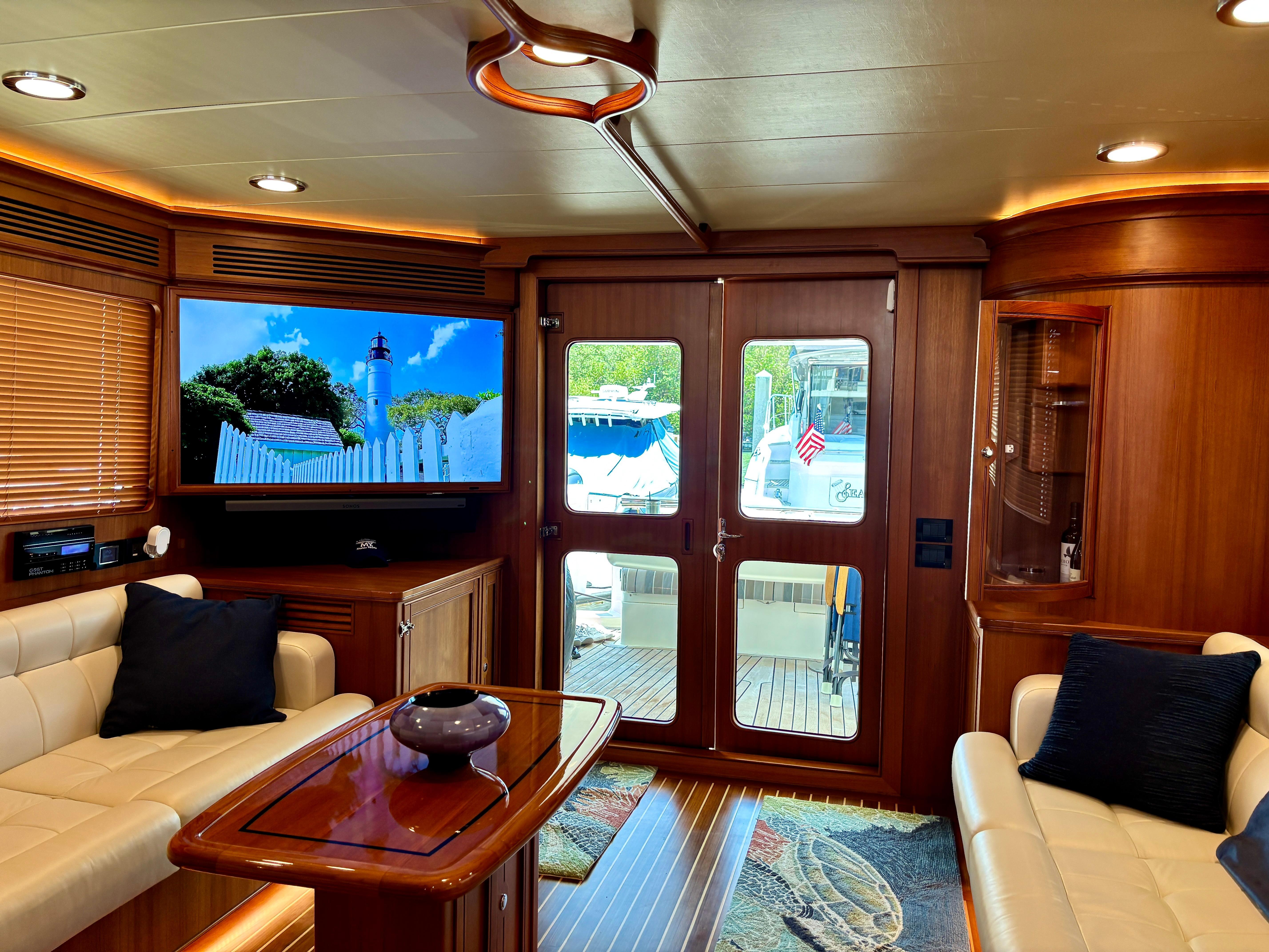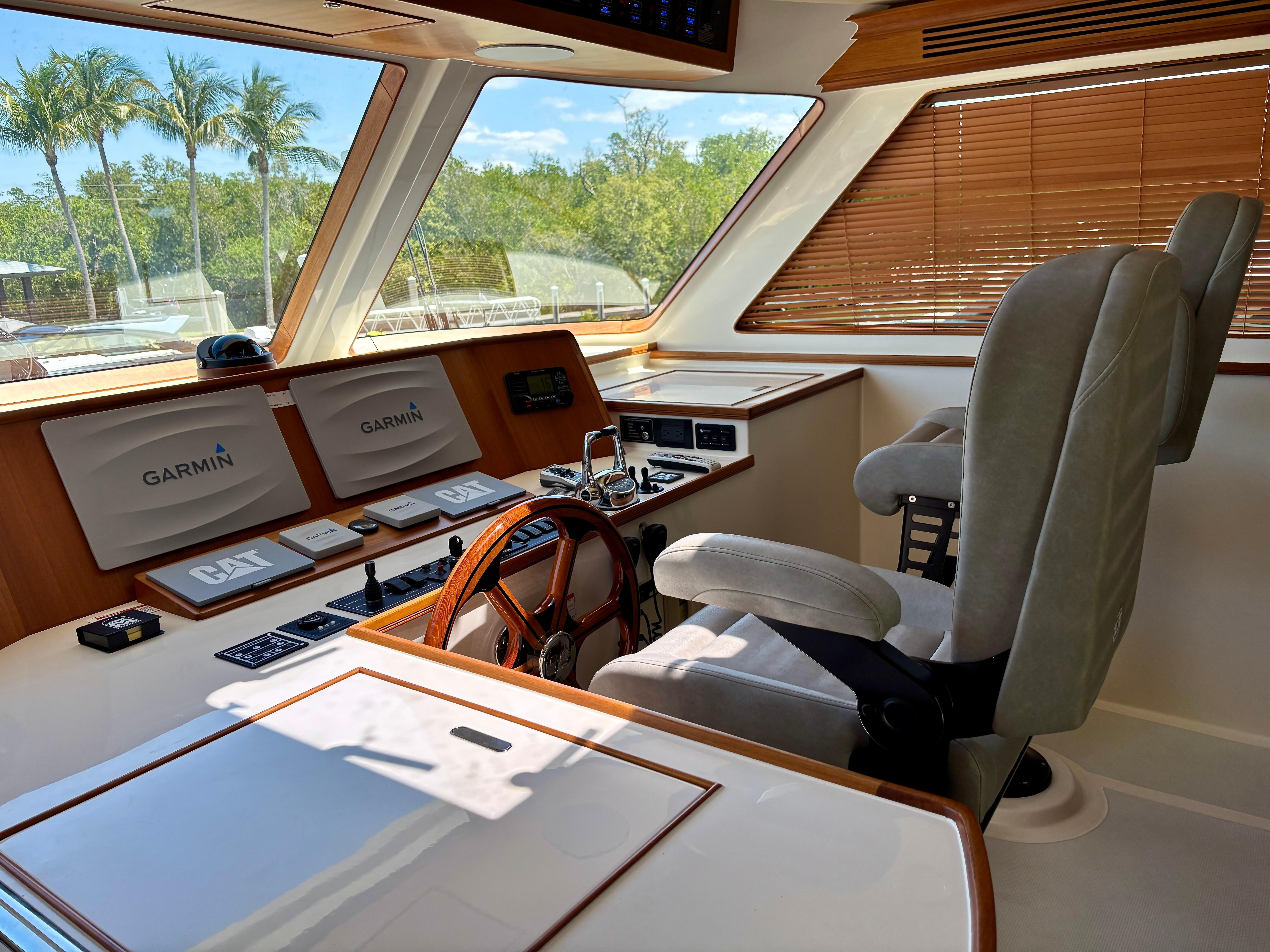 Command BridgeThe fully enclosed Command Bridge on “FOREVER FUN” provides a 360-degree view giving you great sight lines while navigating. Well-appointed with a Garmin electronics package including screens, Autopilot, Yacht Controller, VHF radios, and numerous other systems, she is a dream vessel for any captain. There are 2 Pompanette captains’ chairs mounted at the helm with all navigational equipment at your fingertips. On the port aft corner of the CB you will find a Uline refrigerator/Ice maker combo and storage topped with a beautiful Shittake Caesarstone countertop. To starboard you will find the seating area with a custom teak table with high gloss finish.