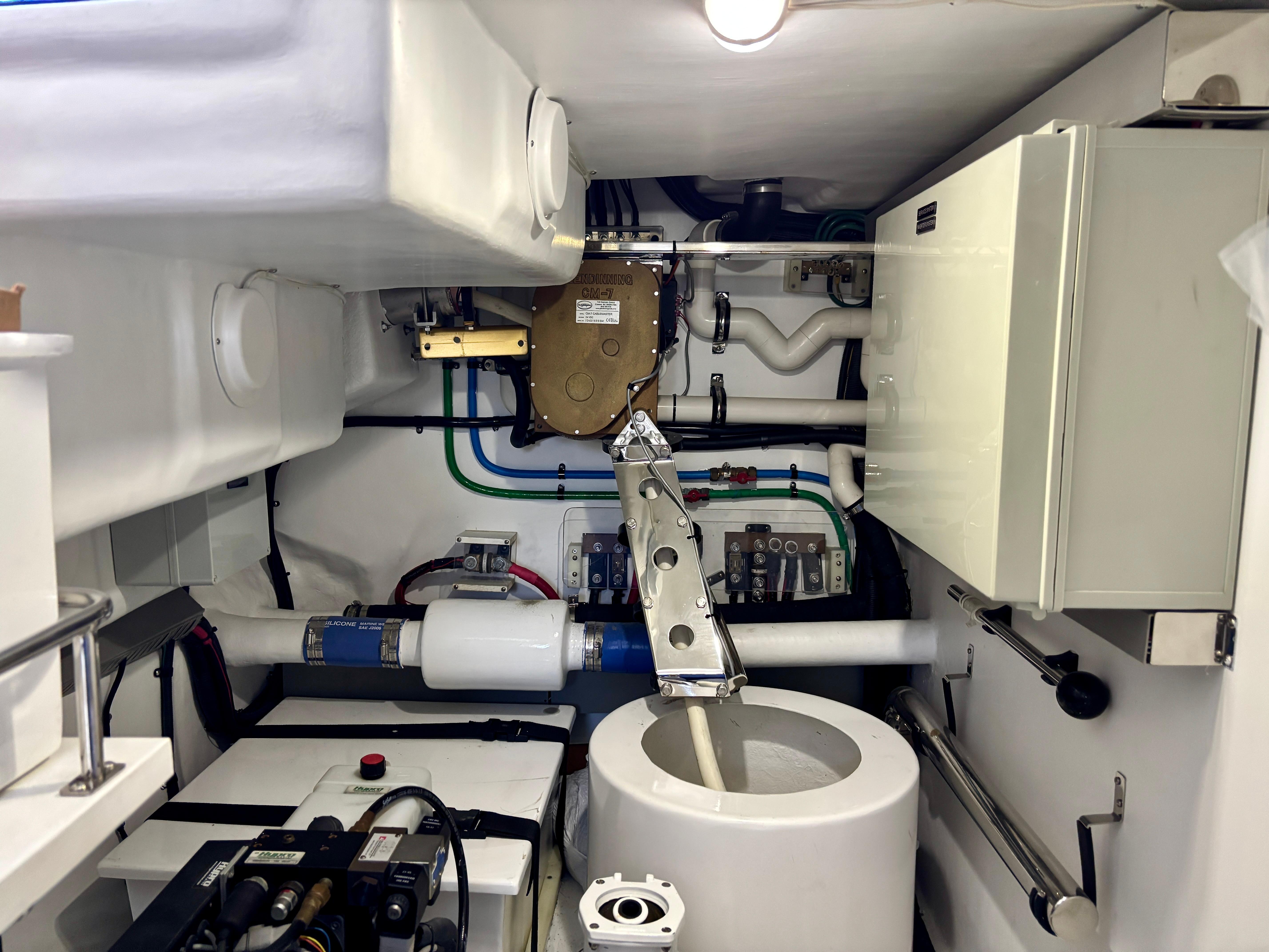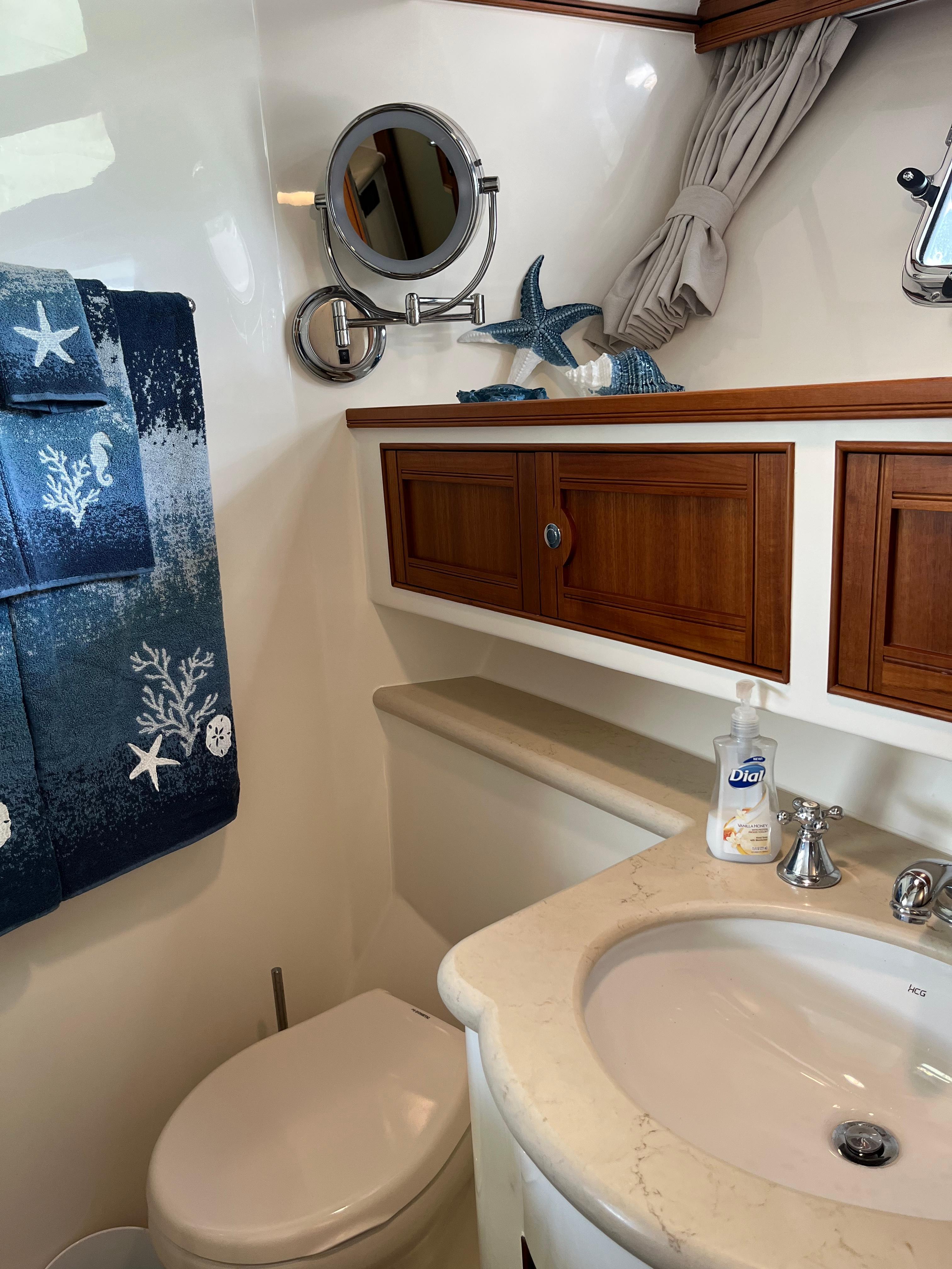 Master StateroomThe master stateroom is full beam with an athwartship king size bed and ensuite head to starboared. The bed has a built in nightstand on either side with additional drawers under the bed. There are two large closets located port aft and forward starboard and a tall chest of drawers located on the starboard aft corner of the room.
