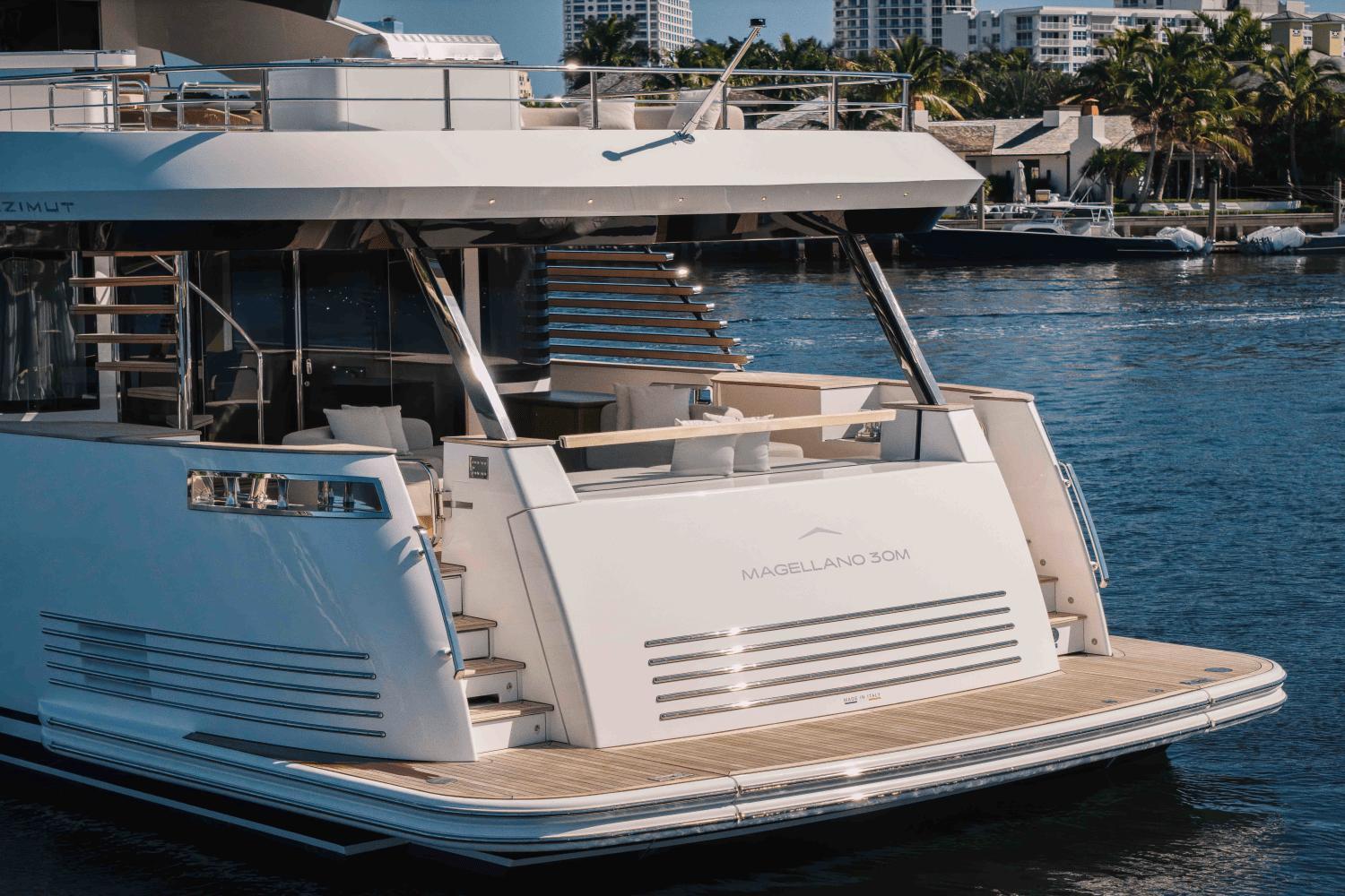 2026 Azimut Magellano 30M – Timeless Elegance Meets Long-Range LuxuryStep aboard the 2026 Azimut Magellano 30M, a masterpiece of Italian craftsmanship that redefines long-range cruising. Designed by Ken Freivokh with naval architecture by PLANA Design, this tri-deck yacht blends classic nautical elegance with contemporary sophistication. The Magellano 30M is engineered for exploration, offering both comfort and autonomy for extended voyages.Powered by twin MAN V12 engines, this yacht delivers smooth and efficient cruising at both displacement and semi-planing speeds, perfect for those who demand performance and range without compromise. Key Features: LOA: 97'5" (29.77m)Beam: 22'3" (6.8m)Engines: Twin MAN V12 – 1,550 HP eachTop Speed: 20 knots | Cruising Speed: 16 knotsRange: Approx. 1,500+ NM at cruising speedFuel Capacity: 3,960 gallonsGuests: 10 in 5 staterooms | Crew: 5 in 3 cabins Interior Excellence: Step into an interior designed by Achille Salvagni, where natural light flows through floor-to-ceiling windows, and each space is curated with hand-finished detailing, premium woods, and sculptural furnishings. The full-beam owner’s suite on the main deck features panoramic views and a lavish en-suite bath. Outdoor Living: Enjoy multiple exterior lounges, a generous beach club, and a fully equipped flybridge with alfresco dining, wet bar, and Jacuzzi. The bow lounge is a tranquil retreat ideal for sunrise moments or sundowners at sea. Technology & Comfort: Equipped with cutting-edge navigation systems, advanced stabilizers for a smooth ride, and eco-conscious features such as low-emission engines and solar-integrated systems, the Magellano 30M is as smart as it is stunning.