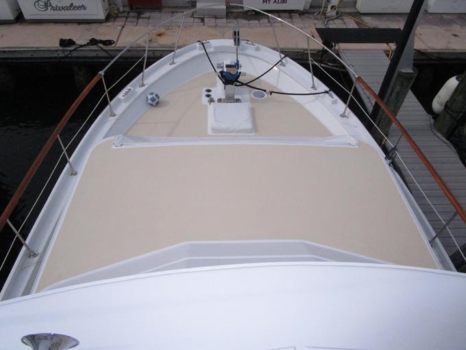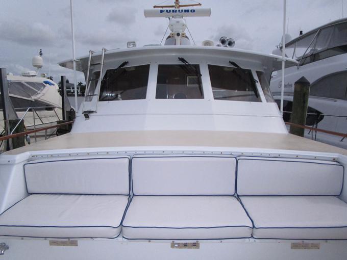 Furthest aft is the aft deck with a three cushion sofa, hi-lo table, two teak chairs and a storage cabinet. The Aft Deck has a new 3-sided enclosure, port and starboard boarding door and a sliding door to the Salon.
