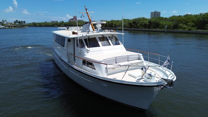 This 56 Voyager model has a Halmatic solid fiberglass semi-displacement hull with the decks and deckhouse built at Matthews of wood with decks and some components having a fiberglass cloth covering.