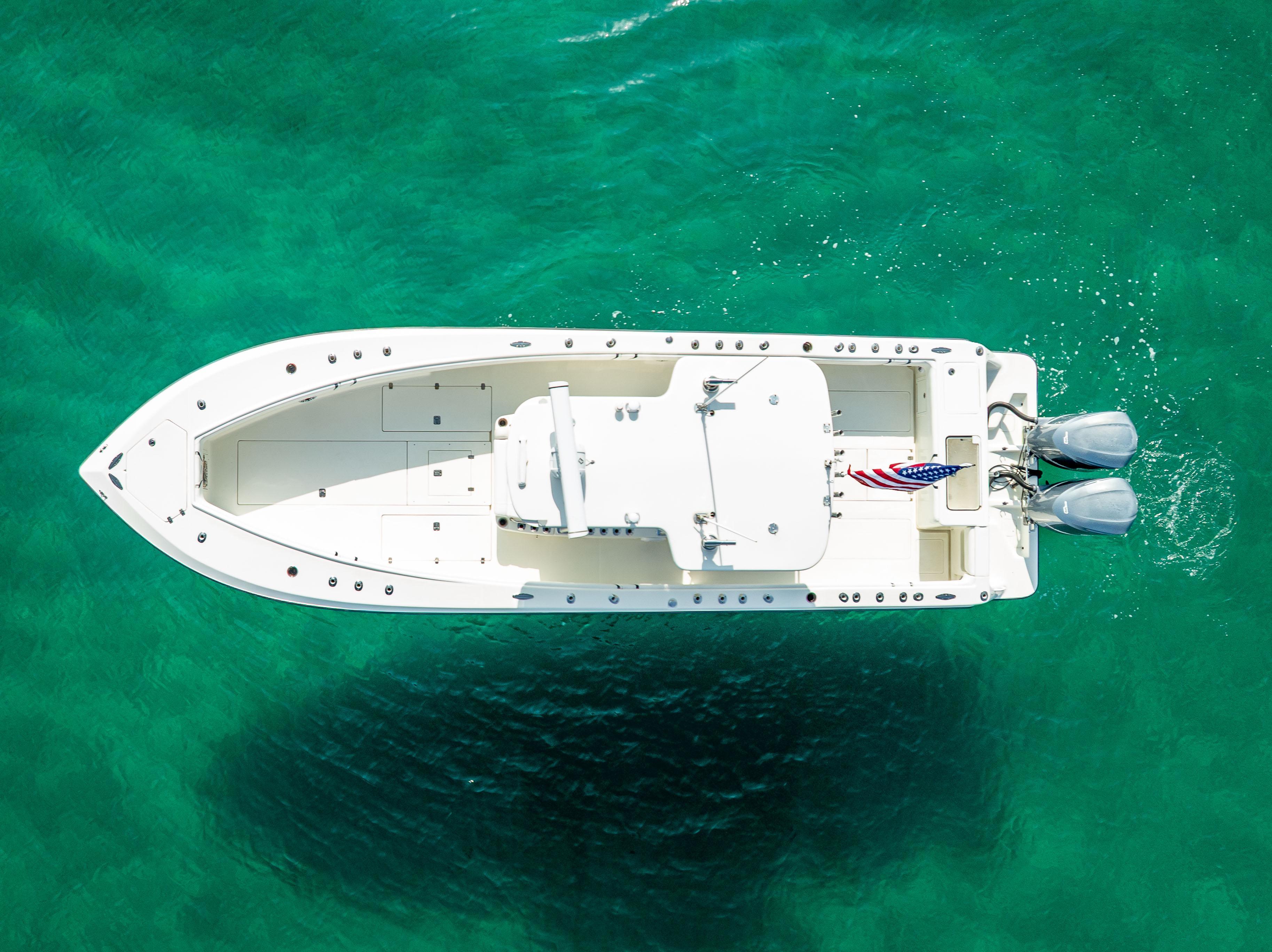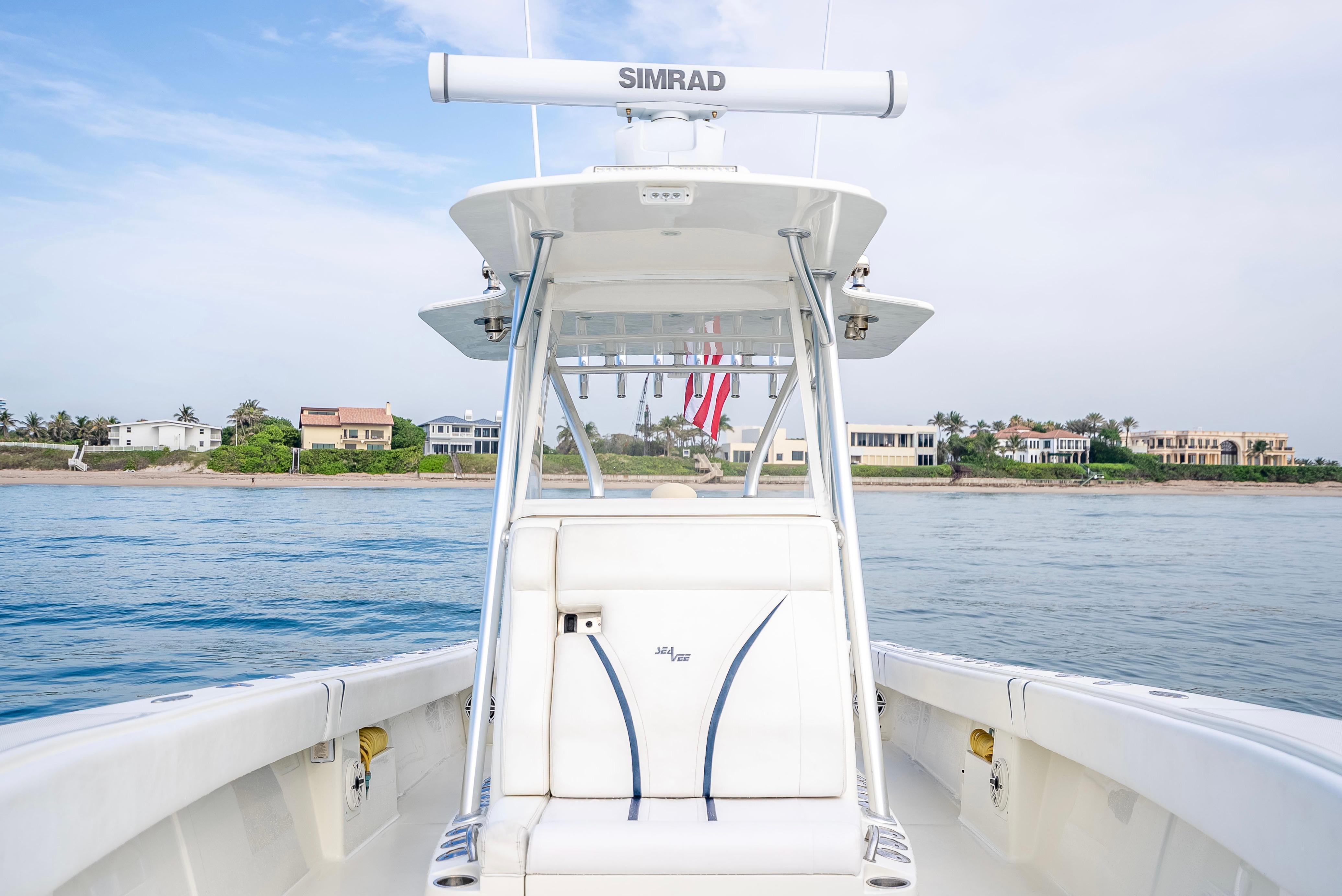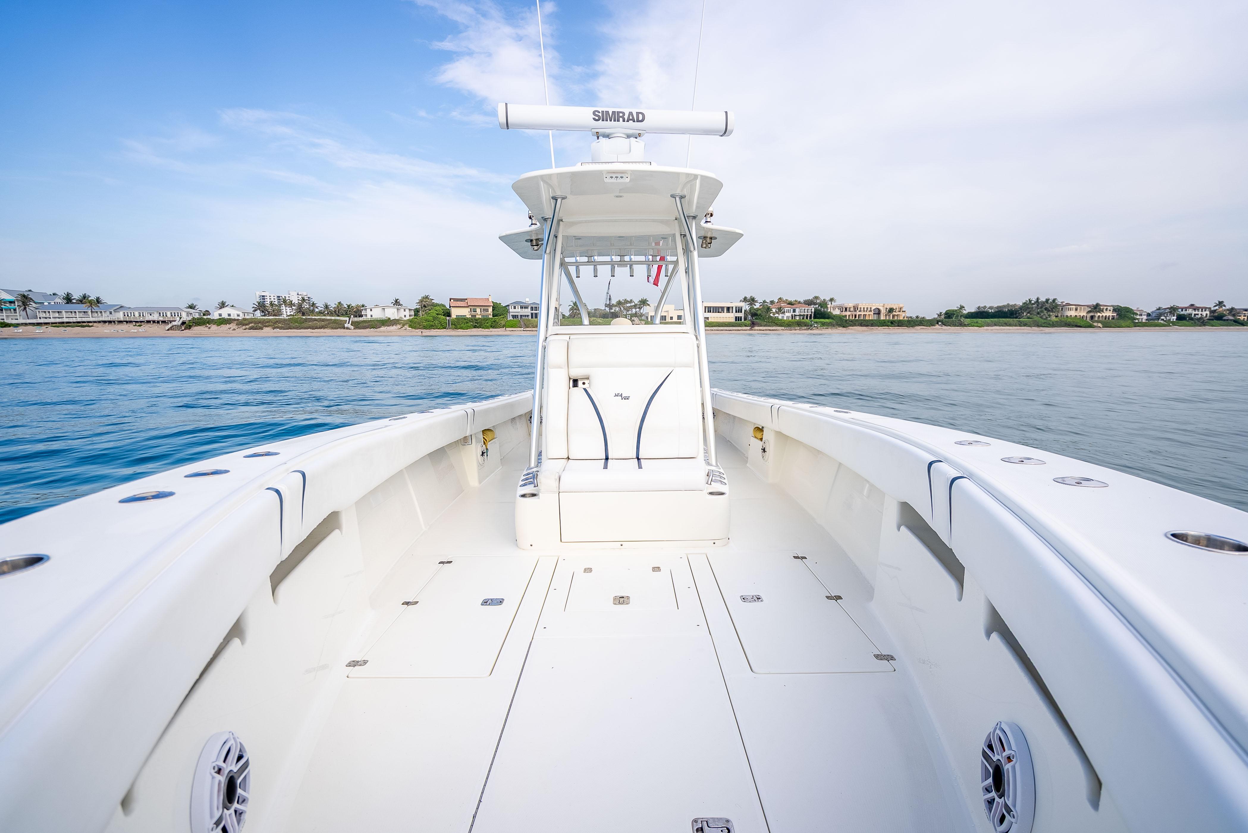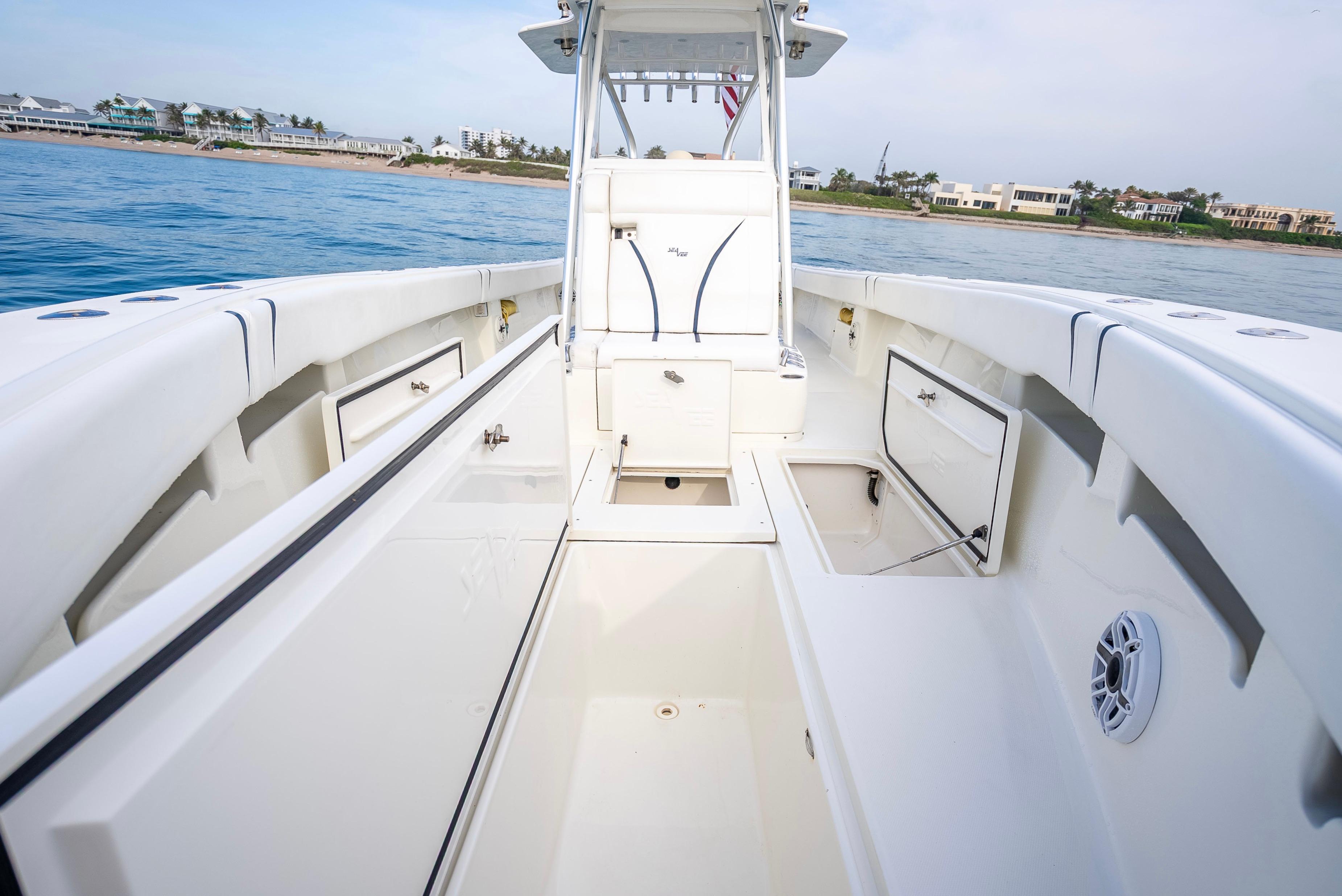 This vessel is undoubtedly a cult classic in the center console market. The SeaVee 340B stands out as one of the most sought-after mid-range center consoles ever constructed, and for excellent reasons. It boasts generous cockpit space, an exceptional live well system (featuring four wells in this specific model), abundant storage inside the console (easily accommodating kites), and a ride that’s truly unparalleled. Let us guide you through its remarkable features. This 2014 SeaVee 340B has a white hull as well as matching white interior. Helm:Dual 16in Simrad NsEvo 3’s in a recessed console box Simrad Control mounted on dash Fusion stereo head unit Yamaha Smart gaugeYamaha push button start Yamaha throttles VHF Radio Trim tab switches Wireless phone charger mounted on dash SeaVee switch panel mounted on lower part of dash High speed compass Stainless steel steering wheel Dual cupholders on dashIsinglass windshields and side panels 8 rod holders down each side of console 2 cup holders on the front of console on each side of forward seat 6 rod holders across the top of hardtop Gemlux outrigger bases Leaning post with built-in tackle station, 5 rod holders, 4 cup holders, aft grab rail Aft pull-out cooler on slide Open ray Simard Radar on hard top 2 VHF antennas Forward facing spreader bar Anchor lightConsole interior: Sliding console door Sink SeaVee breaker board Windows on each side of console Full electronic access Live wells and pumps: 4 pump best marine pump box. Large in deck aft live well (90 gallons) Large forward in deck live well (53 gallons) Transom live well 80 gallons Additional transom live well 25 gallons Stereo System: 12 JL Audio speakers JL Audio amplifier Fusion stereo head unit Storage: Forward Fish box Port and Starboard forward storage compartments (doubles as rod locker) Built in rope and washdown hose storage Engines: Twin 2014 Yamaha 350’s with 725 hours