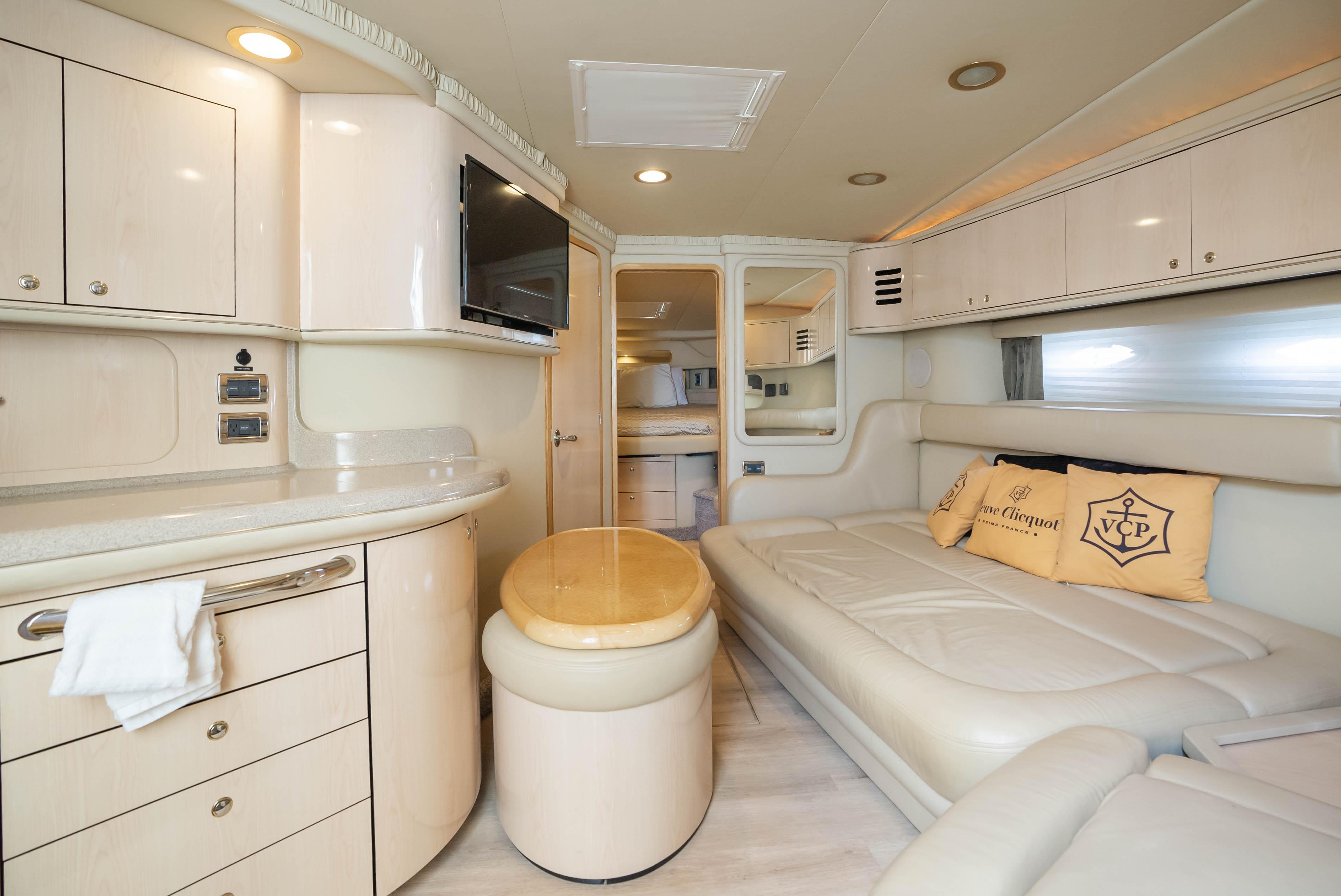 - Expansive cockpit with comfortable seating and a wet bar.
