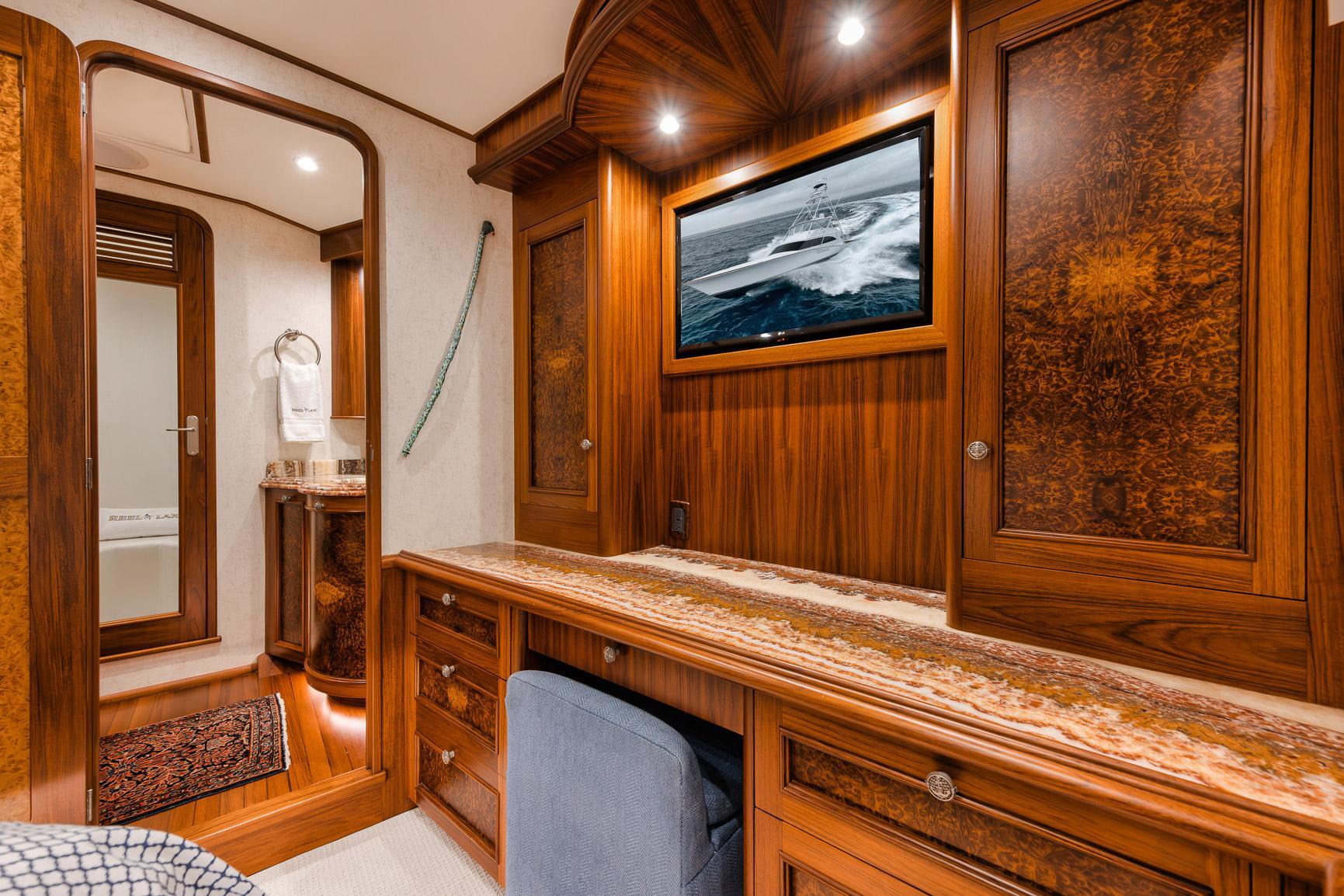 As you enter the salon you will immediately recognize the sophistication of craftsmanship and attention to detail that sets this boat apart from others. The salon on board is very spacious and comfortably laid out. There is an L-shaped sofa to port, with a custom teak hi/lo table that is great for dining. A well equipped entertainment center with a 55’ pop up TV will keep all on board entertained. Two comfortable custom teak bar stools complement the countertop that also doubles as a bar. The dinette is very roomy with a gorgeous teak table that is great for enjoying a meal or even a workspace.