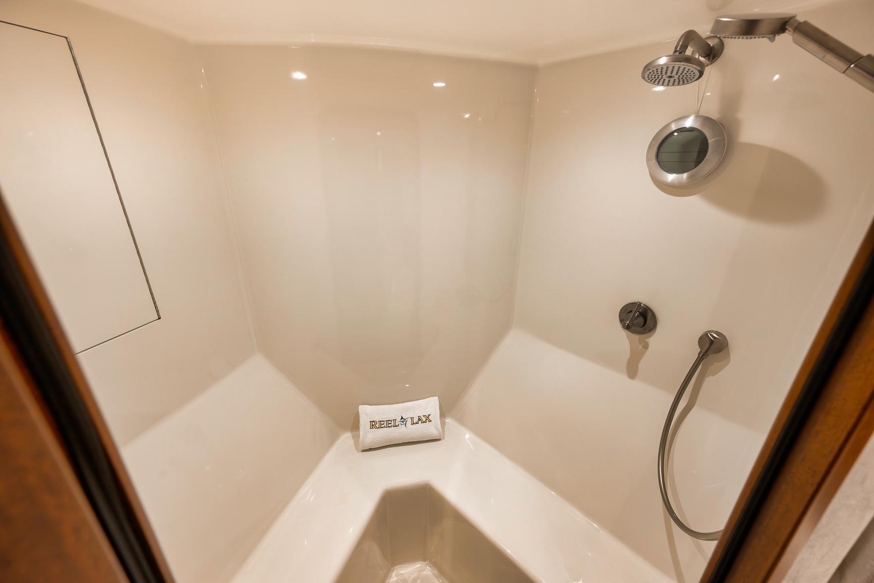 Forward, there’s a single-berth stateroom equipped with a Pullman and built-in rod storage—ideal for longer stays or gear-heavy trips. Furthest forward lies the expansive and luxurious master stateroom, complete with a full queen berth, abundant hanging locker space, and a marble-topped vanity that doubles as a workspace. The en suite master head is equally refined, featuring a spacious walk-in shower and upscale finishes throughout.