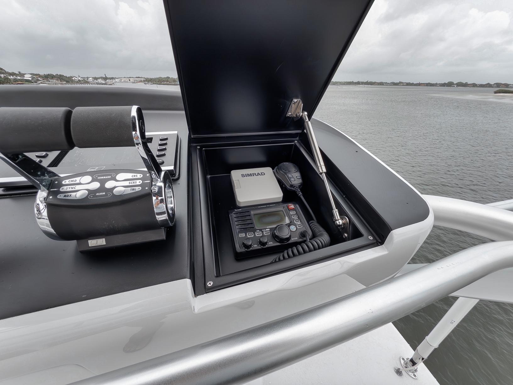 Seamlessly integrated into the tower and flybridge layout, the hardtop offers essential protection from the elements while maintaining the yacht’s streamlined, sporty profile.