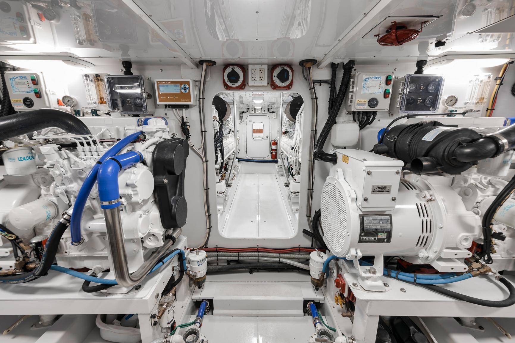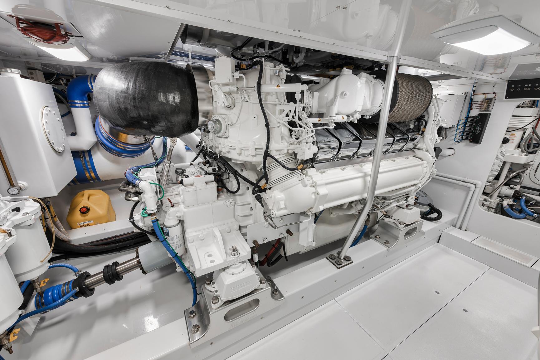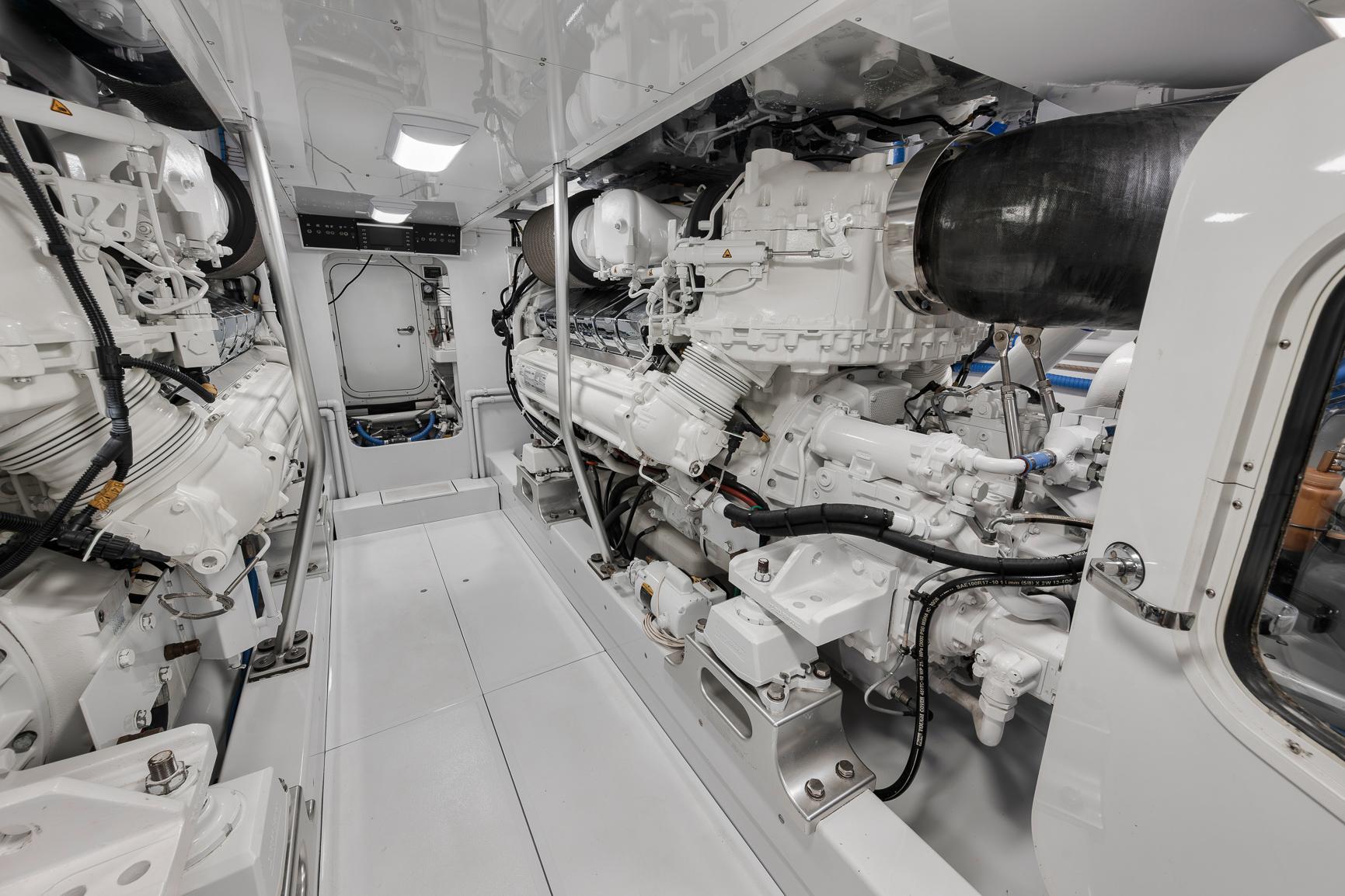 The engine room of the 71’ Jim Smith is a testament to the builder’s commitment to performance, accessibility, and meticulous craftsmanship. Immaculately finished with high-gloss white surfaces and excellent lighting, the space is both visually impressive and highly functional—designed with ease of maintenance and reliability in mind.