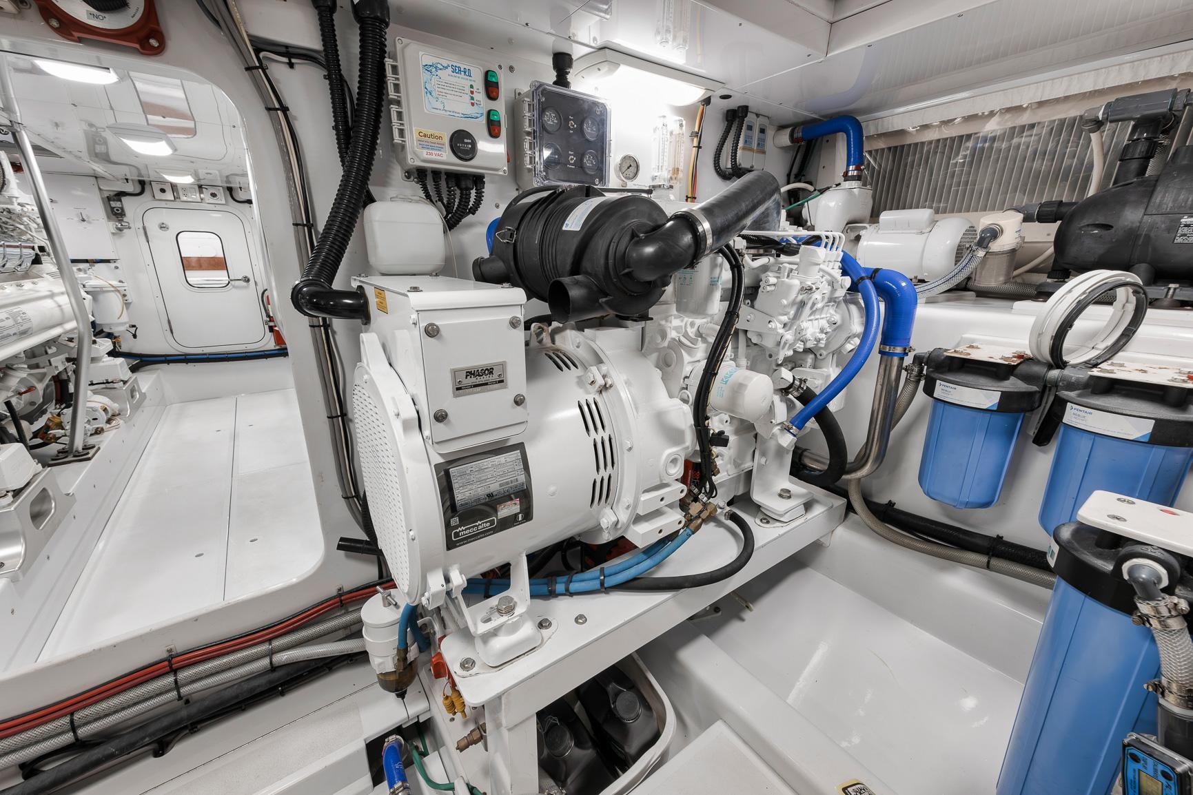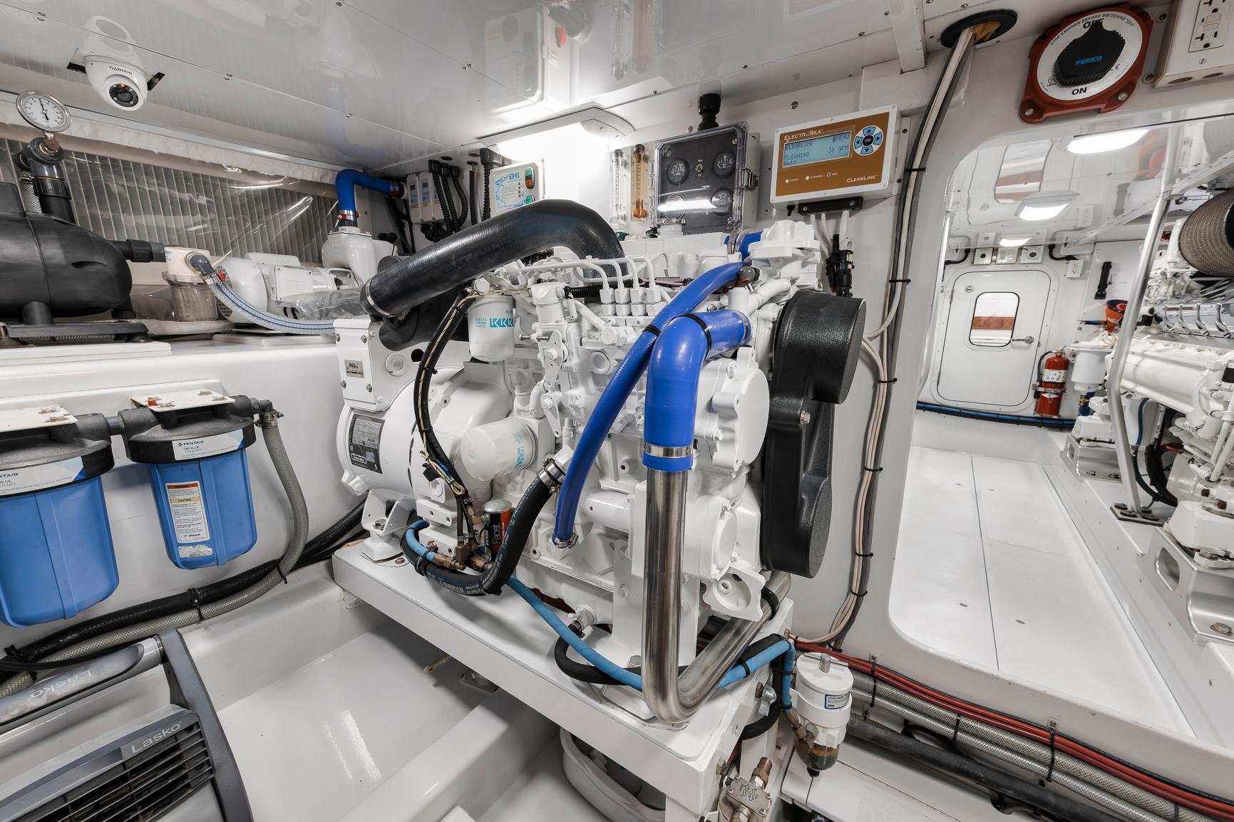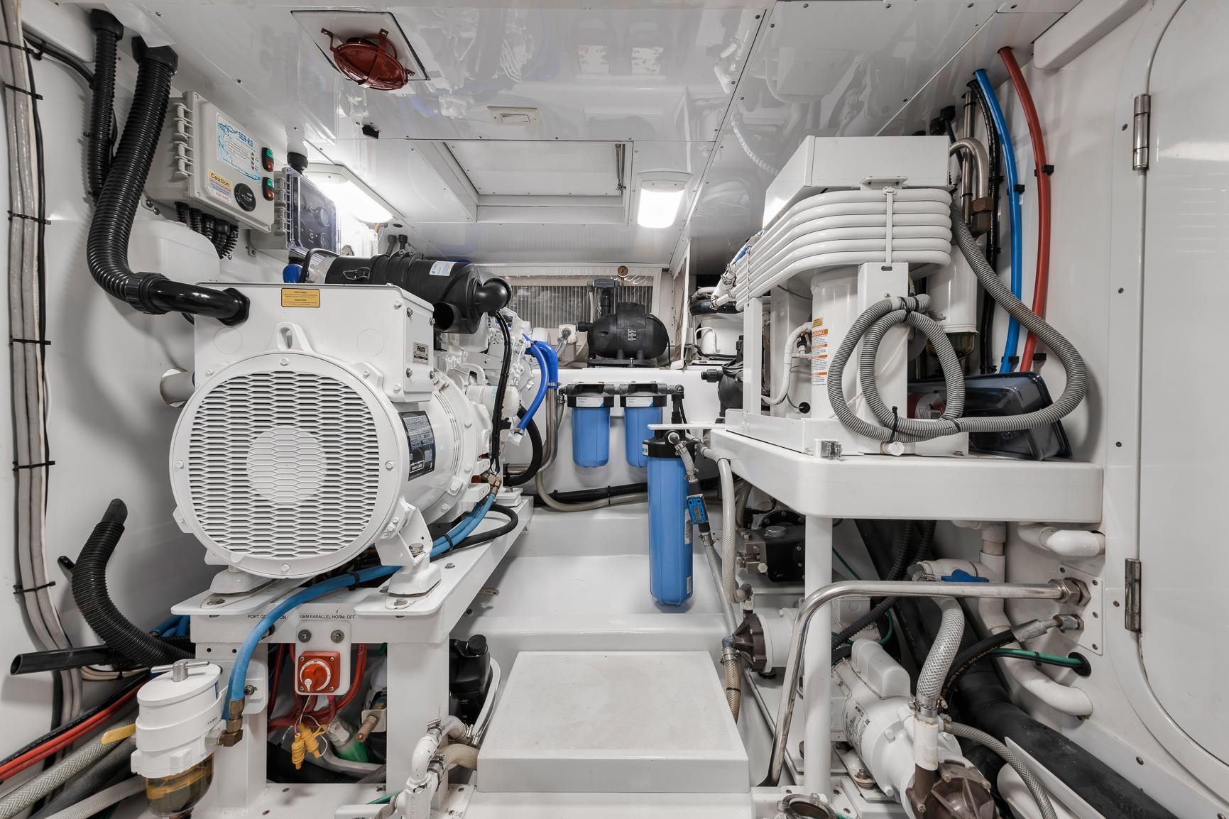 The engine room of the 71’ Jim Smith is a testament to the builder’s commitment to performance, accessibility, and meticulous craftsmanship. Immaculately finished with high-gloss white surfaces and excellent lighting, the space is both visually impressive and highly functional—designed with ease of maintenance and reliability in mind.