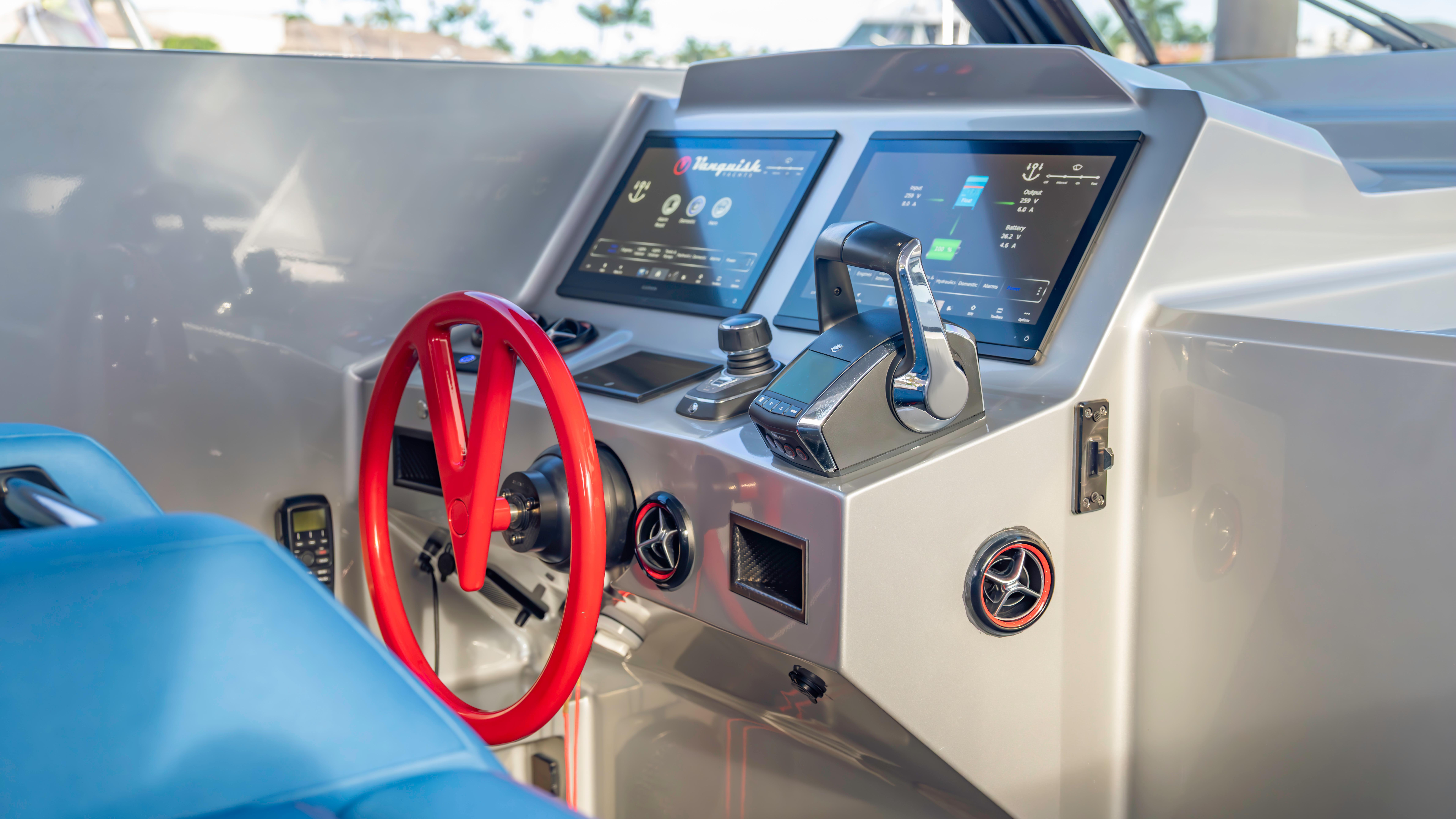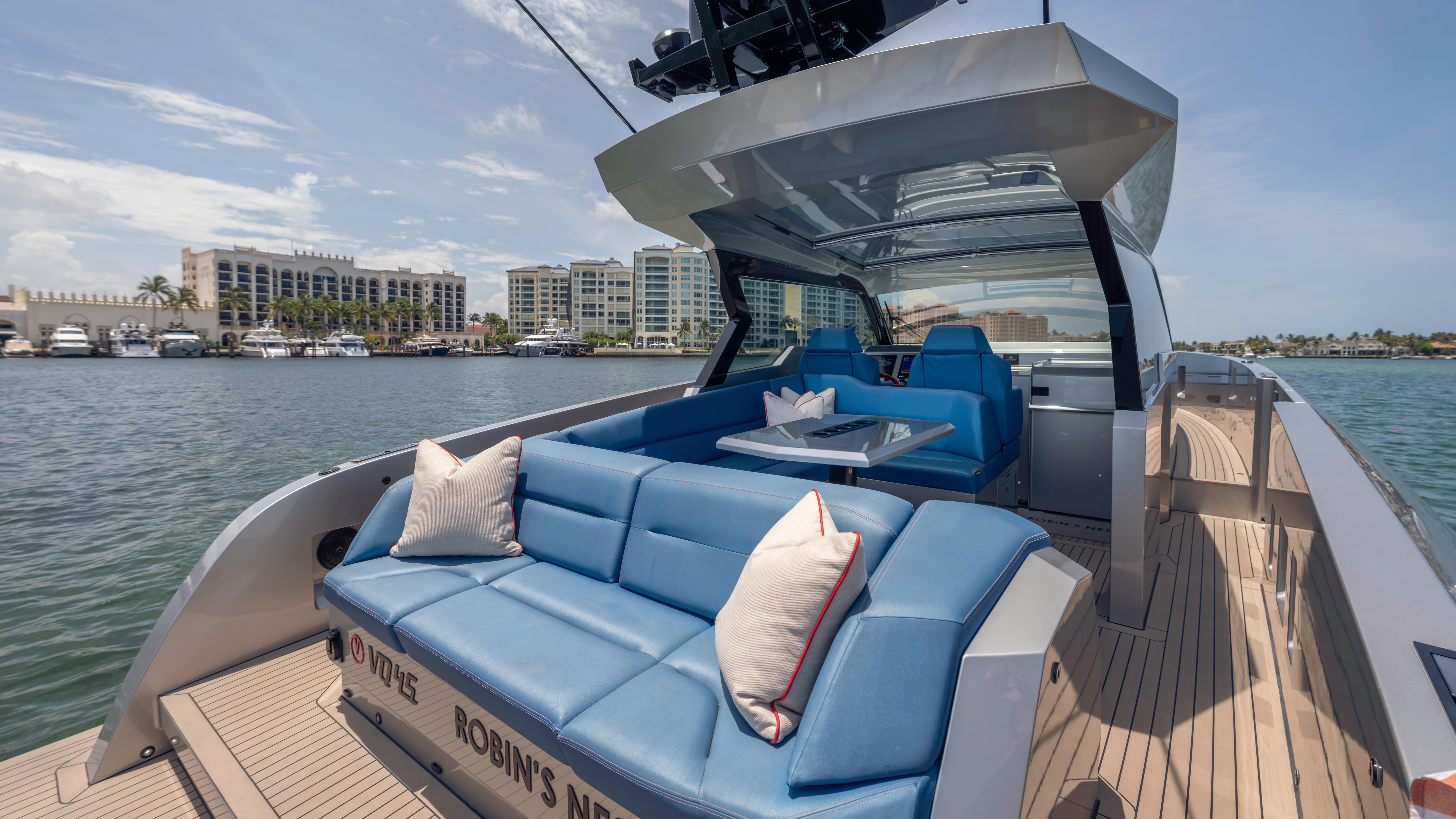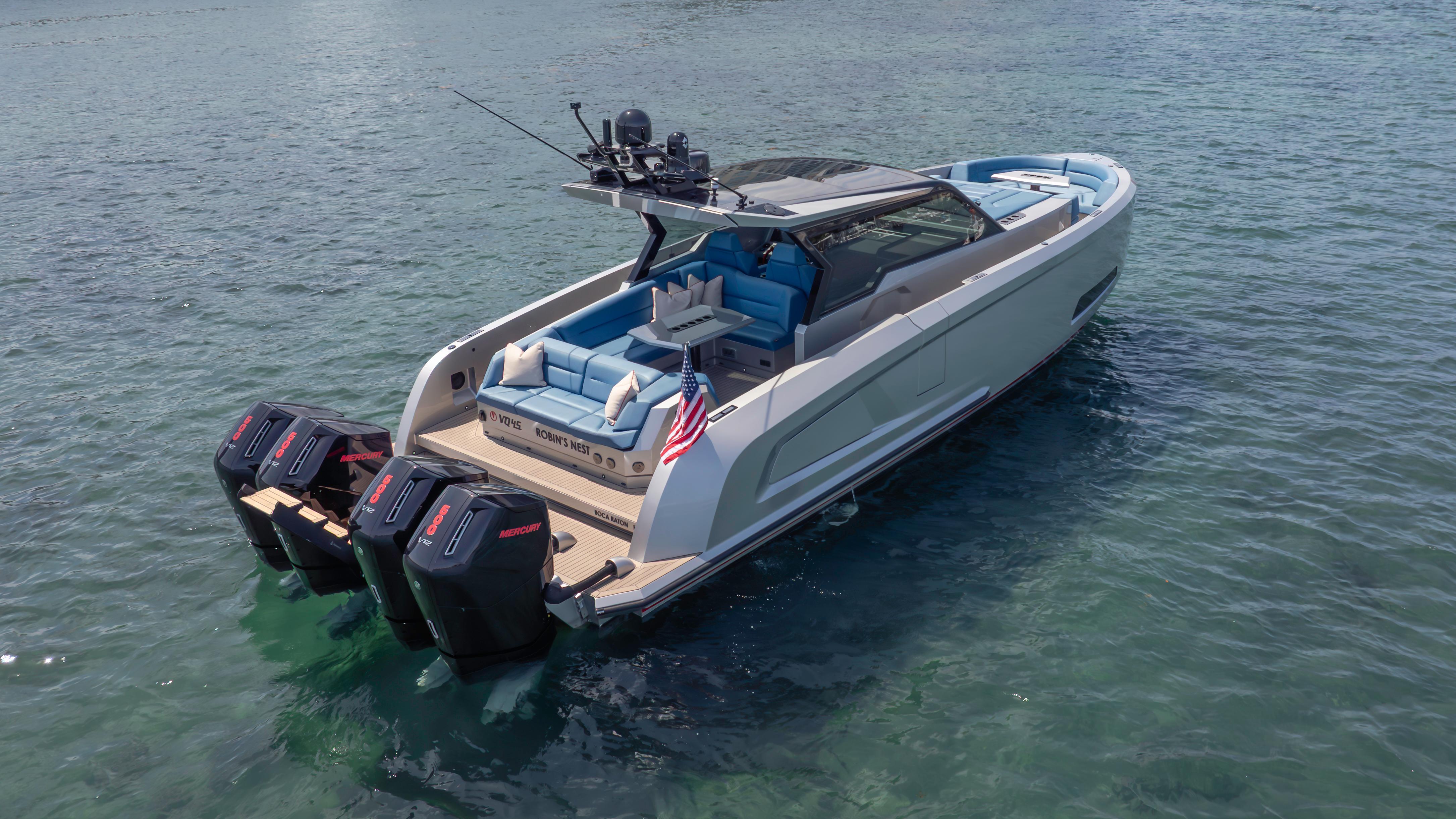2023 Vanquish VQ45 Veloce Hardtop!The Vanquish Yachts VQ45 2023 ROBIN'S NEST is a striking fusion of power, luxury, and cutting-edge design. Available through us in Boca Raton, Florida, this custom, all-aluminum yacht is built for those who demand the best in speed, comfort, and style. With a sleek metallic gray hull, a red boot stripe, and bold blue upholstery, she is as visually captivating as she is thrilling to command.Power Steering System Seakeeper 6 Gyro Stabilizer Hardtop with Grey Glass 4 X 600 Mercury Outboard EnginesSkyhookSide Boarding DoorUnmatched Performance & Agility: As one of the finest high-performance speed boats, she is powered by quad Mercury Verado 600 HP V12 outboard engines, delivering exhilarating acceleration, precision handling, and an unmatched on-water experience.A Luxurious Center Console Experience: Designed for those who appreciate both form and function, she stands among the top luxury center console yachts. Her premium Dutch craftsmanship, open deck layout, and first-class finishes create an atmosphere of refined sophistication.The Ultimate Entertainment Yacht: Built for socializing and relaxation, she is one of the best luxury entertainment boats available. Expansive seating, a hardtop for shade, and cutting-edge sound and lighting systems make her the perfect yacht for hosting unforgettable gatherings.The Vanquish Yachts VQ45 2023 ROBIN'S NEST is turn-key and ready for her next owner. Contact us to discover this VQ45 in Boca Raton, Florida.