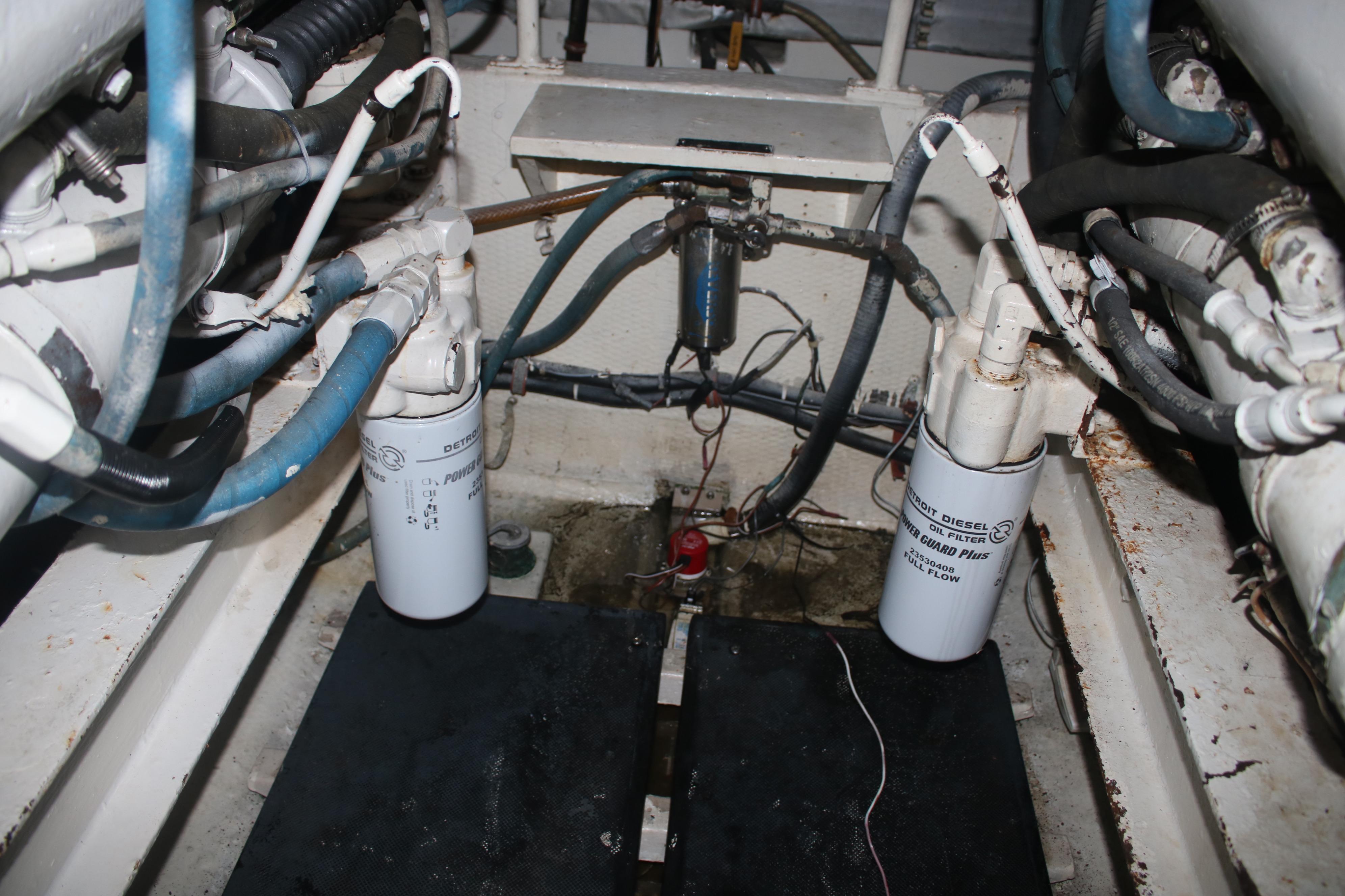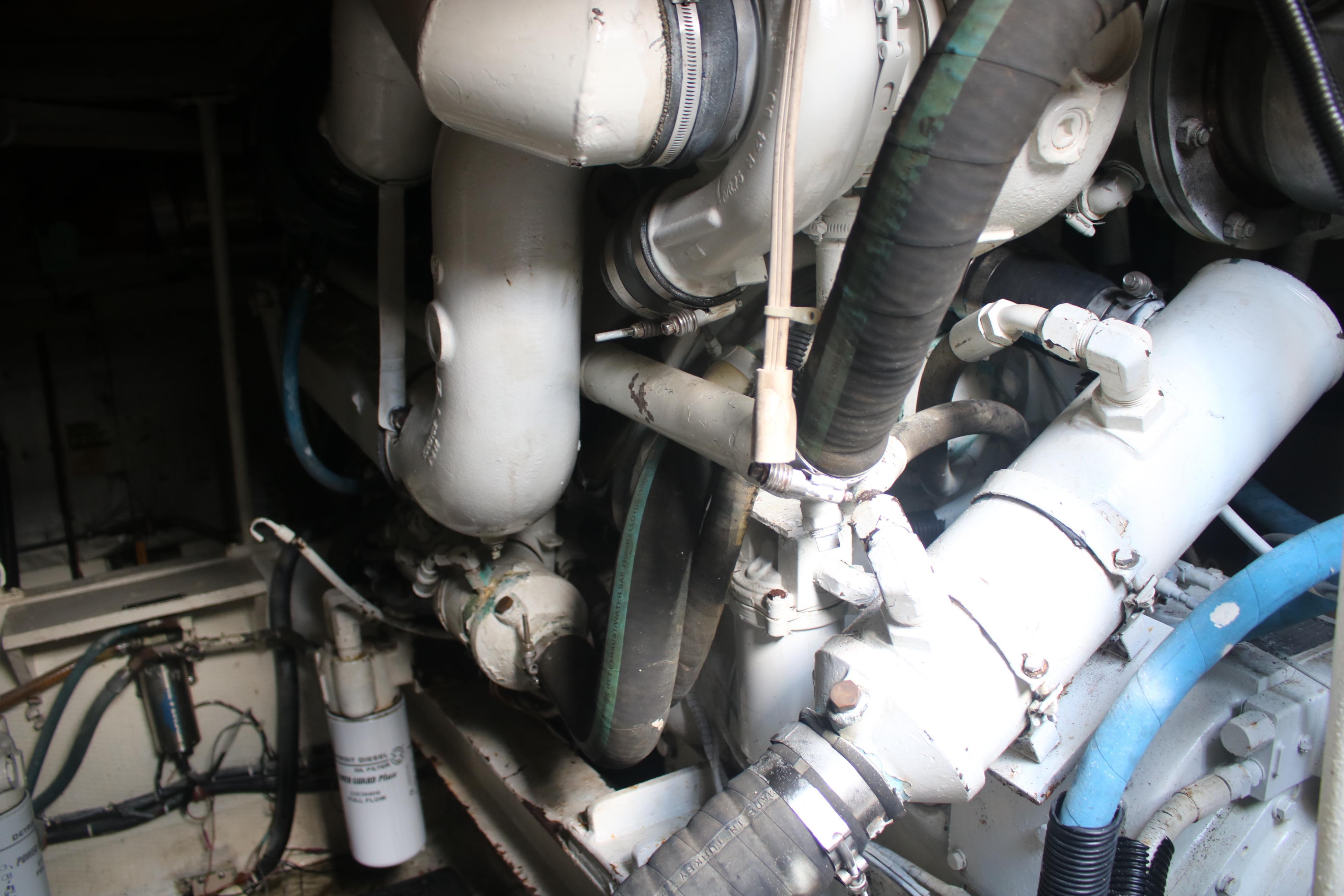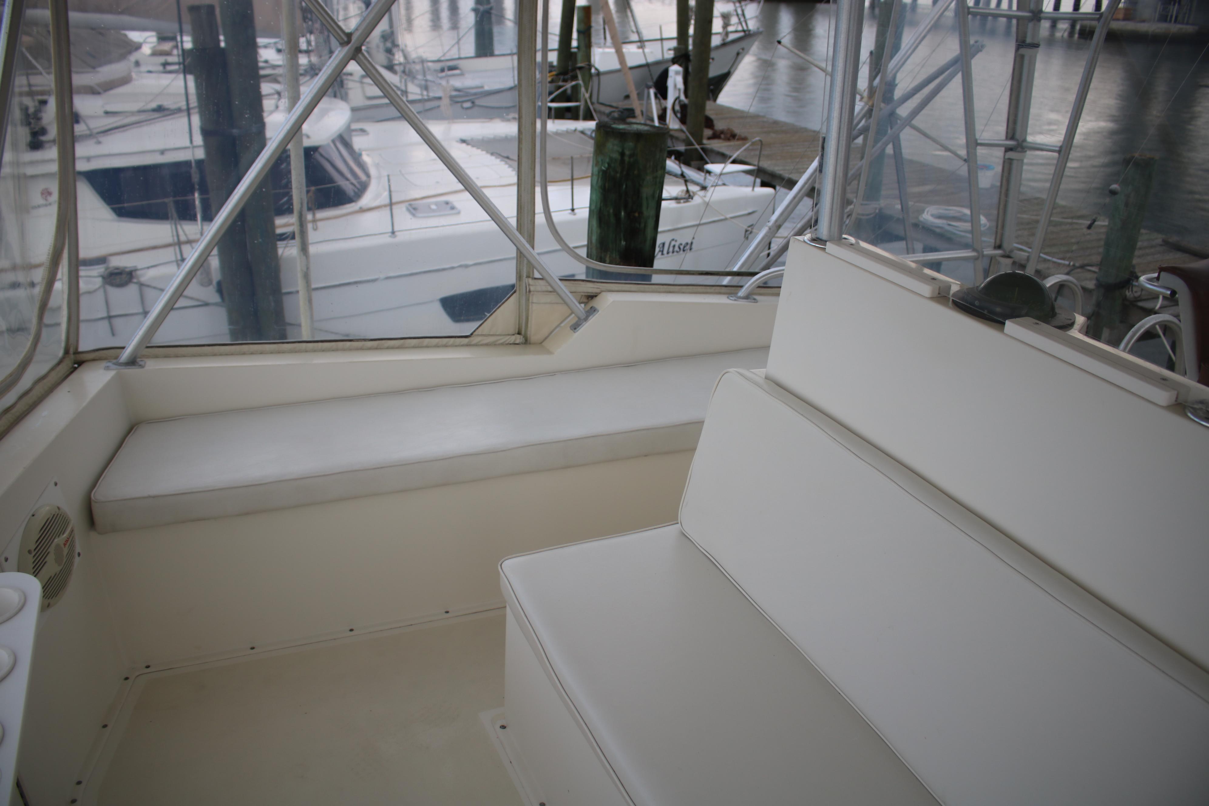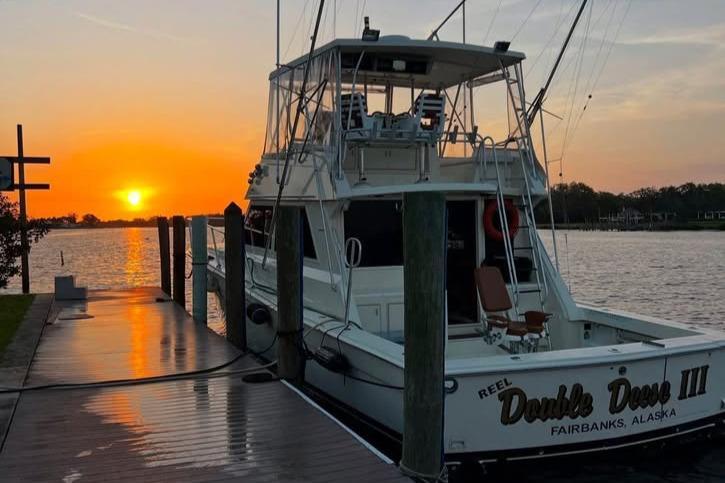 The Double Deese III is a 48-foot Viking. This vessel has a roomy interior that is accessed through a sliding glass door and located at center in the aft cabin bulkhead. The galley is on the port side and includes a full-size fridge/ freezer unit, a three-burner electric stove top, Corian counter tops, and single basin stainless steel sink. The salon area has a couch with leather cushions and cabinets with plenty of stowage. The main stateroom in the fo’c’sle has a pedestal berth with queen mattress, closets, and private access to the head. Both heads have a full shower, Vac-Flush toilet, vanities have a Corian countertop. The second stateroom has two bunks and a closet, drawers below for more stowage. The flying bridge has the helm steering station to port, two captain seats and full electronics. There is a full width bench along the starboard section and an additional full-length bench with cup holders facing forward. Engines are accessed through a hatch in the floor at the cabin entrance. The cockpit area has adequate room for fishing with a fighting chair, shore power outlets, and rod holders. BOTH ENGINES HAVE BEEN REBUILT