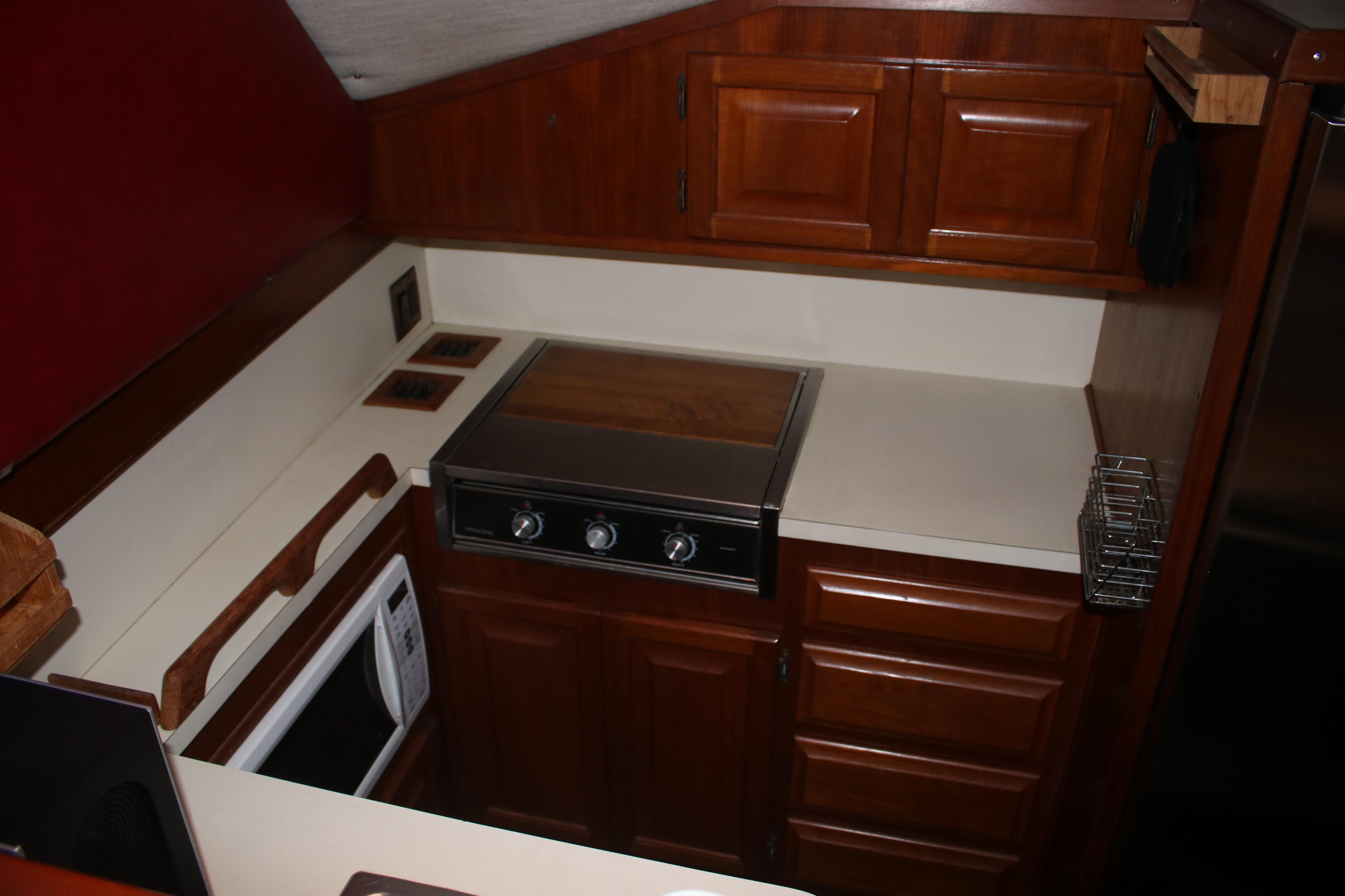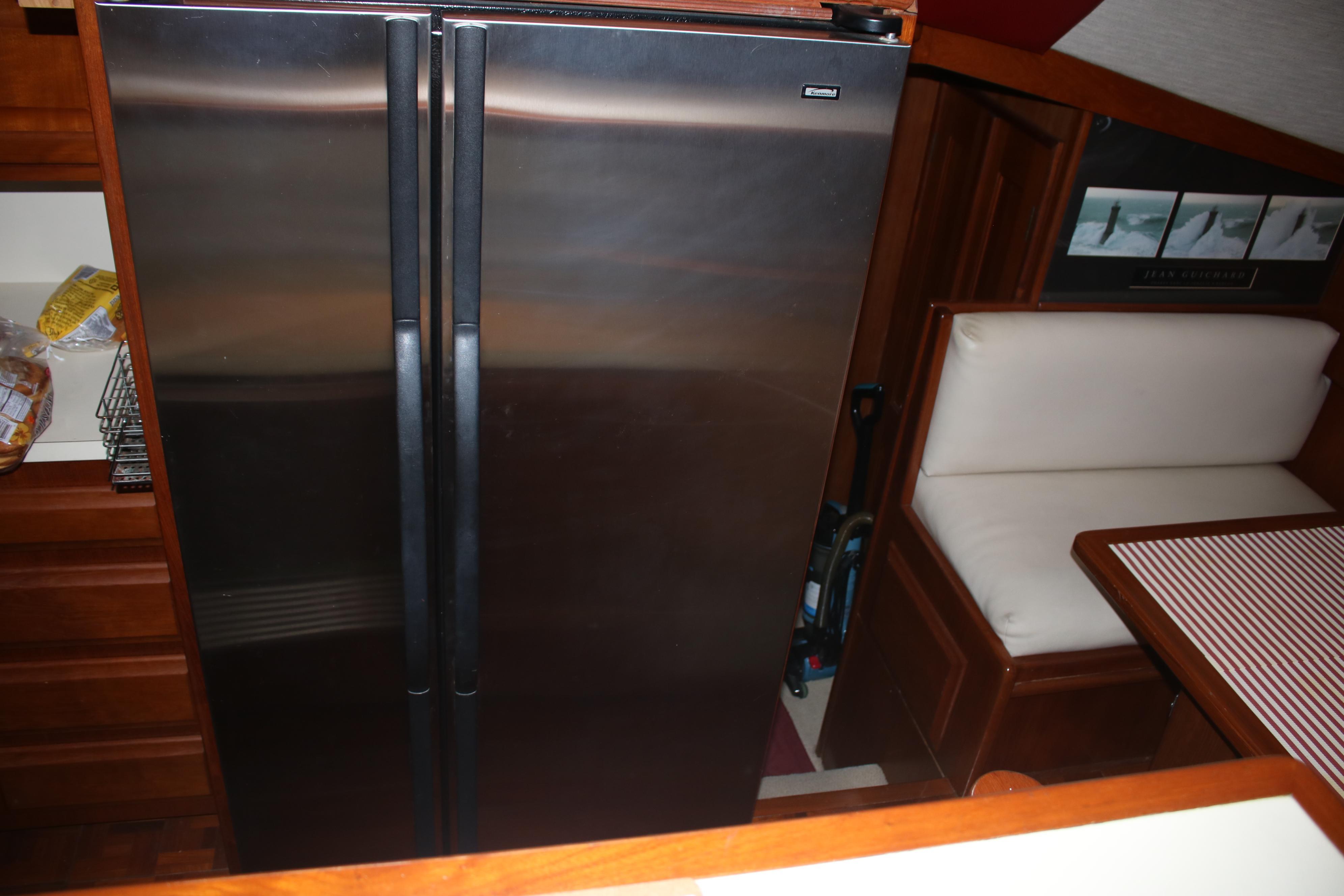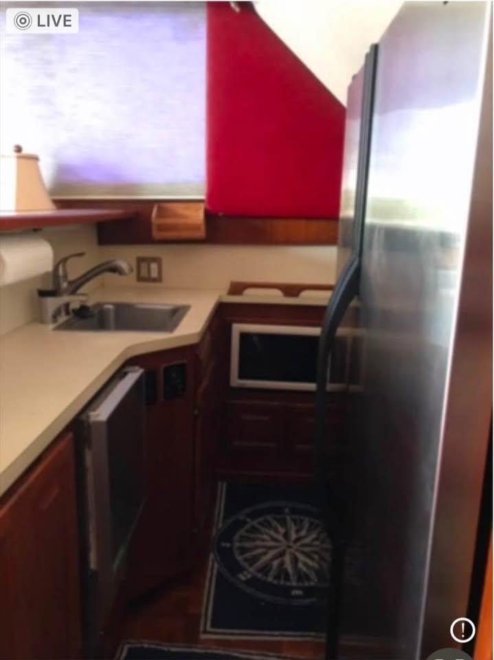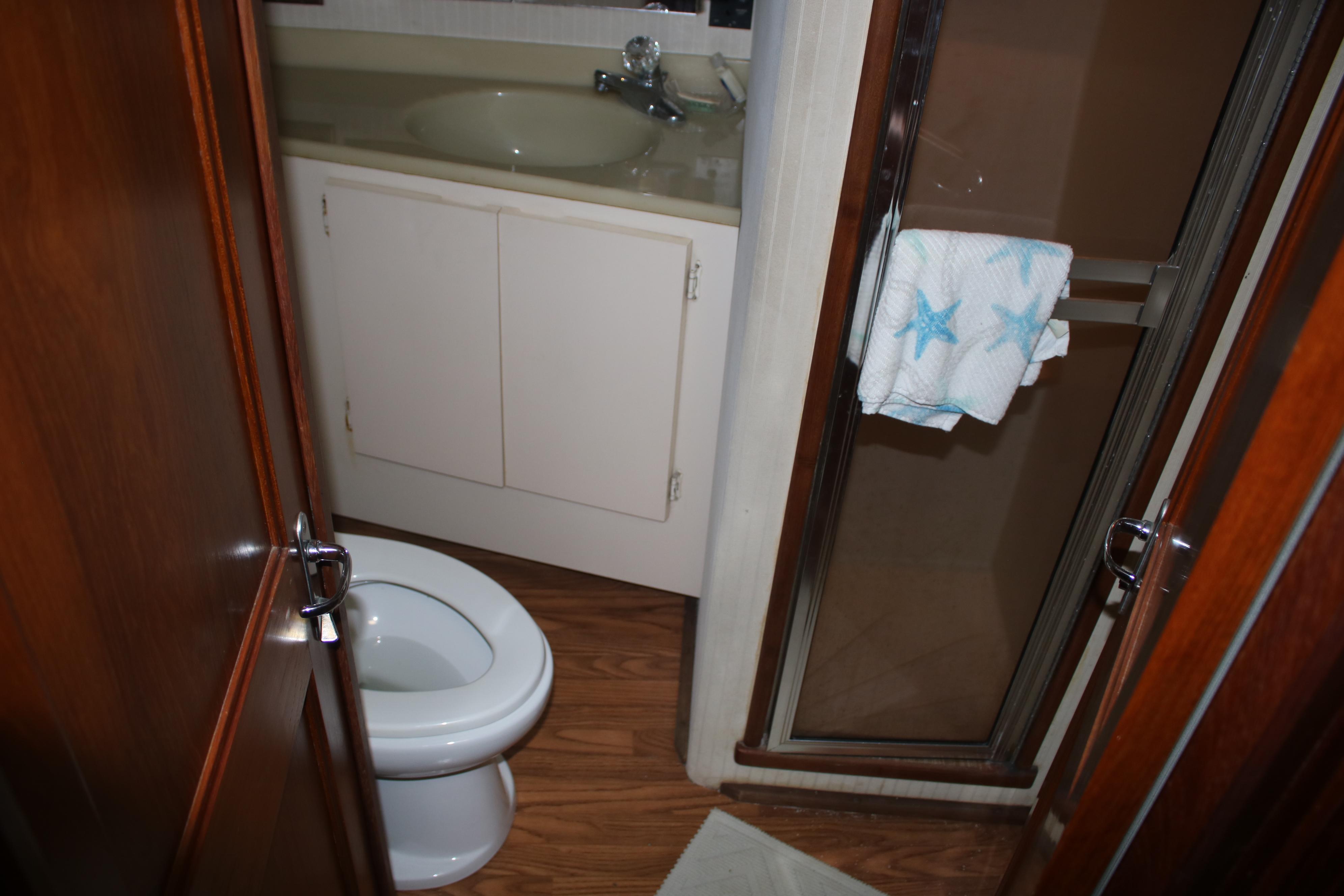 The Double Deese III is a 48-foot Viking. This vessel has a roomy interior that is accessed through a sliding glass door and located at center in the aft cabin bulkhead. The galley is on the port side and includes a full-size fridge/ freezer unit, a three-burner electric stove top, Corian counter tops, and single basin stainless steel sink. The salon area has a couch with leather cushions and cabinets with plenty of stowage. The main stateroom in the fo’c’sle has a pedestal berth with queen mattress, closets, and private access to the head. Both heads have a full shower, Vac-Flush toilet, vanities have a Corian countertop. The second stateroom has two bunks and a closet, drawers below for more stowage. The flying bridge has the helm steering station to port, two captain seats and full electronics. There is a full width bench along the starboard section and an additional full-length bench with cup holders facing forward. Engines are accessed through a hatch in the floor at the cabin entrance. The cockpit area has adequate room for fishing with a fighting chair, shore power outlets, and rod holders. BOTH ENGINES HAVE BEEN REBUILT