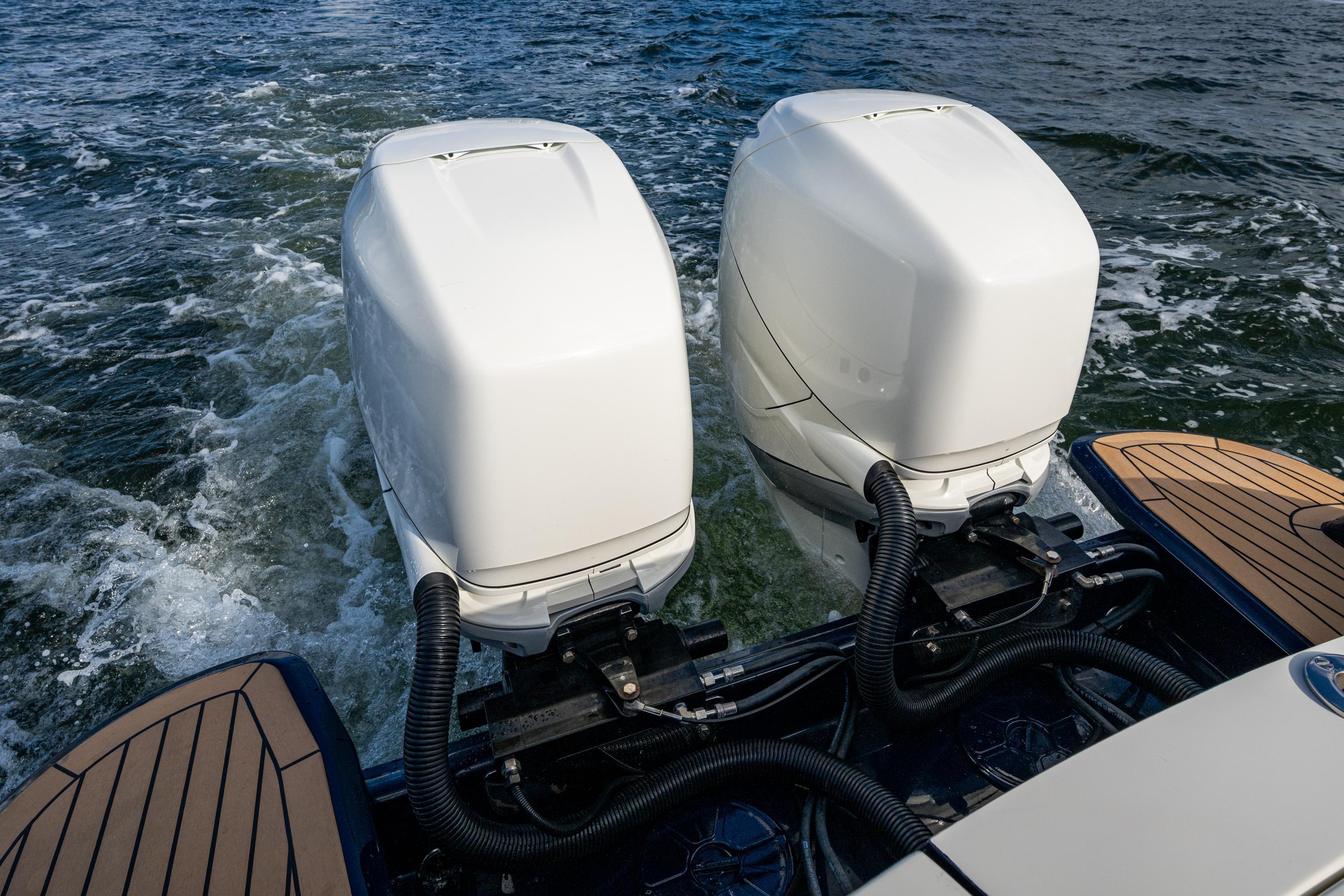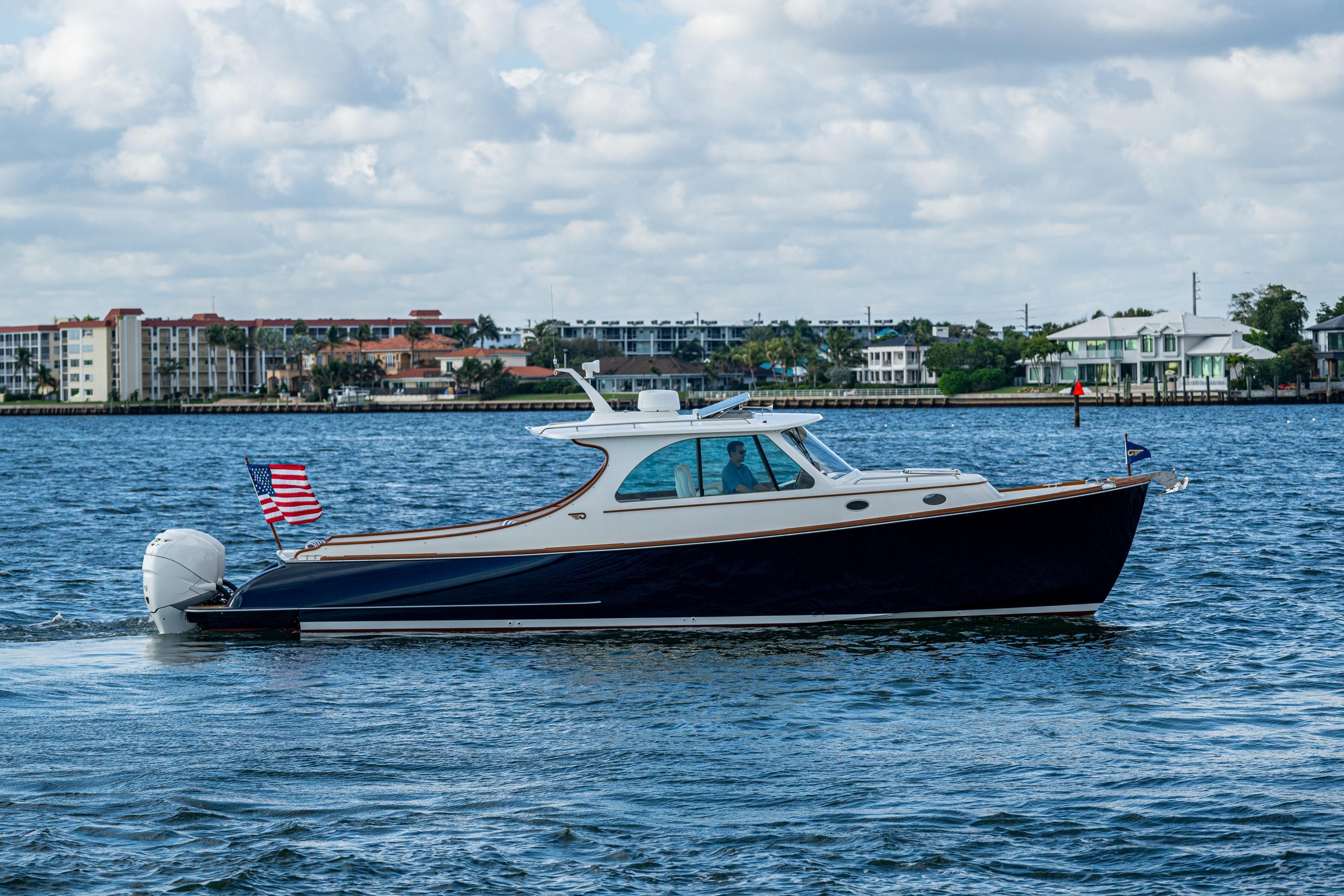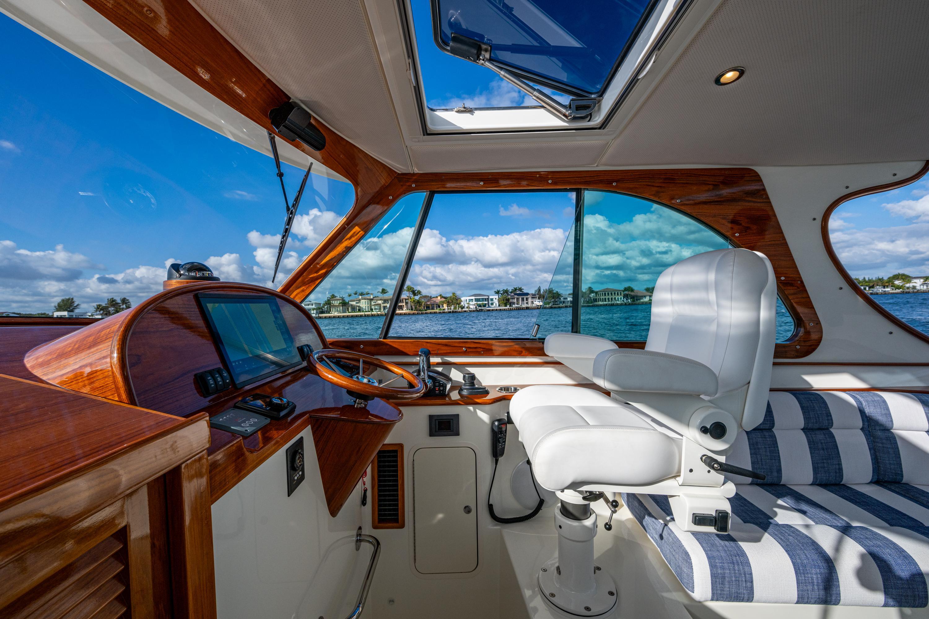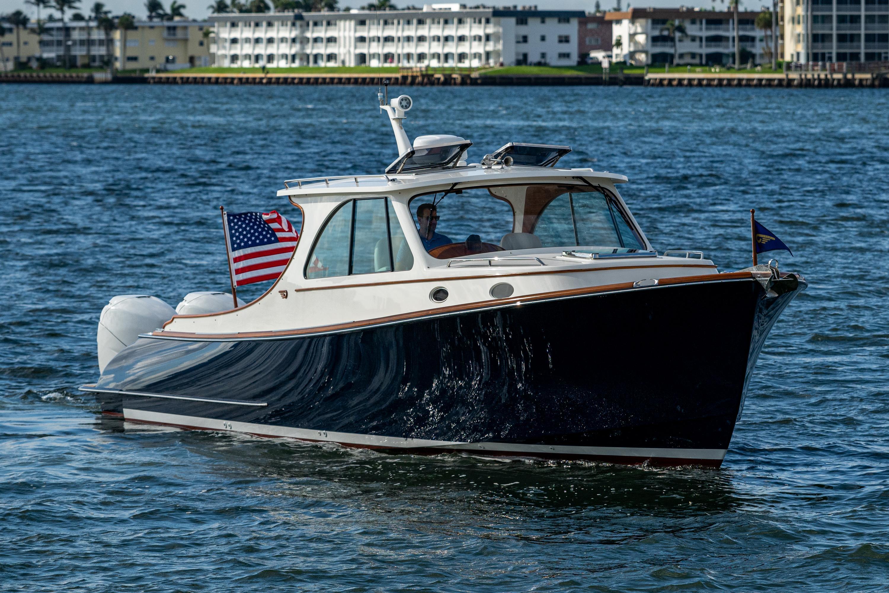 ELEVENCEAS offers the immediate delivery of a stunning and fully equipped Hinckley 35. This exceptional vessel features upgraded Mercury Verado 350hp engines, Mercury JPO joystick control, generator and air conditioning, ensuring swift and luxurious journeys. Enjoy peace of mind with a transferable Mercury Engine Warranty valid through May 2026, and extendable through Hinckley Yacht Services for ongoing worry-free cruising. Launched in 2020, the Hinckley 35 has rapidly earned acclaim for its unparalleled speed and performance, making it the perfect choice for those seeking an elegant and comfortable day boat.ELEVENCEAS’ significant features include:Upgraded Twin Mercury Verado 350hp outboard enginesMercury JPO joystick control system w/ integrated variable speed bow thrusterC-zone digital switching.5 kW Onan marine diesel generatorAir conditioning for interior and pilothouseUpgraded Garmin 8616 16” displayOptional Stidd Seats in lieu of standard helm seatsClearView™ single-pane windshieldAnchor roller with windlassDrawer refrigeration in pilothouseHull: Carbon construction with Corecell M Foam core. Infused and post-cured with Epoxy resin using Seaman Composite Resin Infusion Molding Process (SCRIMP®). E-glass outer and inner skin with closed cell foam core. Laminated using Seaman Composite Resin Infusion Molding Process (SCRIMP®).Flag Blue Awlgrip topsidesOff White gelcoat cabin house and deckStark White Awlgrip boot stripeRed Micron CSC bottom paintStainless steel half round on fiberglass molded rub railHinckley designed heavy-duty fiberglass swim platform painted to match hull color, stainless steel supports and half roundStainless steel telescoping 3-step folding swim ladder that stores under platformDeck Features: Polished stainless steel anchor roller with 12-volt windlass. Windlass controls at helm and handheld wired remote at bow locker.Flush foredeck anchor locker with hinged hatchOPTIONAL Rounded, tapered, varnished teak toe rail with Hinckley profileOPTIONAL Varnished teak eyebrow molding around cabin topPolished stainless steel handrails on cabin house, pilothouse top and across aft end of pilothouseCustom Hinckley 316L stainless steel bow chocksTwo fixed 10" bow cleats, two fixed 10" stern cleats, four 8" pull-up spring cleats, all Type 316L stainless steel.Three (3) Fender pad eyes with chafe strips on toe rails on port and starboard side decksPilothouse top with Hinckley designed fiberglass mast with radome and GPS antenna painted to match deck colorThree fixed ports on cabin house sides and one opening port in the head. Opening port in head has removable screenCockpit: The cockpit features wonderful seating with both forward and aft facing seats. There is a transom door to provide easy access to the swim platform.Cockpit features:Teak deck in pilothouse, cockpit and swim platform-Cushions in Perennials – Vintage Stripe ‘Hello Sailor’ 865-90Hinckley custom built teak step box to aid boarding on port or starboard sideTeak boarding step for port or starboard side deckStarboard transom door to swim platformCockpit shower with hot and cold mixing valve at transom doorDirect overboard drainage and stainless-steel grate covers.Removable bin beneath transom seat and storage locker in transom with drainWhite Stamoid cockpit coverWhite courtesy lights, two per side, in the cockpit footwells on a dimmer switch, two interior step lights, and one cockpit step light.Pilothouse: One (1) fixed ClearView™ single pane curved windshieldTwo (2) manual sliding side windows in concealed stainless steel frames port and starboard with light green tint.Pilothouse front window has heavy duty, self-parking, intermittent windshield wipers and freshwater washersTwo (2) Stainless steel powered lifting and dogging pilothouse overhead hatches with sky screen retractable shade/screensTwo Stidd Custom seats port and starboard. Covered in Sunbrella – Horizon WhiteCushioned settees port and starboard covered in Perennials – Vintage Stripe ‘Hello Sailor’ Insulated white acoustic overheadTeak overhead handrail in pilothouse along centerlineLighting is five (5) overhead LED lights on dimmersStorage under pilothouse settees, port and starboard(6) Cup holders in the pilothouse and helm areaVarnished teak locking companionway doorWhite Stamoid 3-piece drop curtains with Eisenglass windowsInterior window covers for pilothouse side and front windows made of White StamoidTwo (2) entertainment system speakers to port and starboard with independent zone controlHelm Area: Dual USB jack at helmManual sliding side window with powered lifting and dogging overhead hatchStorage compartment under port helm seat with door on inboard faceHinckley custom helm seat with adjustable (up/down/fore/aft) finish to match starboardGlove box for storage of small itemsVessel shore power and 120V breaker panelStainless steel cup holder forward of glove boxStainless steel footrest integrated into helm areaHelm Station:Fiberglass console and varnished teak accentsVarnished teak instrument podStainless steel steering wheel with varnished wood rimMercury JPO Control SystemBow Thruster control-under dashHinckley custom helm seat with up/down/fore/aft adjustment (and swivels), upholstery in Sunbrella – Horizon WhiteStorage compartment under helm seat with door on inboard face of compartmentGlove box to starboard for storage of small itemsManually operated sliding side window and overhead hatch with powered lifting and dogging overhead hatchStainless steel cup holder at forward end of starboard shelf12V cigarette-style charging plug and dual USB charging portFusion stereo remoteWiper and ACR spotlight controlsRitchie compassTrim tab controlsStainless footrestElectronics & Navigation: Garmin GPSMAP® 8616 multi-function 16” Display with depthGMR™ 18 XHD 4kW Radome and differential GPS antennae painted to match deckMercury JPO AutopilotVHF radio with RAM micACR remote controlled spotlight mounted on mast and painted t