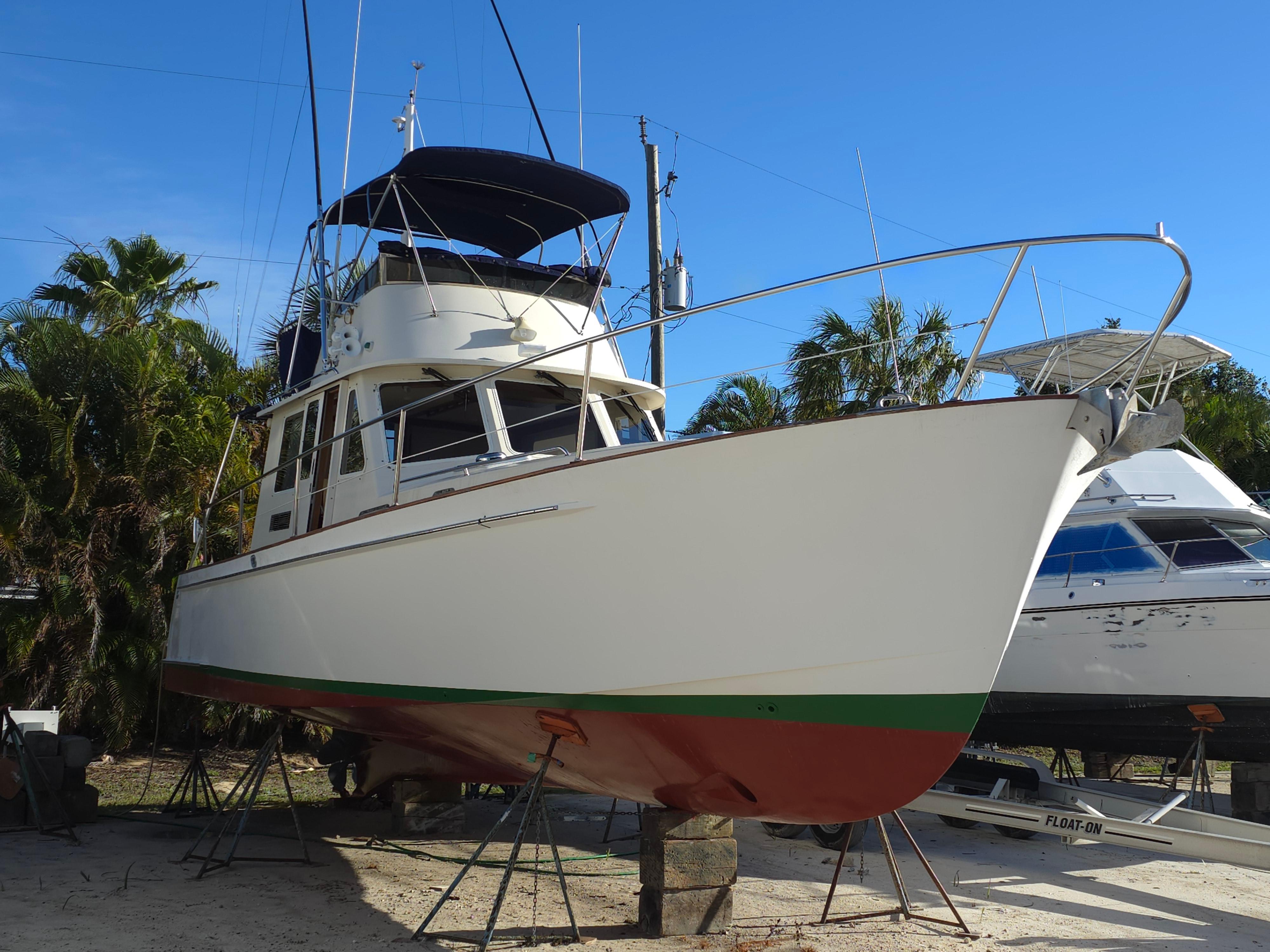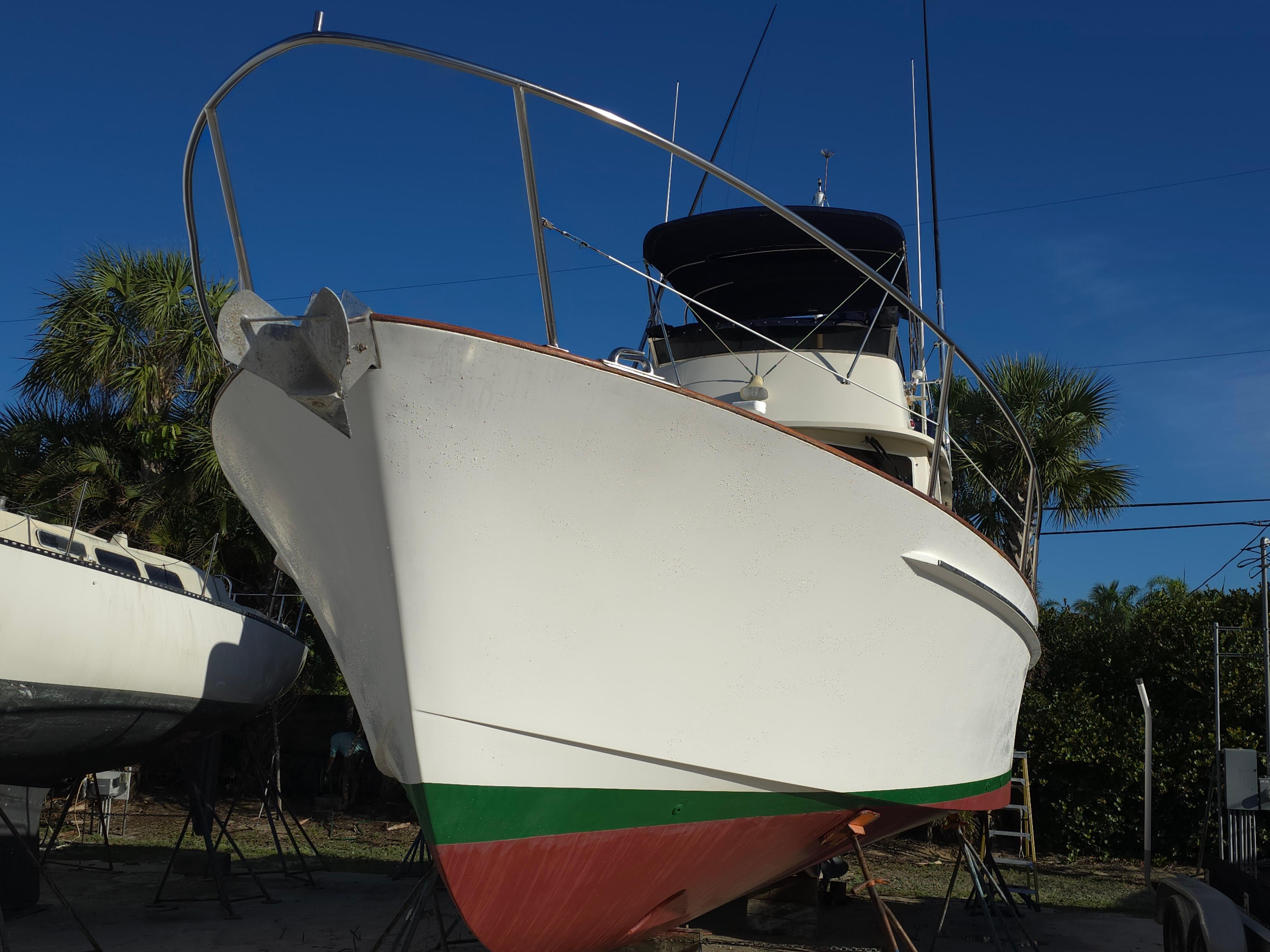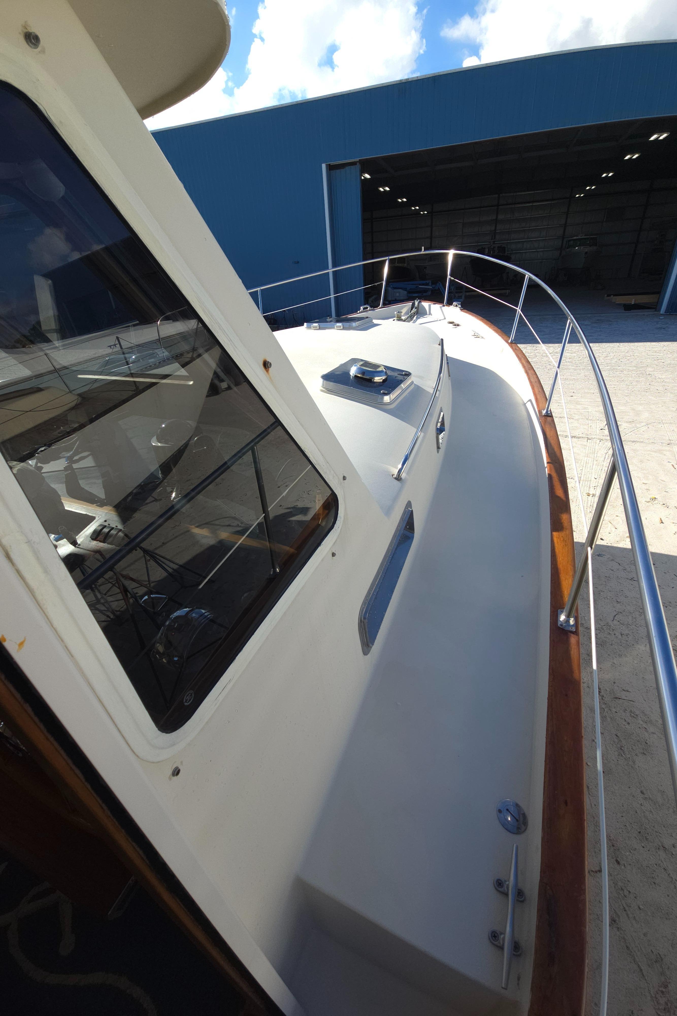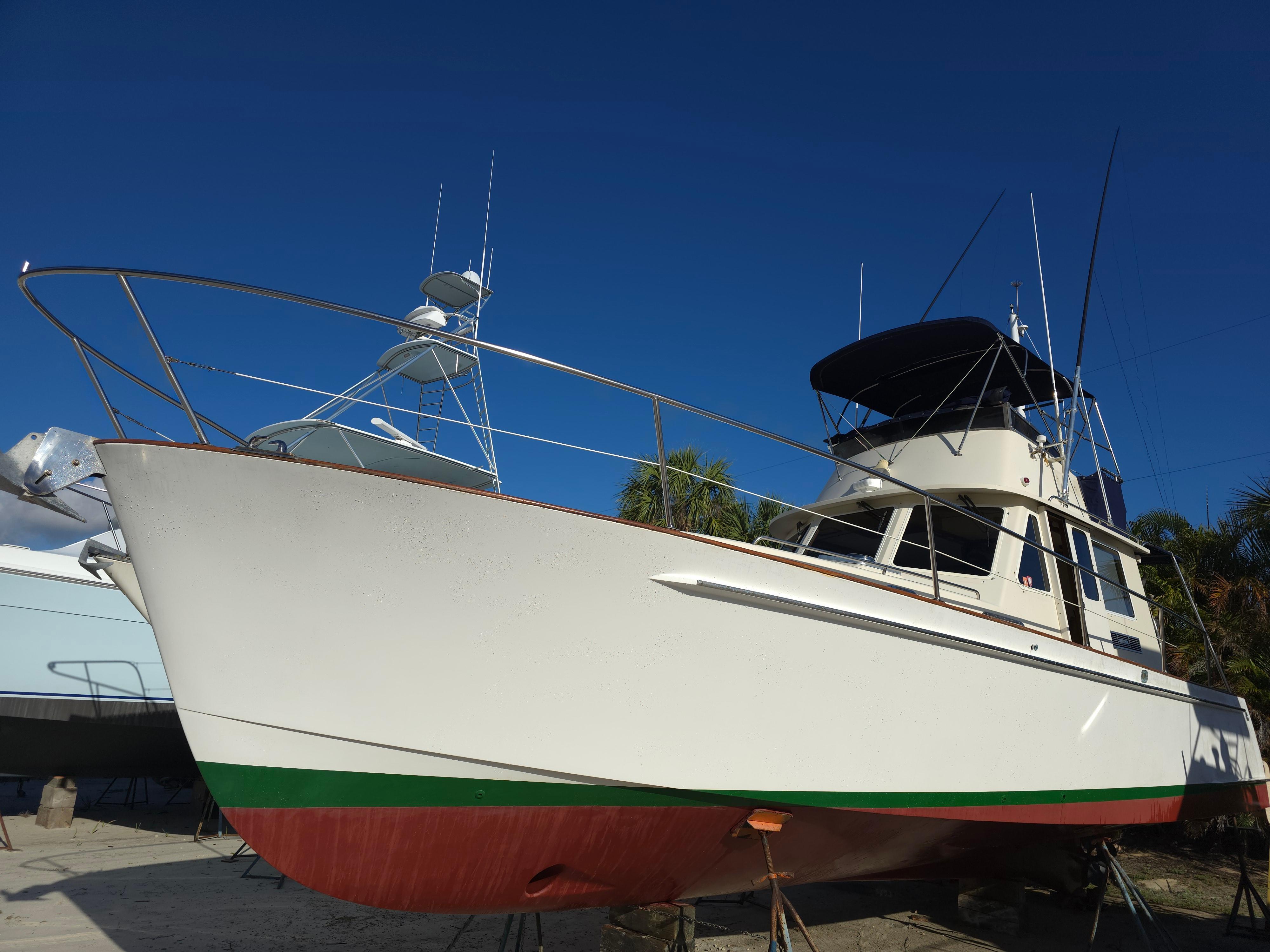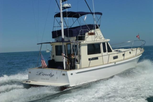 LINDY is a Legacy 40 Sedan Flybridge that has been extensively upgraded and improved by her current (second) owner at the Portsmouth and Stuart Hinckley service yards. With her single Cummins QSM-11 (635 hp) engine and Mark Ellis-designed modified deep vee hull, she is very fuel efficient. She will plane off at 11 knots and can be cruised as fast as 21 knots. The hull has a full keel so the running gear is fully protected. LINDY is a two-cabin, single-head layout with the galley down.INTRODUCTION:Currently sitting in Stuart, Florida, LINDY is a classic Downeast design that is easy to see and ready for her next owner. She has been set up to fish or cruise or just enjoying a ride at the end of the day. CONSTRUCTION: DECK & HULLHull is vacuum infused fiberglass laminate with Corecell foam with vinylester resinWhite hull with green boot stripePainted rub rail and quarter guard with stainless steel chafe strips protect the hullSwim platform with swim ladder and handholds by ladderDeck is fiberglass laminate with balsa coreWhite gelcoat with light tan nonskidVarnished teak toe rail cap on molded bulwarkStainless steel bow chocks for bowlines and hawse pipes in bulwarks for midship and stern linesStainless steel bow rail extending aft to cockpit provides security on deck (2013)Stainless steel handrails on forward trunk cabin and edge of pilothouse roofThree large overhead hatches in trunk cabin forward. Aft two have built in solar powered vent fansForepeak storage for anchor chain and fender and lines on either side of windlassCourtesy lights in bulwarks COCKPIT:The aft cockpit provides a comfortable outdoor space with access to the swim platform through a transom door and a ladder up to the flybridge. Steps up to the side decks provide access to the bow and a sliding door opens into the pilothouseAmenity under flybridge ladder includes a small sink and baitwell (sink faucet pulls out for deck shower) (2013)Aft facing seat with cushion with storage belowSecondary steering station outboard of aft facing seat with controls for engine, steering and bow and stern thrusters as well as NavNet display (2013)Fighting chair with cushion (2013, stores in bunk room when not being used)Multiple rod holders in coaming and mounted to hand railsPivoting mast that can be lowered to reduce bridge clearanceHatches in deck provide access to systems and storage below deckCustom overhead awning (2013) FLYBRIDGE:The flybridge provides and additional outdoor entertaining and driving area with comfortable seating and excellent visibility Stainless steel folding bimini provides shade (2013)Lee graphite outriggers (2013)Double helm seat with single passenger seat to port and custom second row of seating behind (flybridge design and cushions updated 2013) Passenger seat to port converts to full reclined position for loungingStorage under flybridge helm and under aft seatsStorage bin to port in dash with clear cover for charts, etc.Flybridge steering station with duplicate electronics and engine controls ACCOMMODATIONS:The warm bright interior is finished in Herreshoff style with white bulkhead and overhead with varnished cherry trim and lockers and a traditional teak and holly cabin sole with removable yacht carpet. Starting aft, the large pilothouse includes an inside helm and large seating area which steps down forward to and open galley connected visually for visiting while cooking and entertaining. Opposite the galley to starboard is a sleeping cabin with double bunk berths and sliding pocket doors for privacy. The head is forward of the galley and includes a separate stall showers and has access from the forward cabin and main cabin area. Forward is the master cabin with a large v-berth. Air conditioning with reverse cycle heat provides climate controlled comfort when desiredOpening overhead hatches and portlights throughout provide abundant natural light and ventilationOverhead hatches have integrated screens and shades and portlights have curtainsVarnished cherry hull sheathing along exposed areas of hull insideCustom blue carpets over teak and holly cabin soleSolid cherry passage doors with stainless steel hardwareOverhead sound down material replaced 2013 PILOTHOUSE:The pilothouse with its large windows and comfortable seating is the primary interior living and entertaining space on the boat. The layout was customized by Hinckley in 2013 Excellent visibility through three large fixed forward windows, large fixed side and aft windows (side windows replaced 2013).Access to cockpit and side decks through sliding doors aft and on both sides forwardElectric window blinds for side and aft windowsHelm area forward to starboard provide protected inside steering station with easy access to the side deck through sliding doorL shaped settee aft to port with dining table and settee opposite to port behind helm with rod storage under starboard setteeDining table has fold out leafs and bottle storage (2013)Double helm seat with backrest that folds down to provide end table for starboard setteeOpening chart table to port above galley with storage belowLG smart flat screen TV in fold down cherry overhead box with Apple TV system (2023) GALLEY:The open u-shaped galley is open above to the pilothouse and has a bright and open feel. Dark green Formica countertop with cherry fiddlesStainless steel double sink with hot/cold pressure water faucetUnder counter refrigerator with separate large top loading freezer compartment outboardTwo burner Princess electric cooktopSharp microwave mounted under cooktopExcellent storage in lockers above and outboard of counter as well as in drawers and lockers below the counterLarge stainless steel opening portlight provides views outside and light and ventilation GUEST CABIN:The guest cabin opposite the galley provides sleeping for two in bunks and can also be used as a seating area to visit with the cook Lower berth pulls out to convert to small doubleSliding pocket doors can be closed for privacyO
