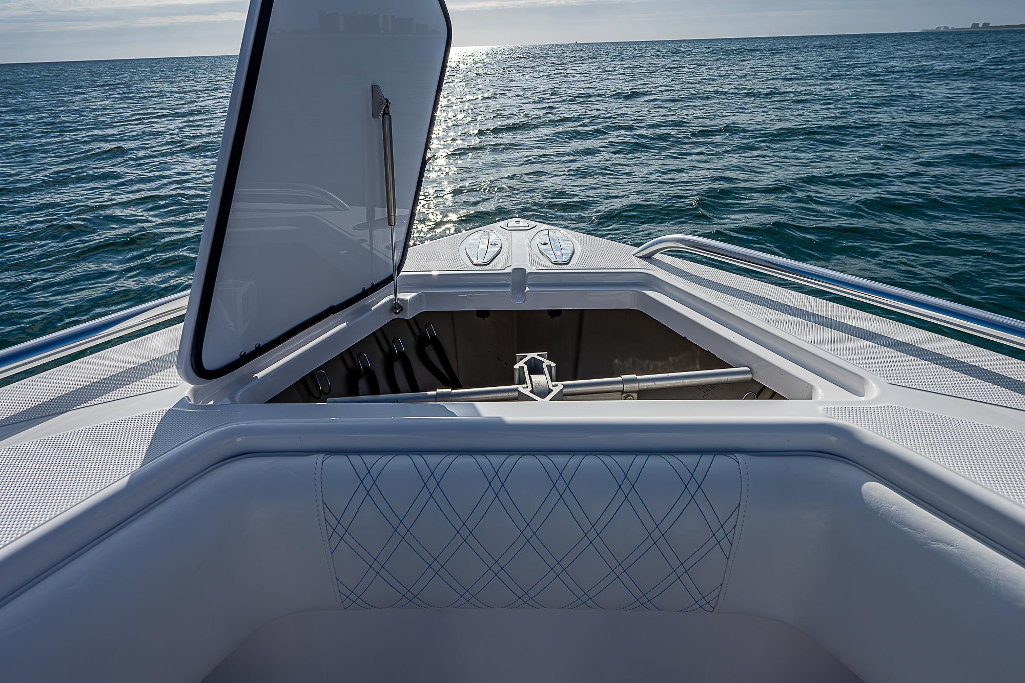 - Stainless dock line holders mounted in anchor hatch
