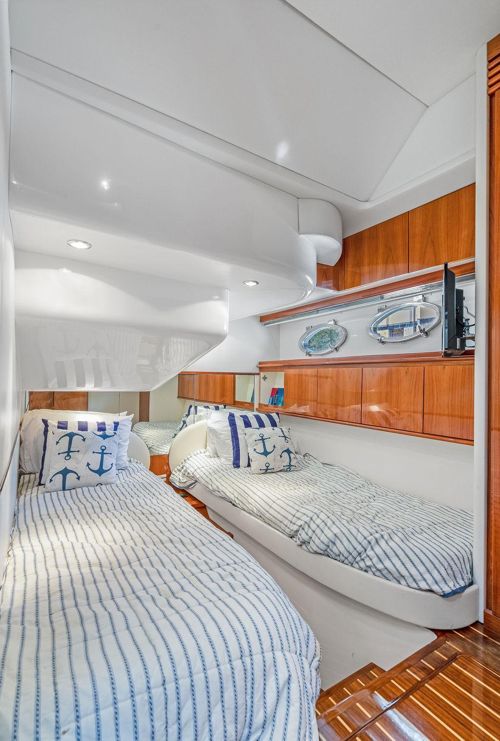 The Pershing 50, launched in 2005, is a luxury performance yacht known for its sleek design and high-speed capabilities. Here are some key features and specifications of the 2005 Pershing 50:Specifications:Length Overall (LOA): Approximately 50 feet (15.24 meters)Beam: Approximately 14 feet (4.38 meters)Draft: Approximately 4 feet (1.35 meters)Displacement: Around 18 tonsFuel Capacity: About 634 GallonsWater Capacity: About 134 GallonsPerformance:Engines: Equipped with twin MAN V8 engines, each producing around 900 horsepower, although other engine configurations may be available.Top Speed: Approximately 45 knotsCruising Speed: Around 40 knotsDesign and Features:Exterior: The yacht features a streamlined, sporty design with a deep V-hull for enhanced performance and stability.Interior: The Pershing 50 offers a luxurious interior with high-quality finishes. It typically includes a spacious salon, a fully equipped galley, and comfortable sleeping accommodations for 6 guests in 3 cabins.Amenities: The yacht is equipped with modern amenities such as air conditioning, entertainment systems, and advanced navigation equipment.Deck Layout: The exterior deck space is designed for both relaxation and entertainment, featuring a sunbathing area, a comfortable seating area, and easy access to the water.Additional Highlights:Build Quality: Pershing yachts are known for their superior craftsmanship and attention to detail, ensuring a high standard of comfort and durability.Customization: Owners often have options for customizing the interior and exterior to suit their personal preferences and style.The 2005 Pershing 50 is highly regarded for its combination of speed, luxury, and Italian design, making it a popular choice among yachting enthusiasts.Veronique has been used primarily for day cruising and has had many great upgrades making her a perfect opportunity to get into the Pershing Brand and enjoy the exhilarating performance delivered by this 50 footer!! Powered by 900hp MAN engines coupled with Arneson Surface Drives you will launch up to 45 knots top speed and carve through the water like a race car on the track all while maintaining absolute comfort and security. Upgrades and Options added over the years:Main engines replaced by MAN in 2009Cockpit TV added and additional 4 TV's below updatedSatellite TV added with Direct receivers Teak and Holly Flooring added in interior spacesStern Thruster added in 2019Modified Cockpit A/C for better airflow and cooling in 2020New Garmin GPS Plotter and VHF added in 2020Cockpit refrigerator addedNew Fusion stereo addedBottom Paint / Props Tuned / Drives Serviced 2021Engines / Generator Serviced 2022