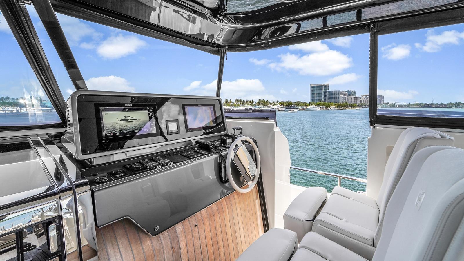 - Fwd Stbd Flybridge Helm with two helm seats, full engine controls, and electronics