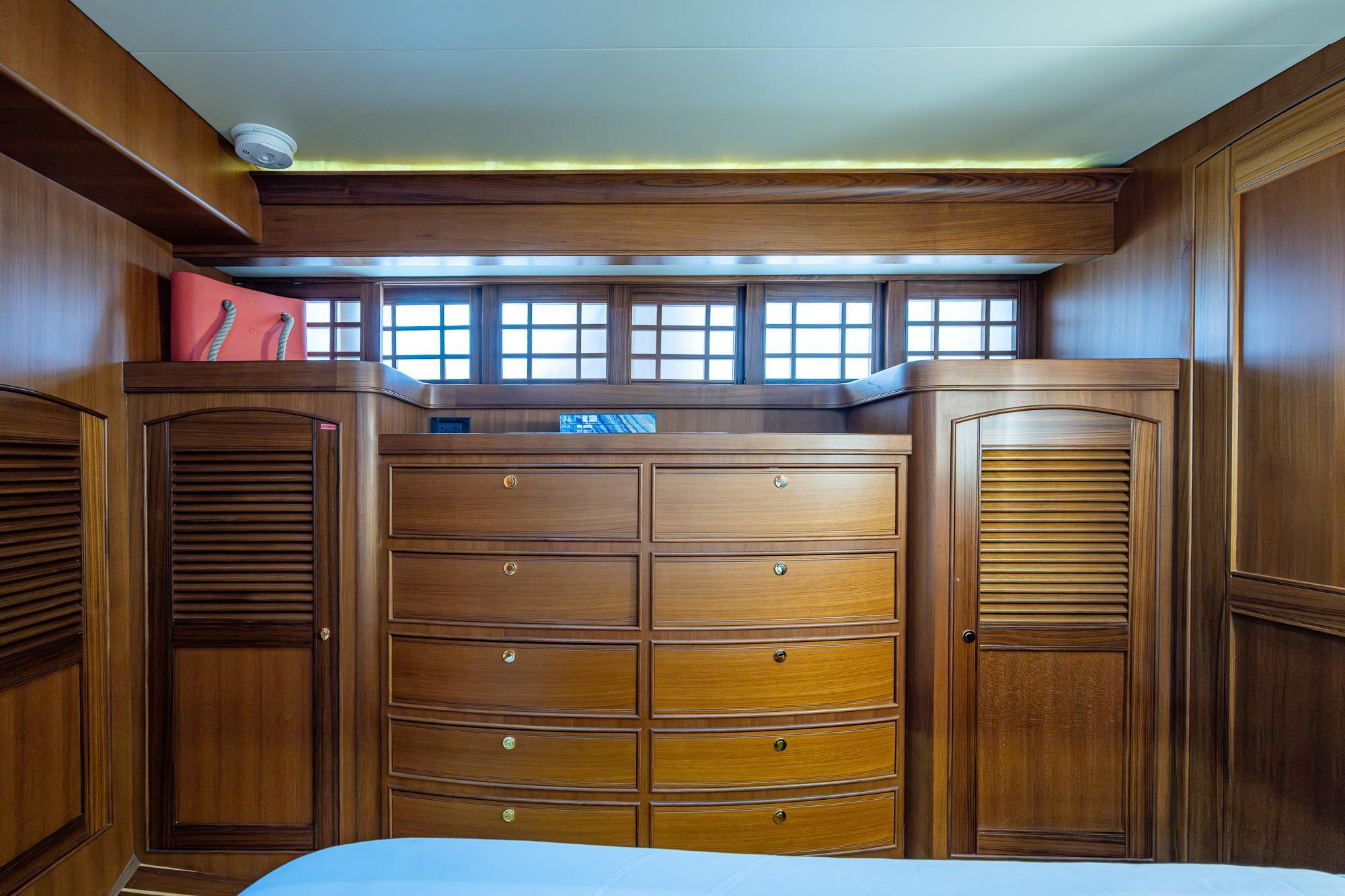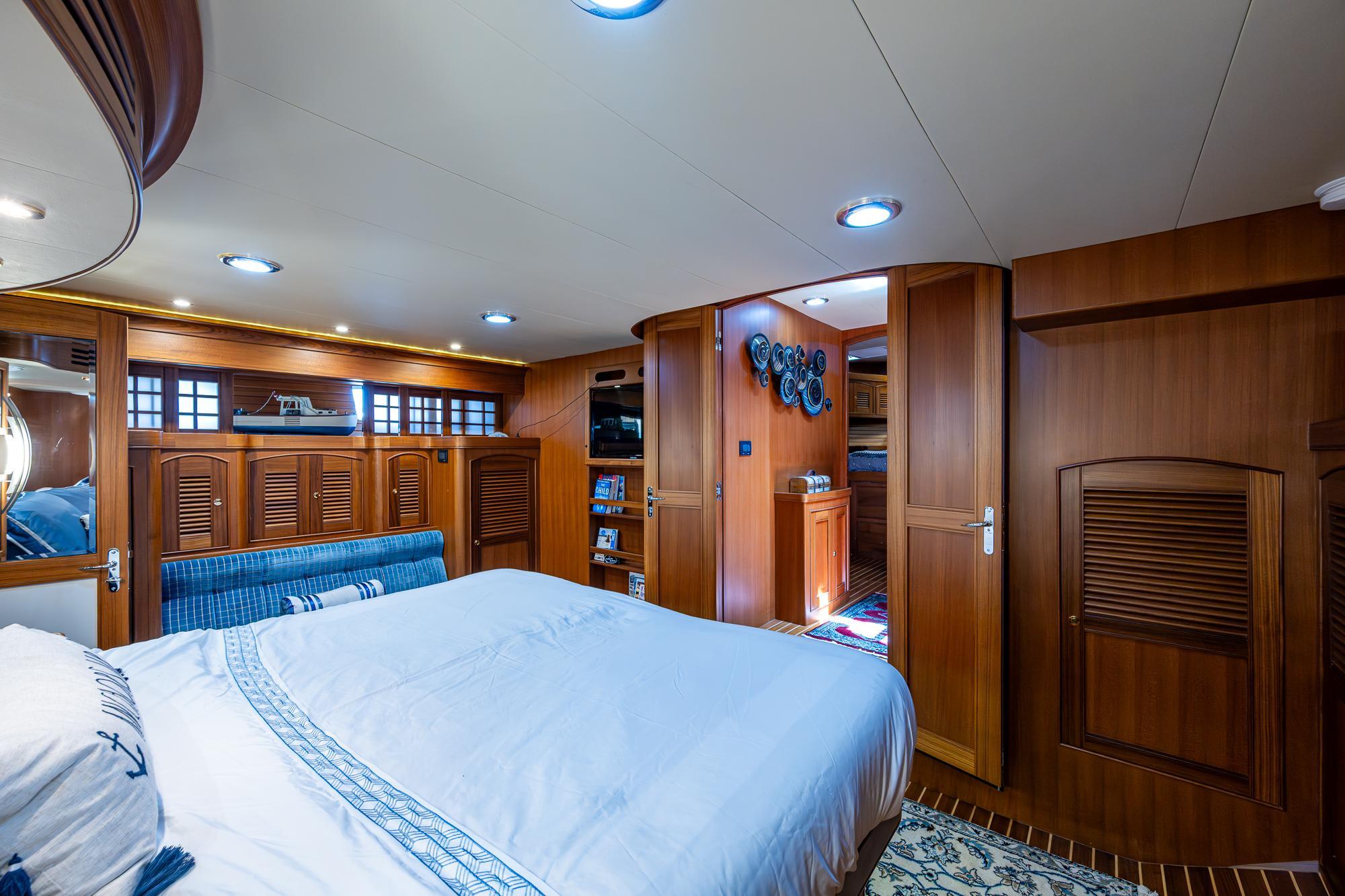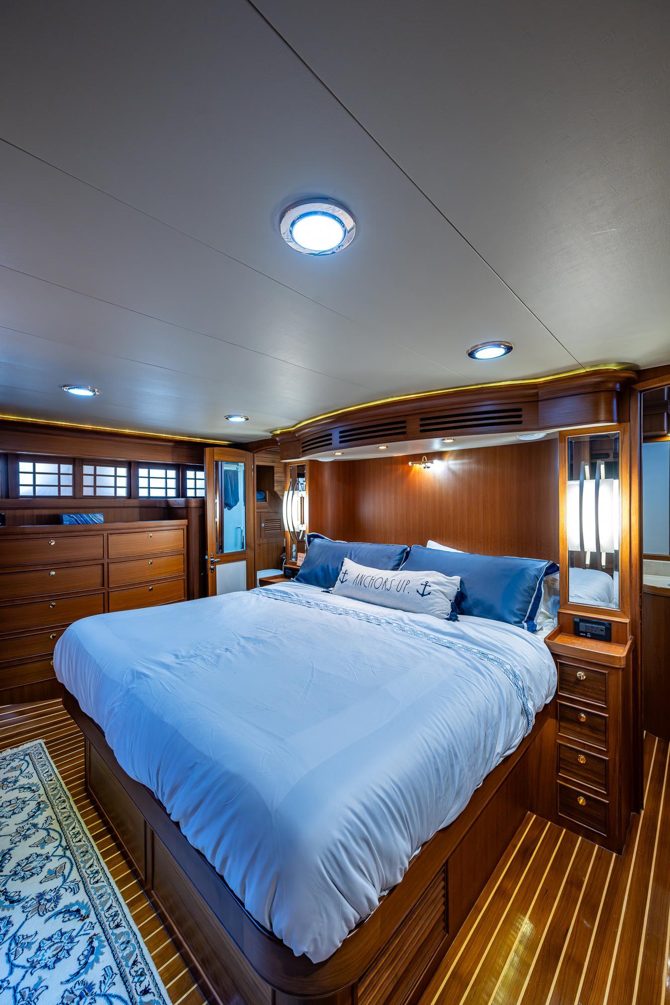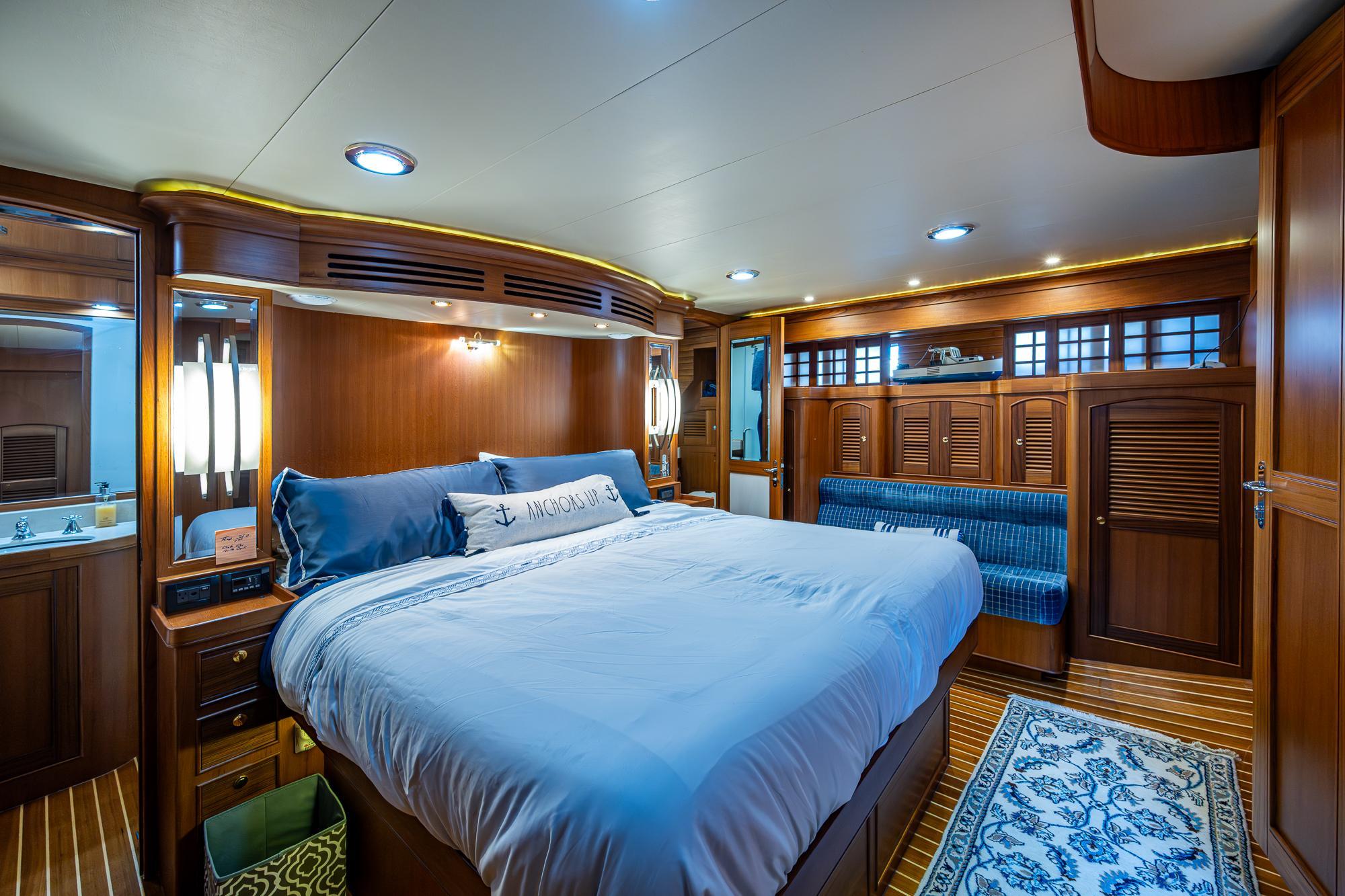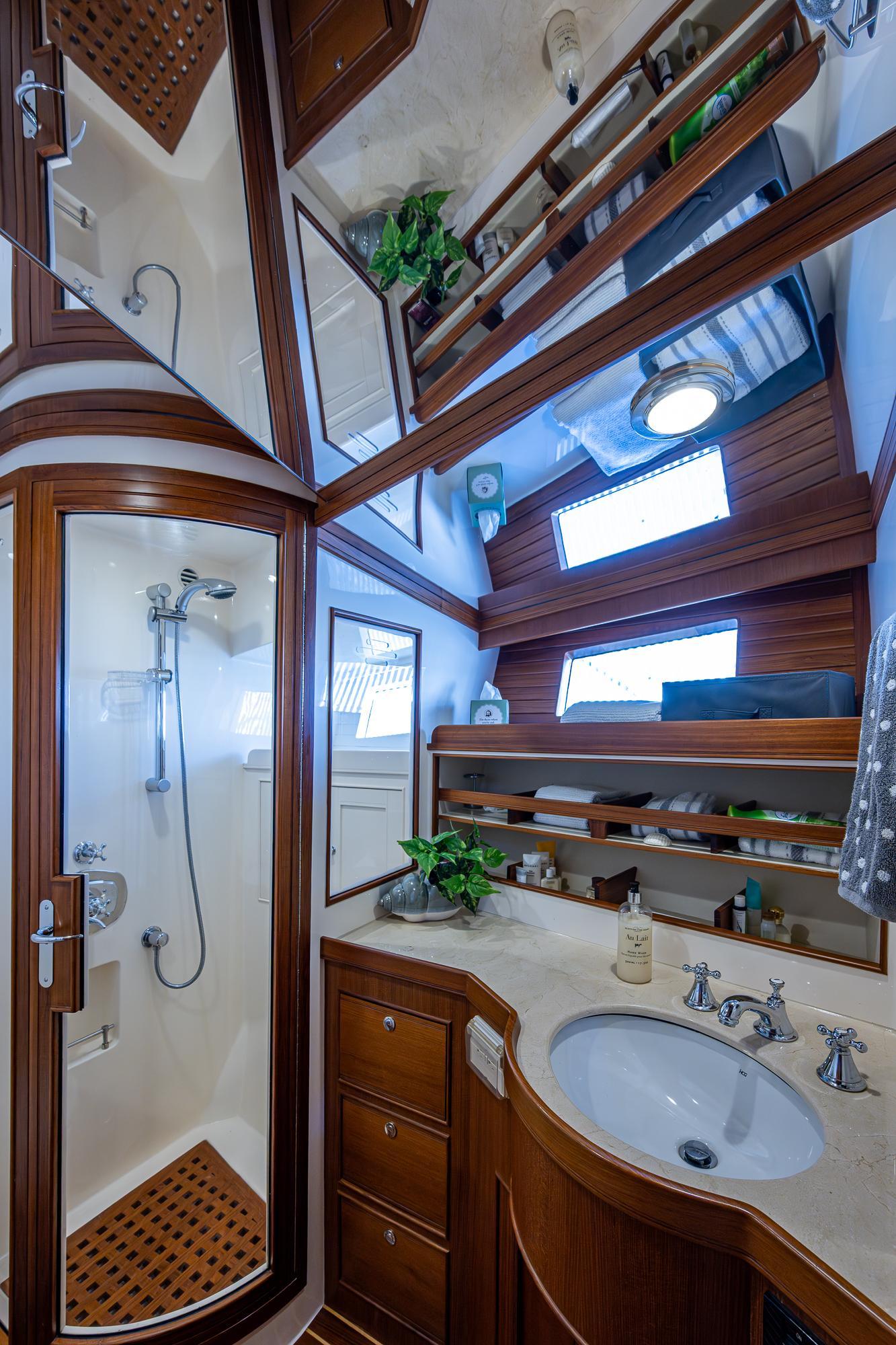 Aft, the full beam master boasts extra large hanging lockers, built in drawer storage and a jack and jill head arrangement with center shared shower stall.Equipment and upgrades