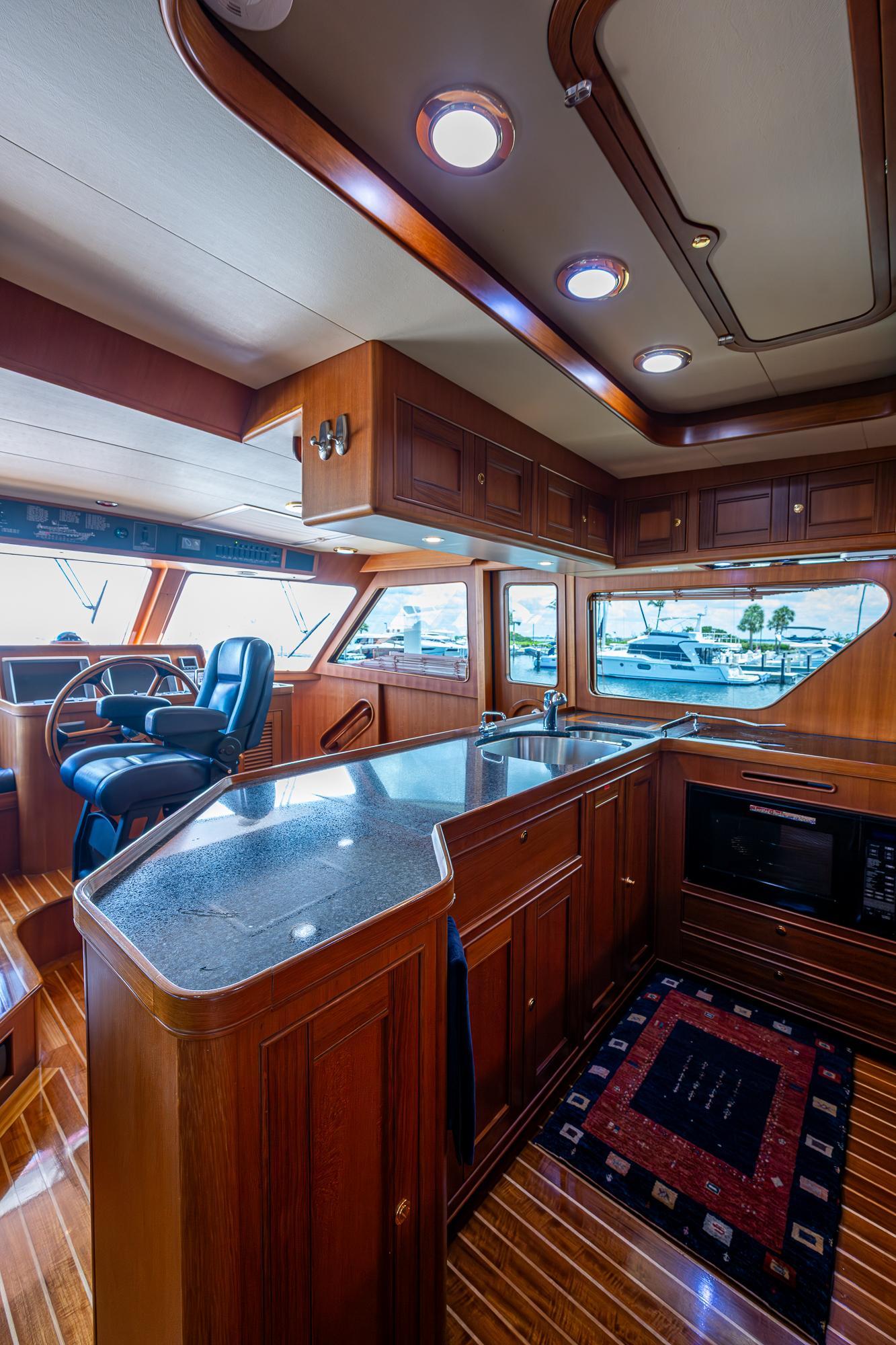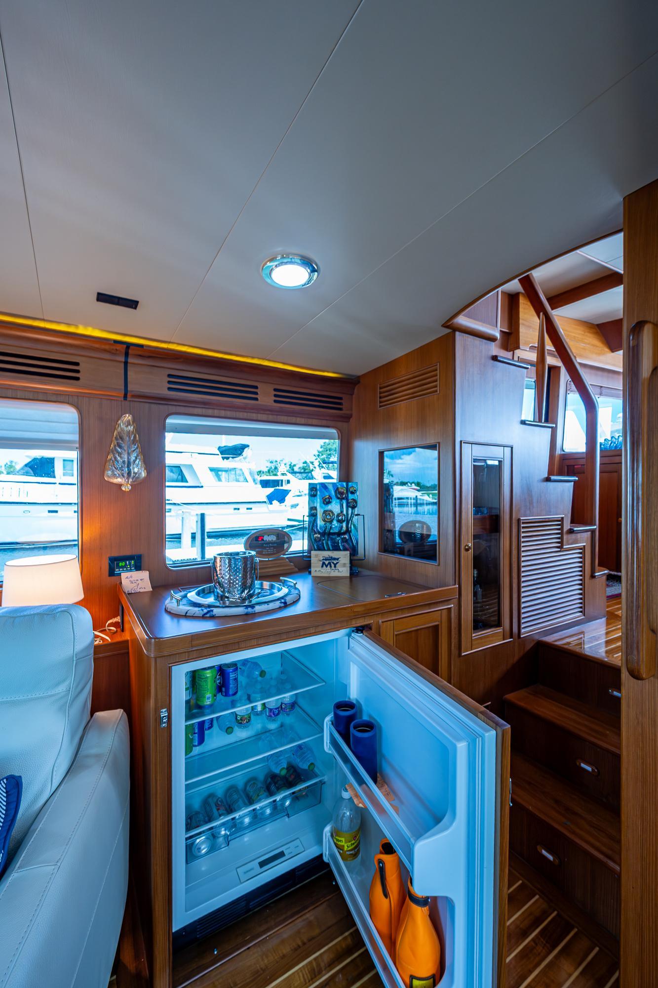 Before you ascend the steps to the raised pilothouse, you will find a generous cocktail bar with oversized refrigerator and abundant storage.