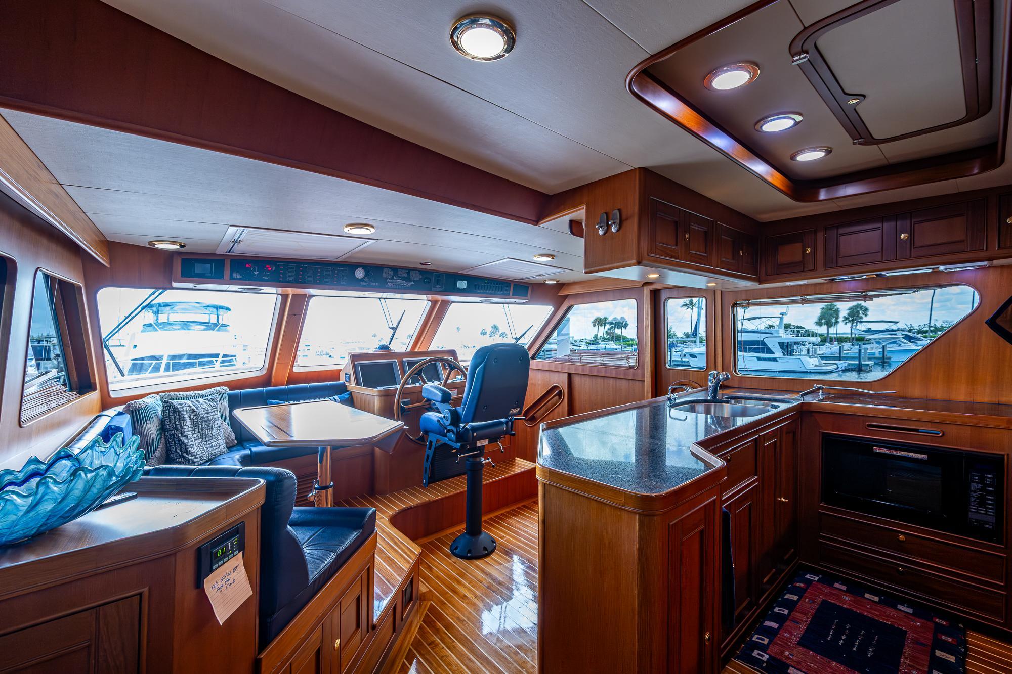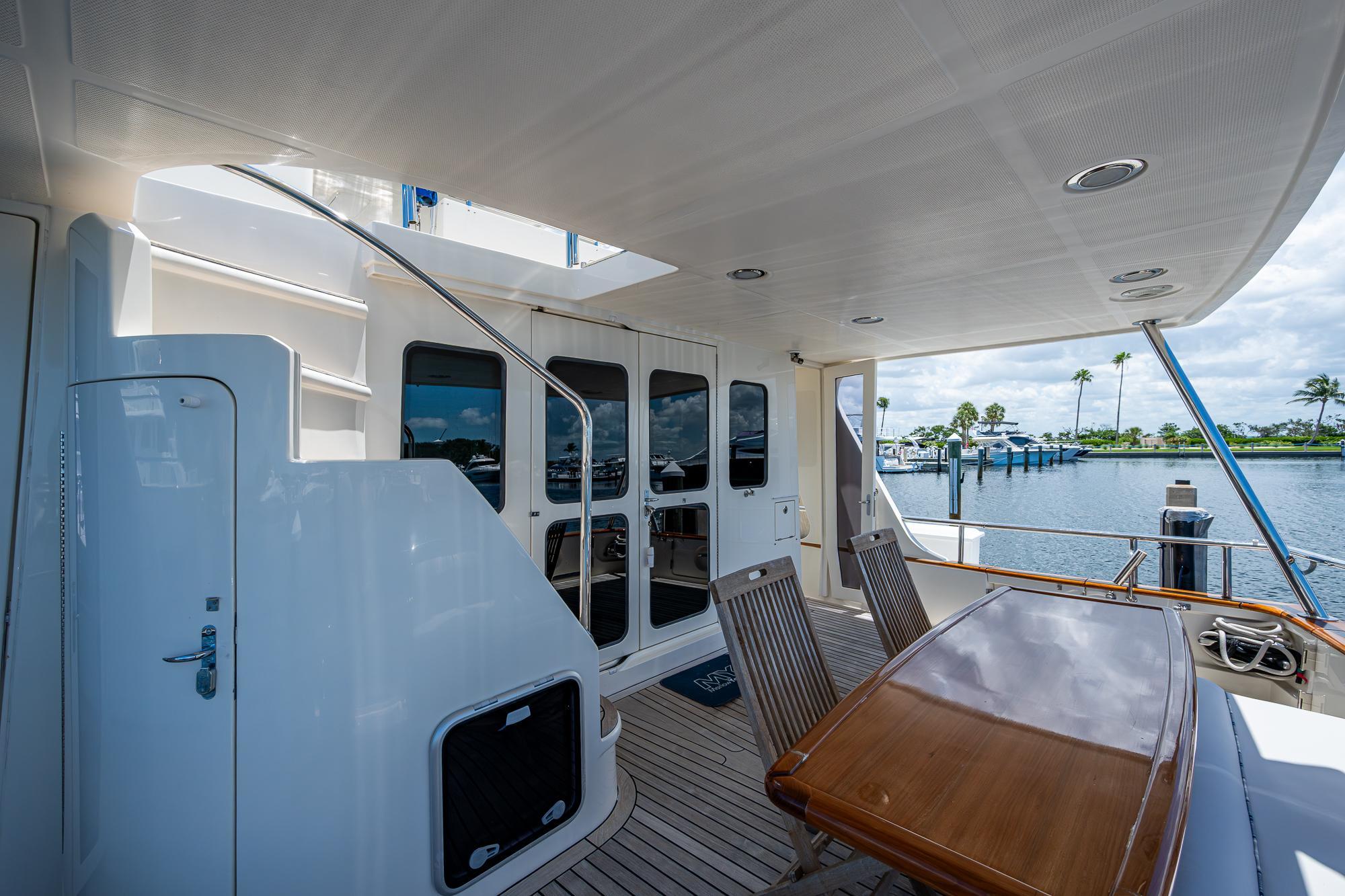 Moving aft to the lower cockpit the decks are covered as you enter the covered aft deck through wing doors and find a large integrated stairway to the bridge. Side boarding doors flank cockpit and the teak covered decks provide secure footing. A large dining table with built in aft seating comfortable accommodates 6. A slide out console with cockpit controls, thrusters and joystick allow for closed quarter operations while backing out of the slip or when the captain needs to be able to access the dock in a hurry.