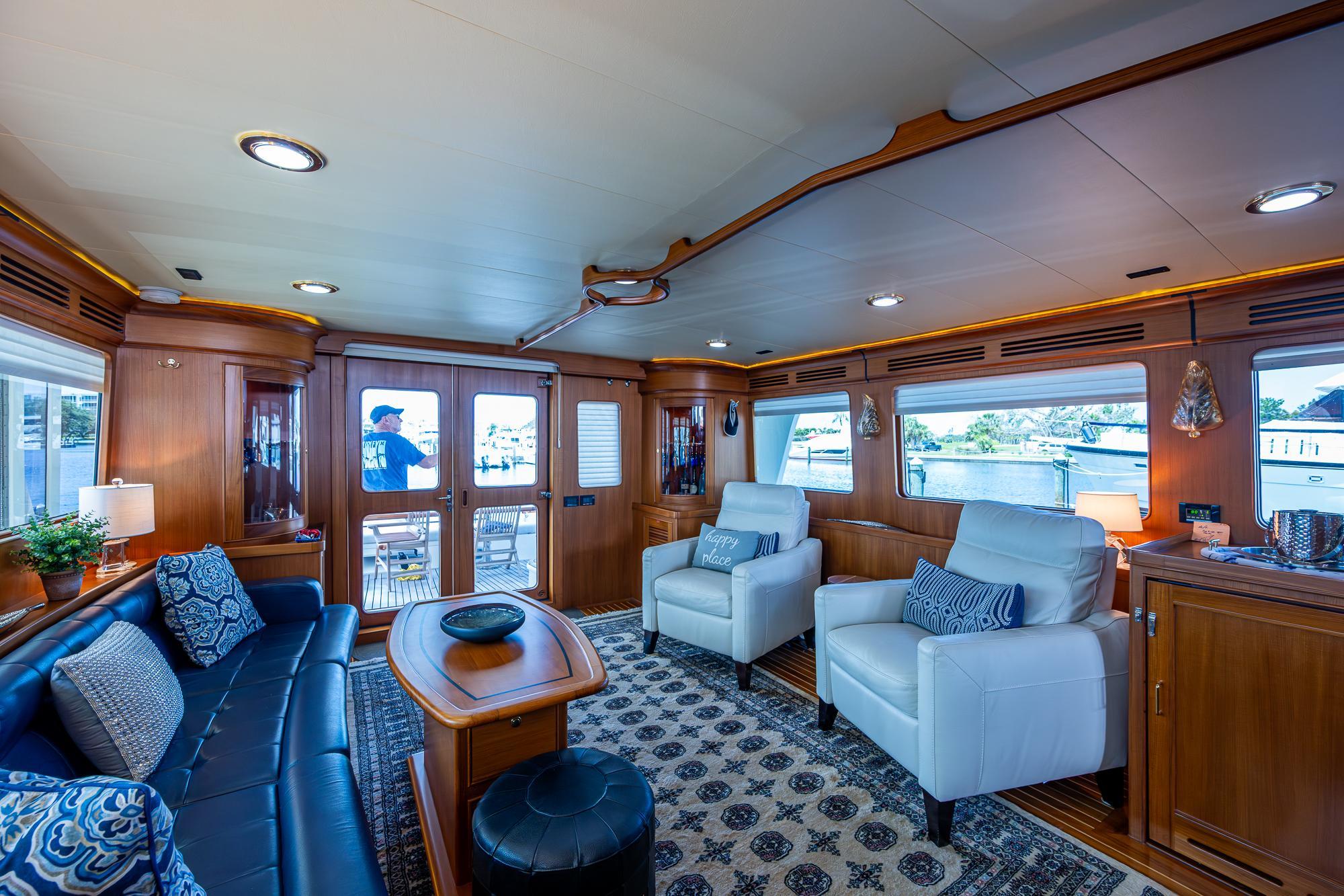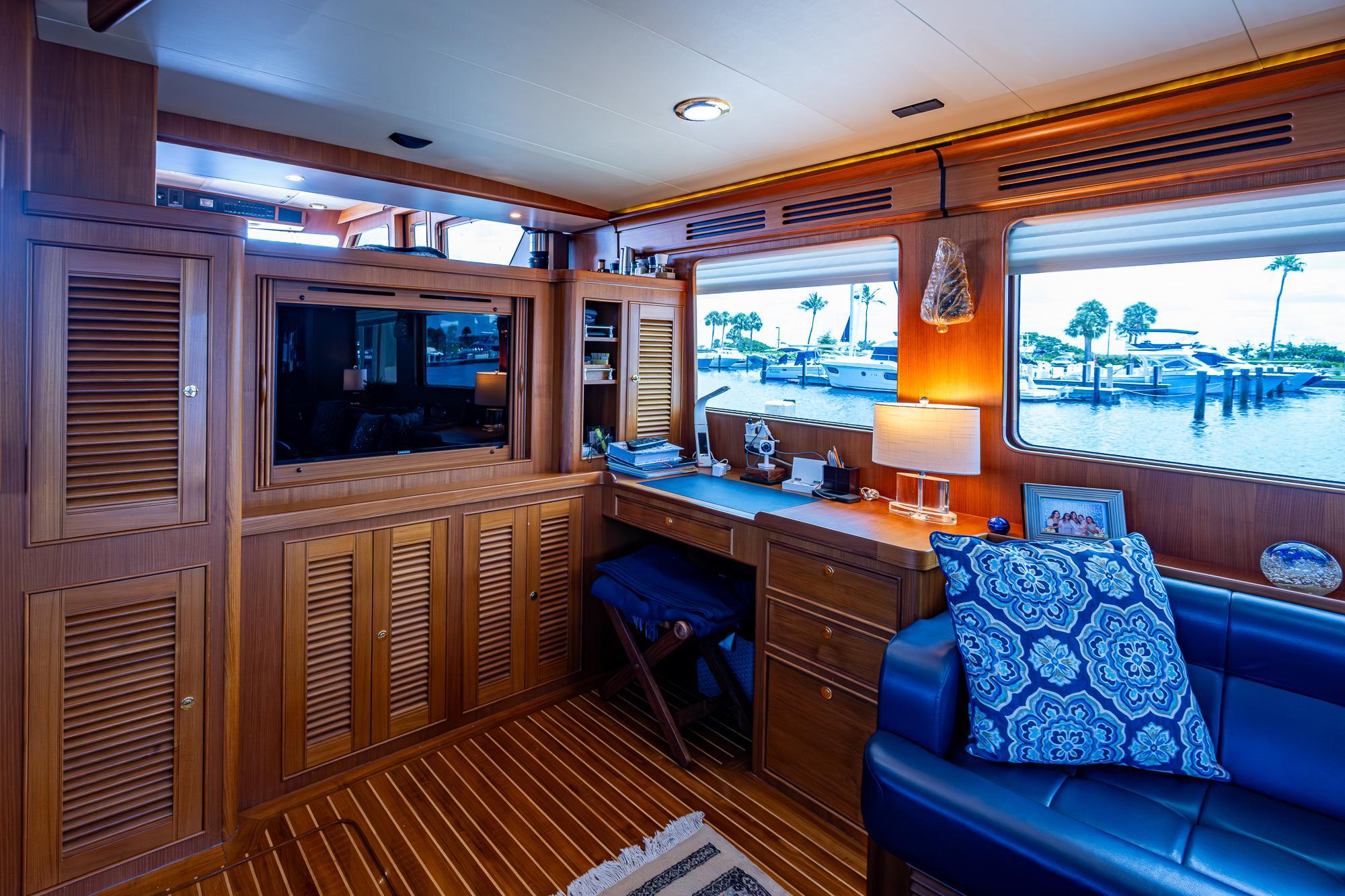 As you walk into the salon from the aft deck, you will be surrounded with the warmth of beautiful natural wood surrounds you everywhere. Gloss teak and holly adorn the floors throughout the interior. The salon is homelike, but still has character and club-like charm. Beautifully furnished and appointed, featuring details like glass and bottle storage, desk and drawers, and TV/entertainment center perfectly integrated into the wood cabinetry. Large windows let the light in, and feature privacy shades to keep the sun out.