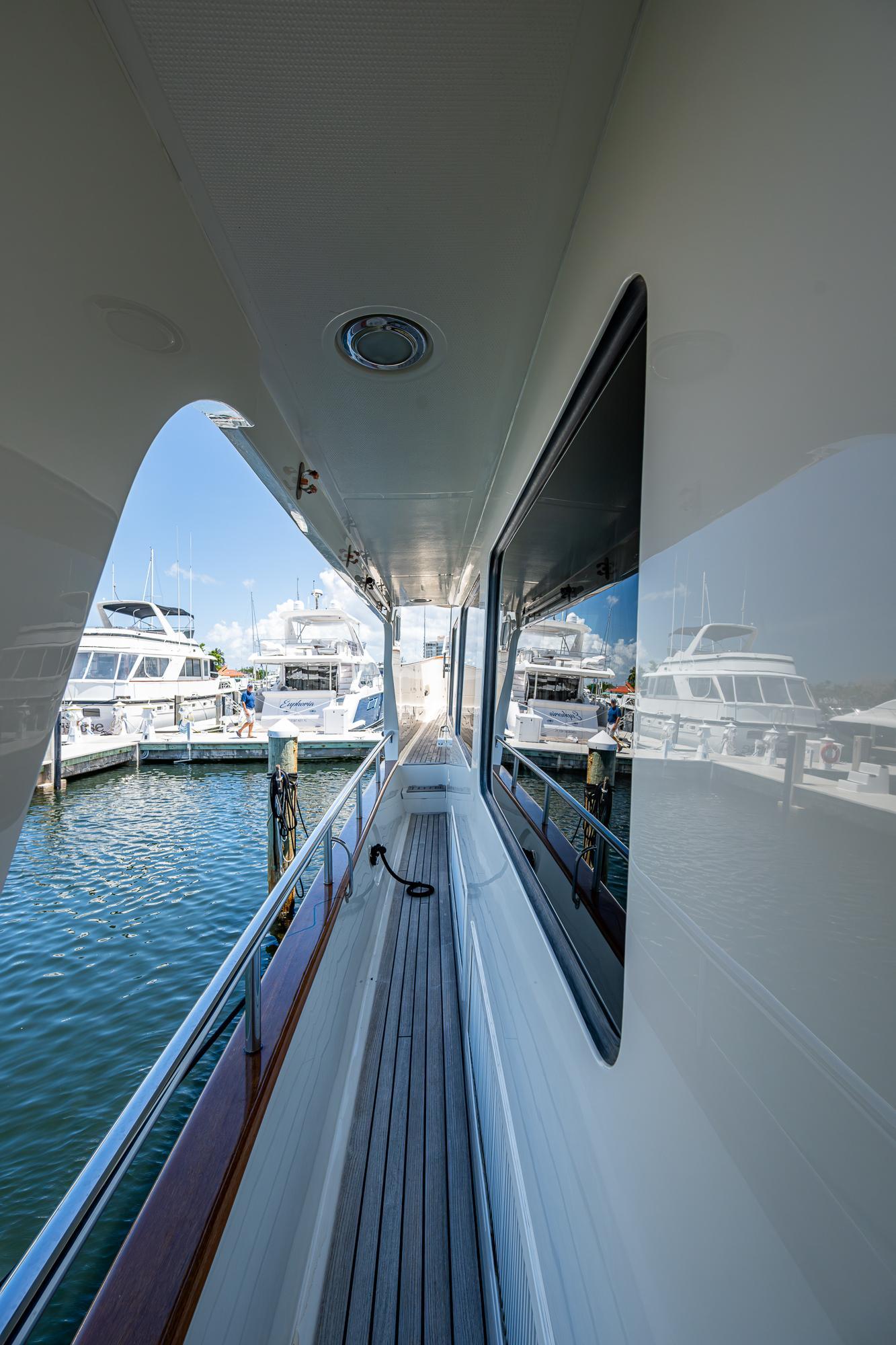 - Glass cabin trunk windows, companion doors at aft cockpit, sliding cantilever watertight pilot house doors, stainless framed hatches and windows on deck fore and aft meet fire codes NFPA 302.