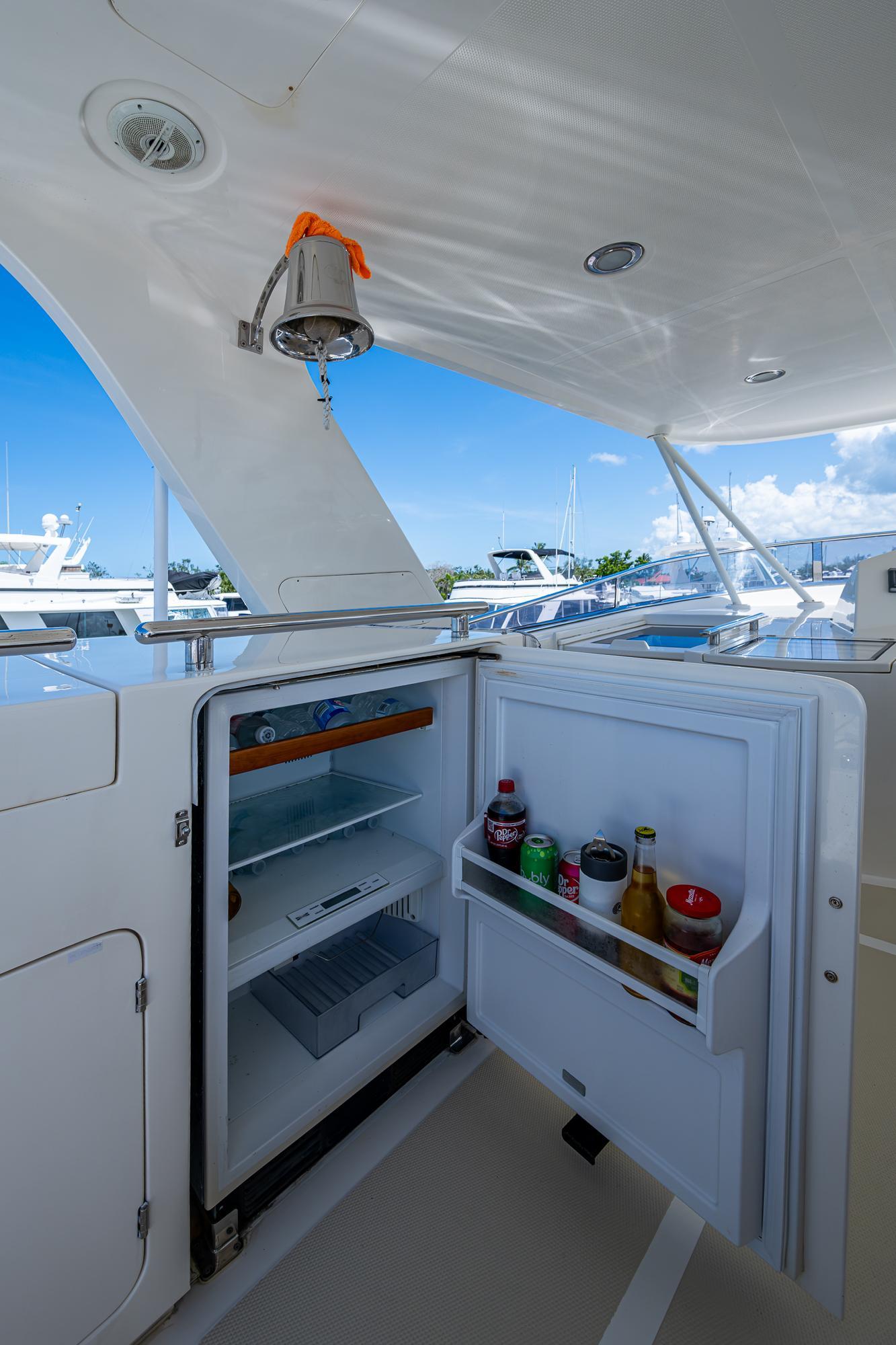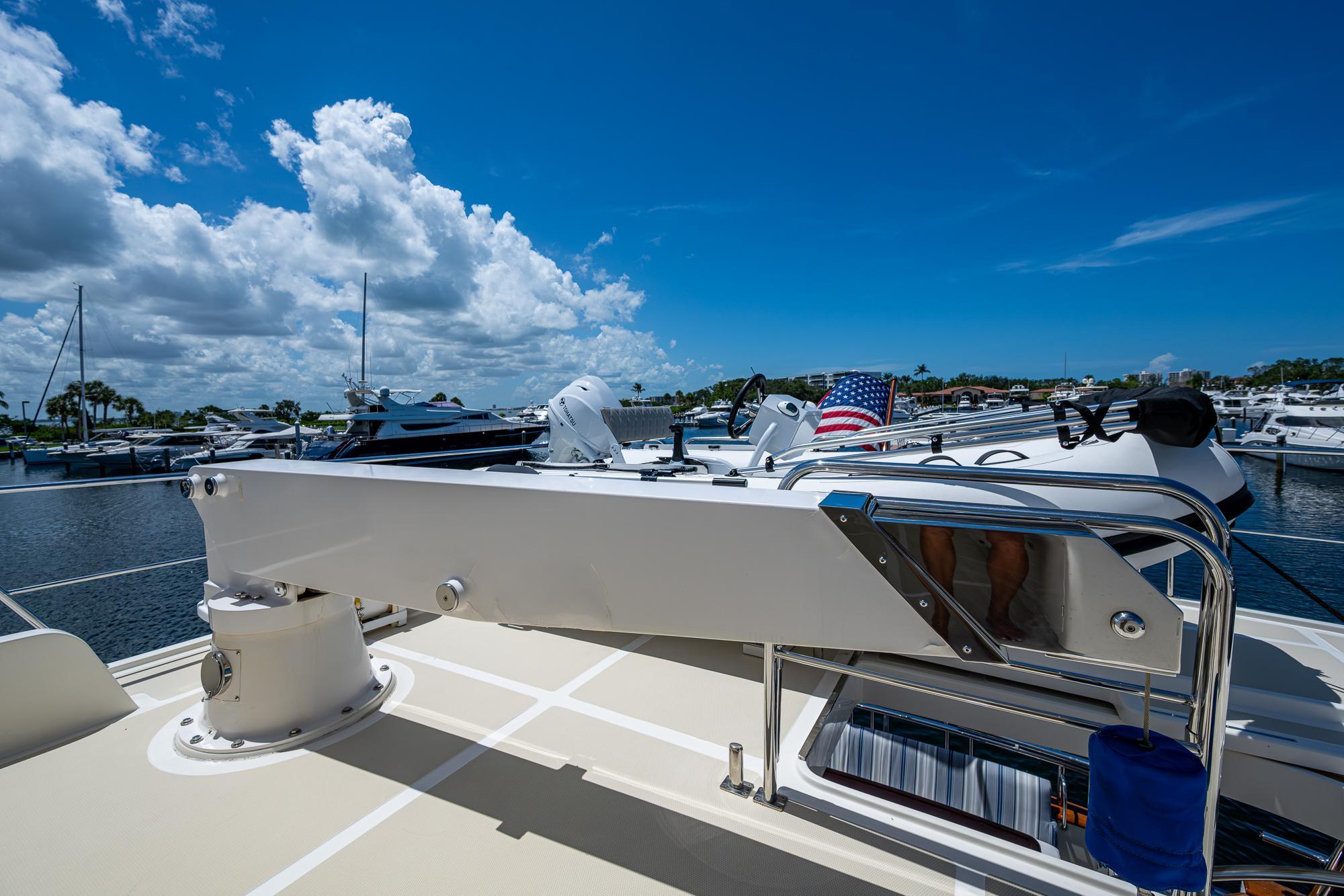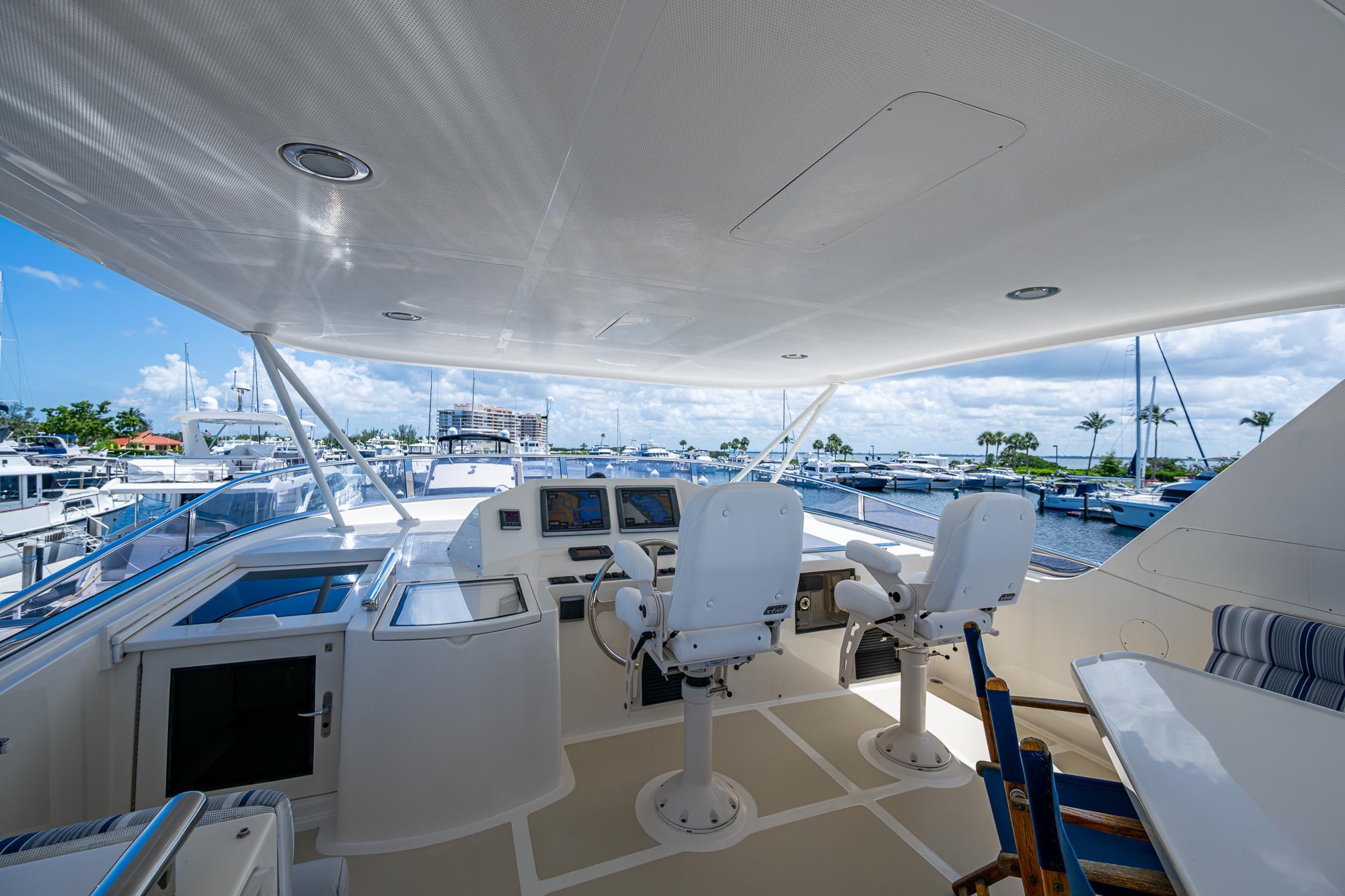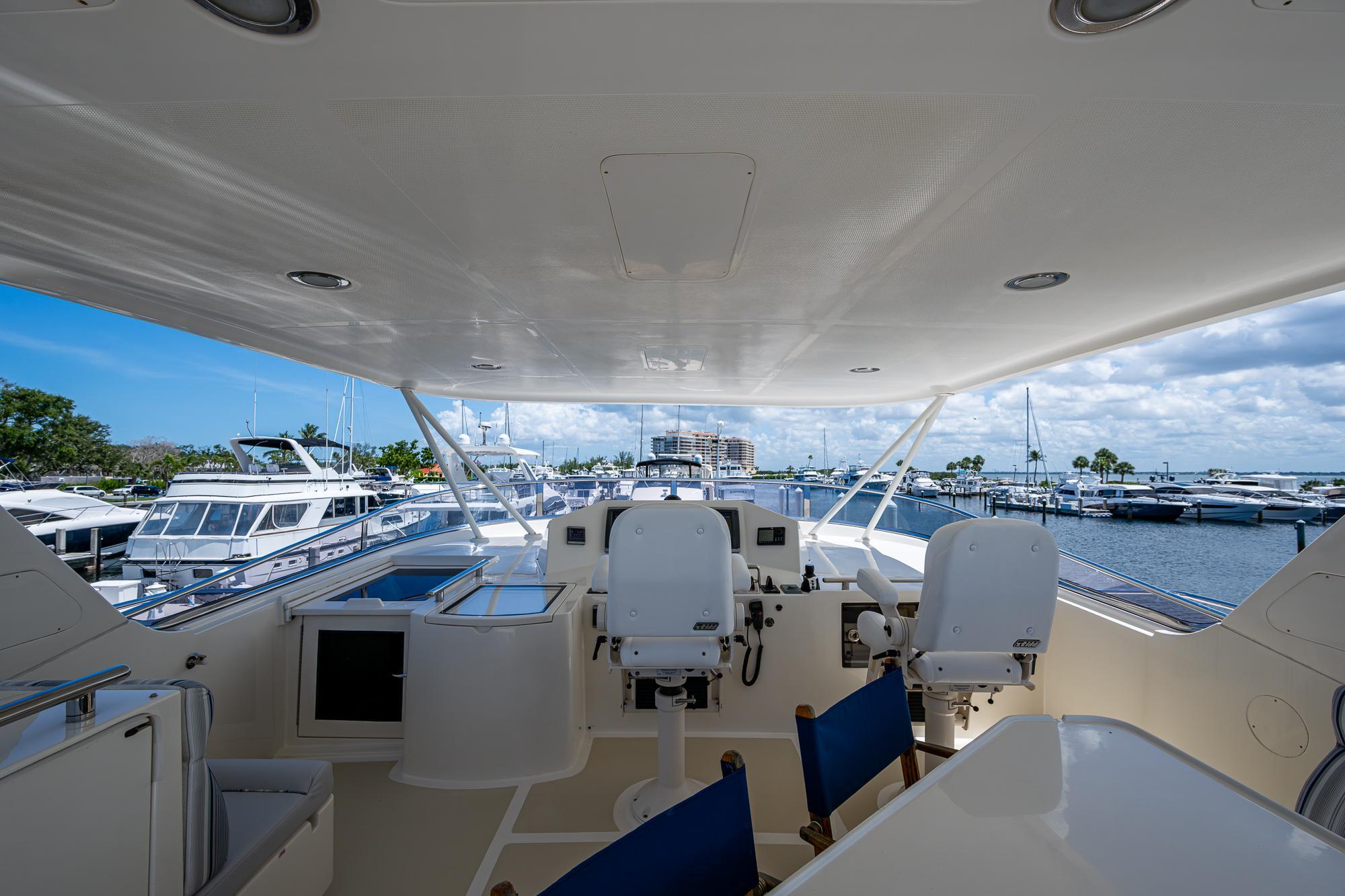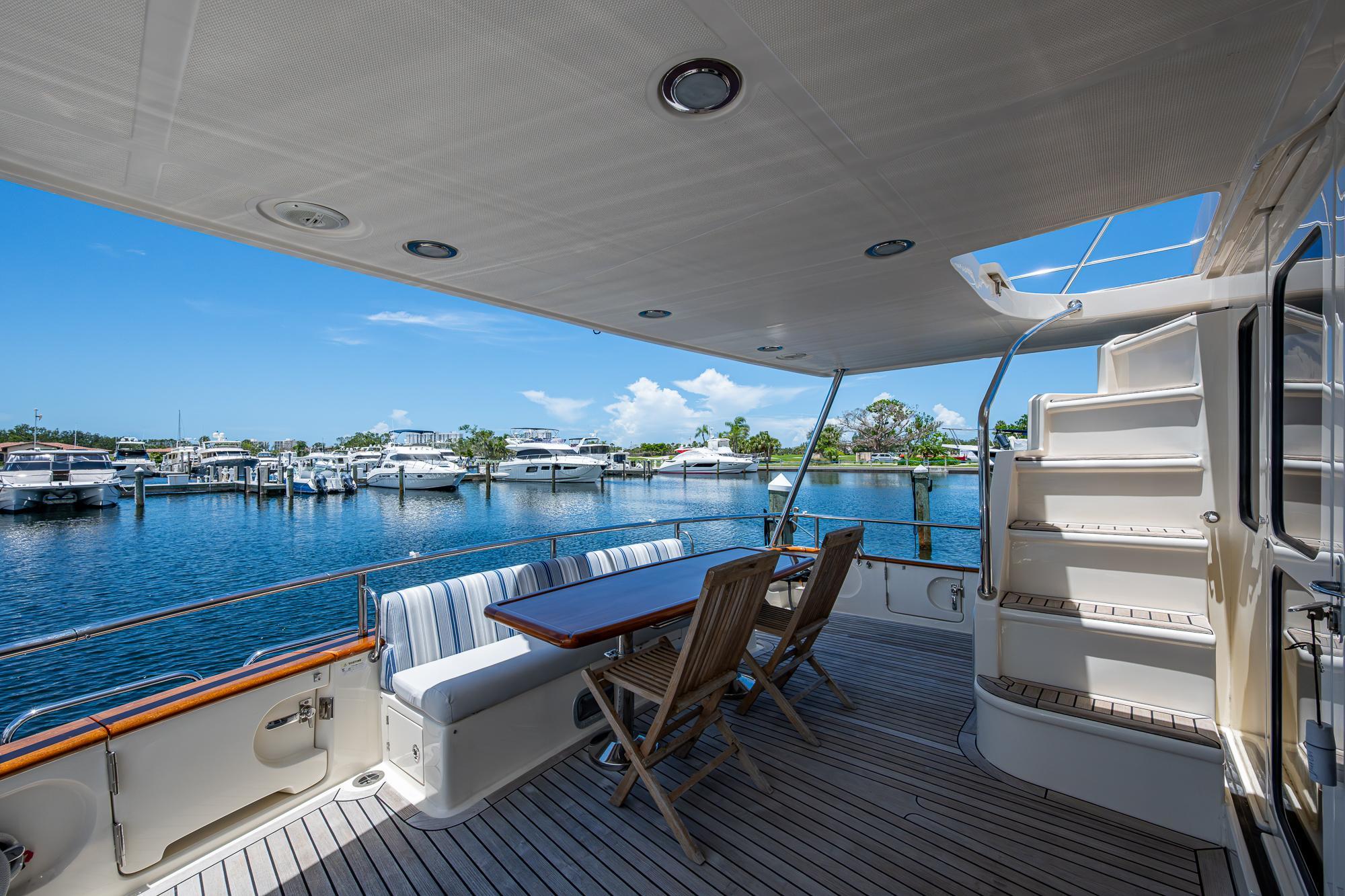 Easy bridge access is provided via the integrated stairway. Once on top, you will find the aft boat deck with tender (reserved) and large davit. Spacious lounge with seating for all of your friends and a large fiberglass table for dining. To port is the outdoor BBQ and large refrigerator. Canister life raft and Life sling are stored to starboard. A full compliment of Garmin electronics is at the bridge helm station.