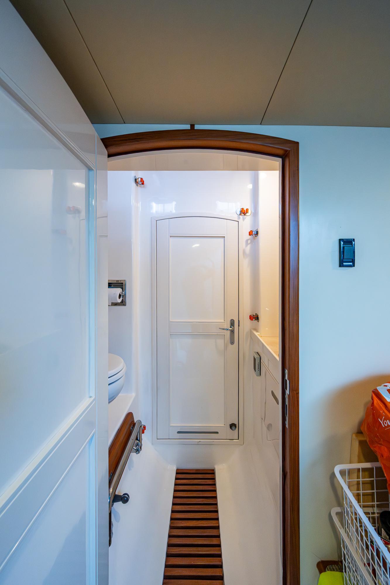 Descending into the lower gallery, the laundry is conveniently stored beneath a large double berth.