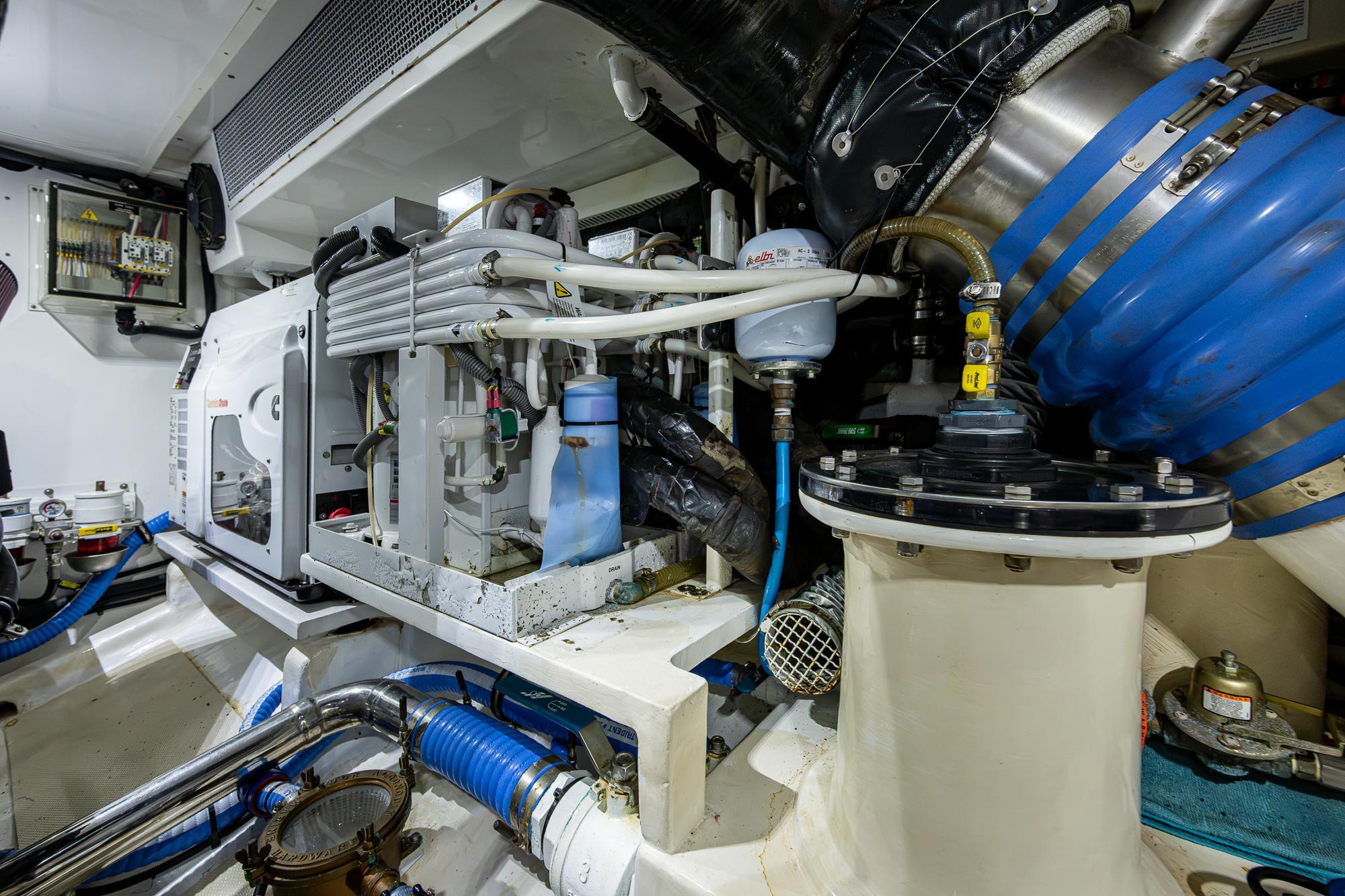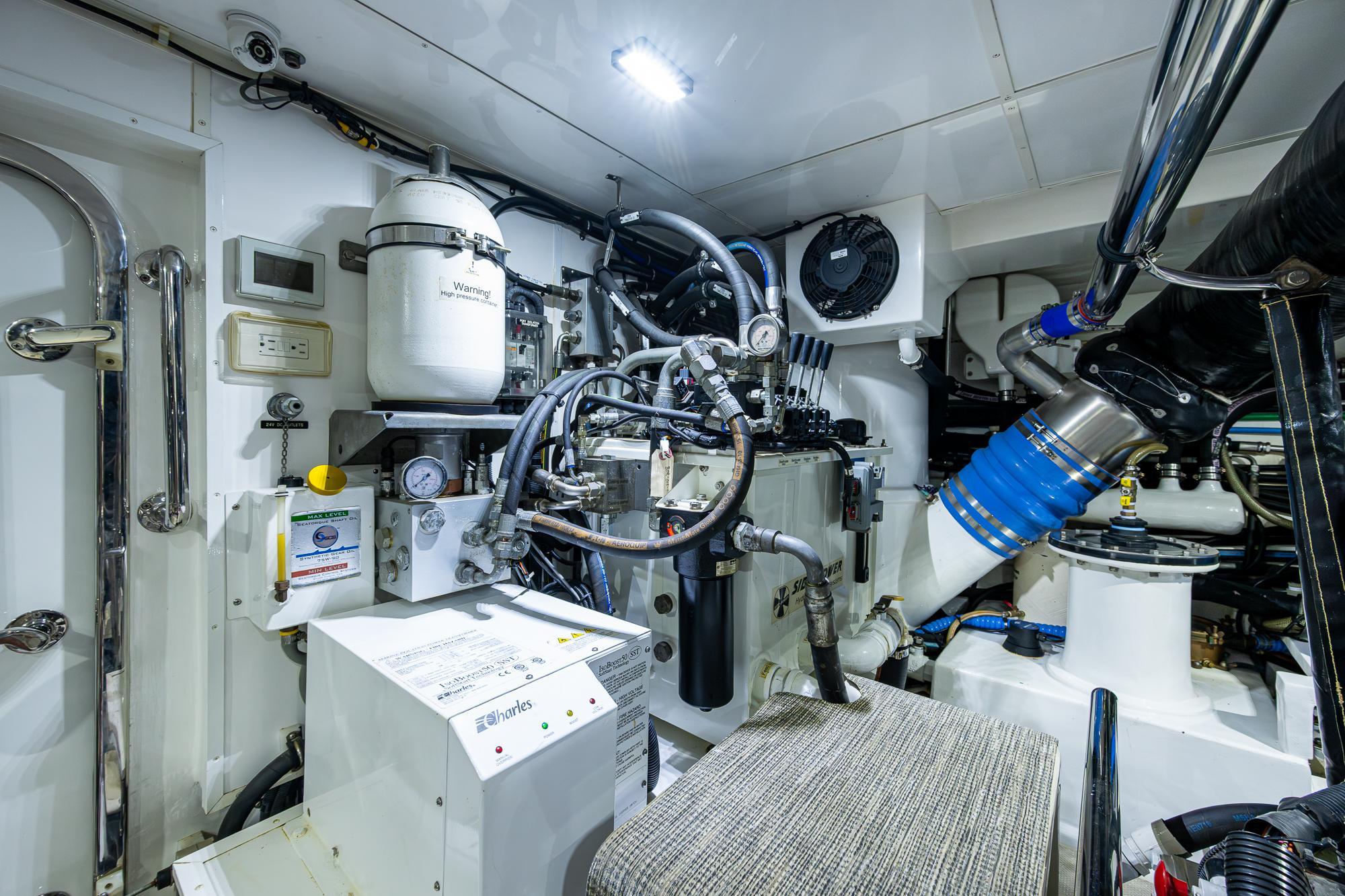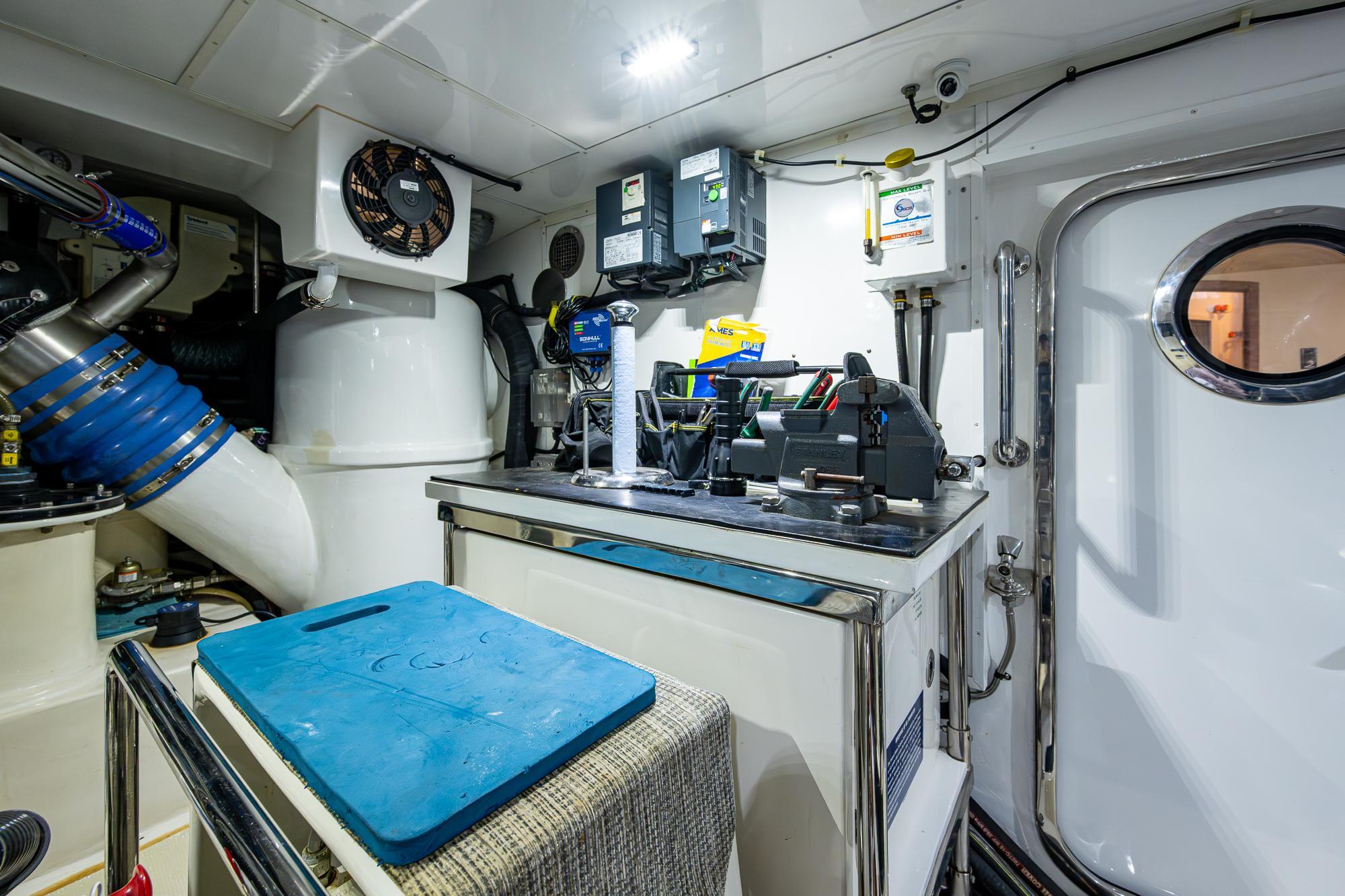 Along the port bulkhead, there is an access door that opens to stairs leading to the lazarette and machinery room below. Separating the aft lazerette is storage and room for two crew in separate bunks with a private head and shower. Aft is the secure lazarette with steering and rudder access. Forward of the lies the walk in engine room with tool chest, vice, the main power plants and twin generators. Two sea chests port and starboard provide raw water to the mains, generators and AC units. This in truly and engineers dream.