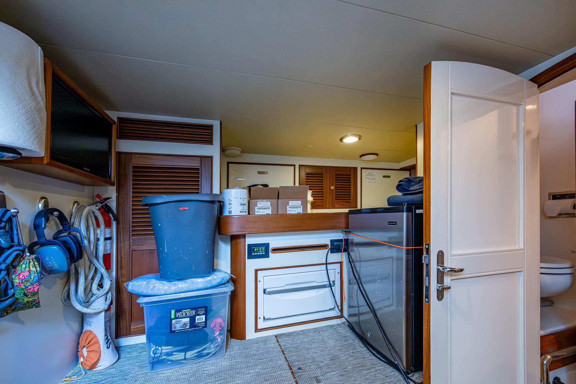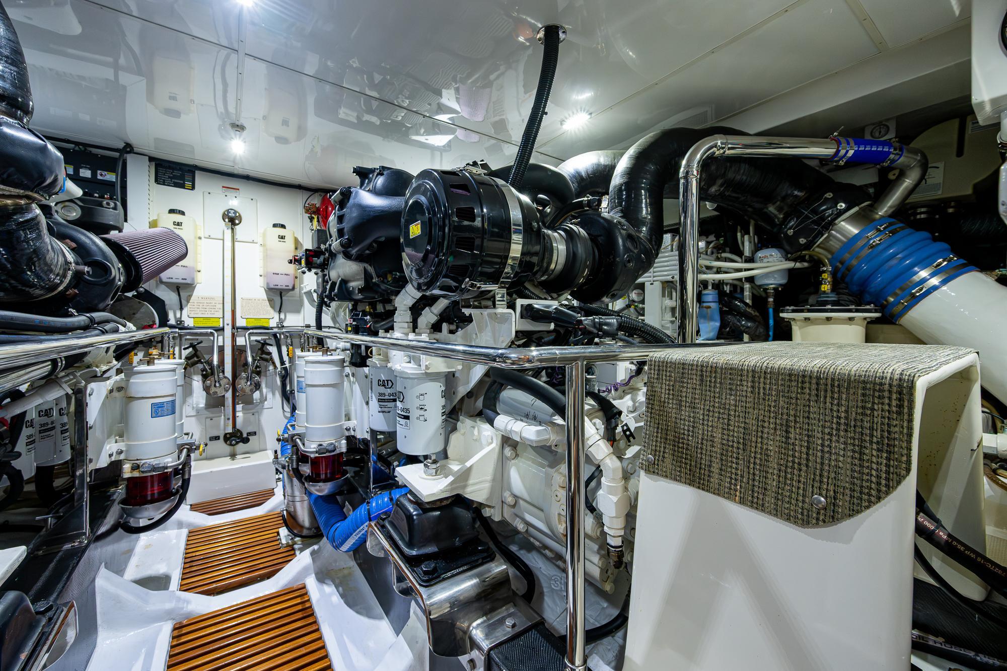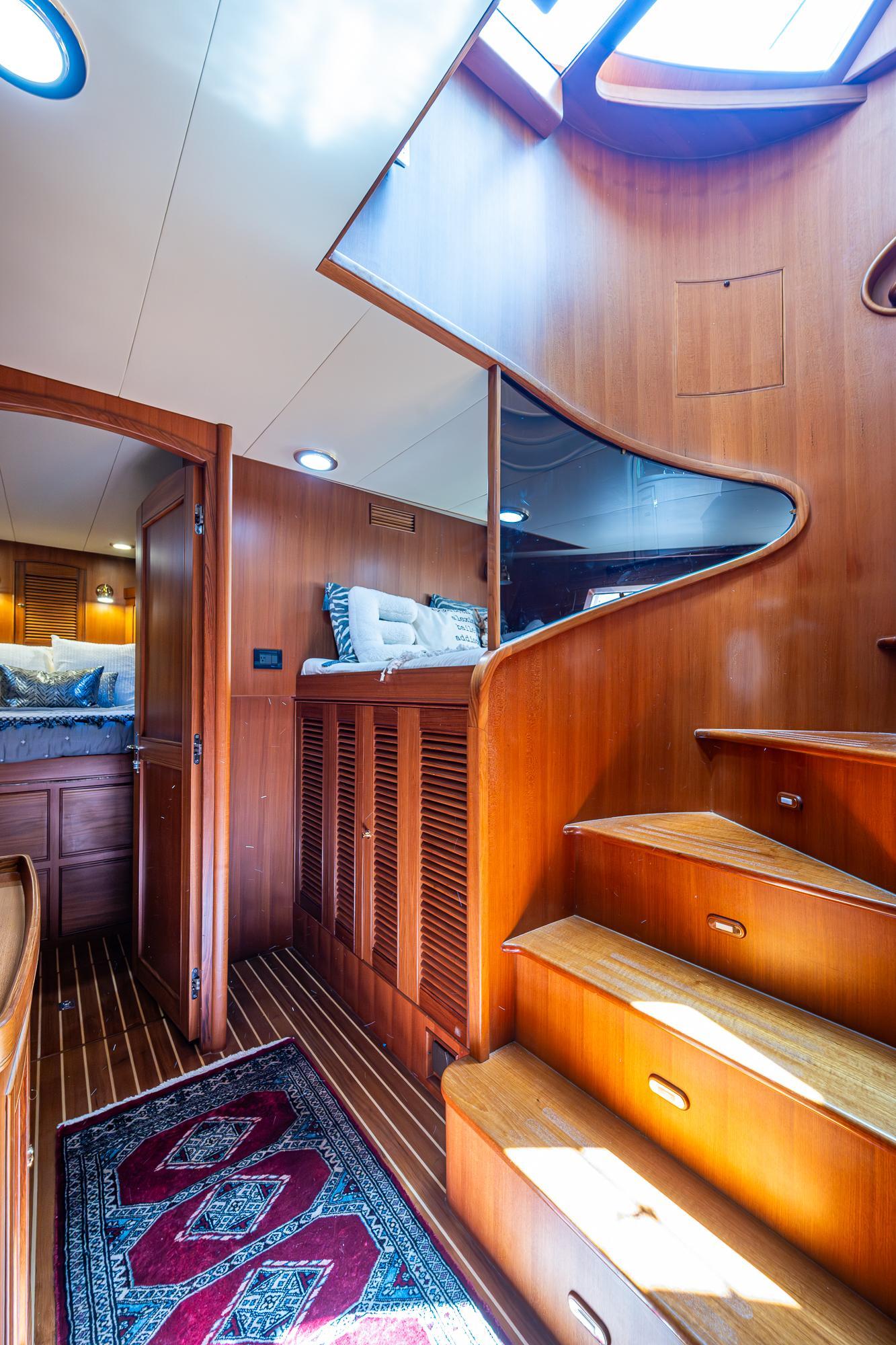 Along the port bulkhead, there is an access door that opens to stairs leading to the lazarette and machinery room below. Separating the aft lazerette is storage and room for two crew in separate bunks with a private head and shower. Aft is the secure lazarette with steering and rudder access. Forward of the lies the walk in engine room with tool chest, vice, the main power plants and twin generators. Two sea chests port and starboard provide raw water to the mains, generators and AC units. This in truly and engineers dream.