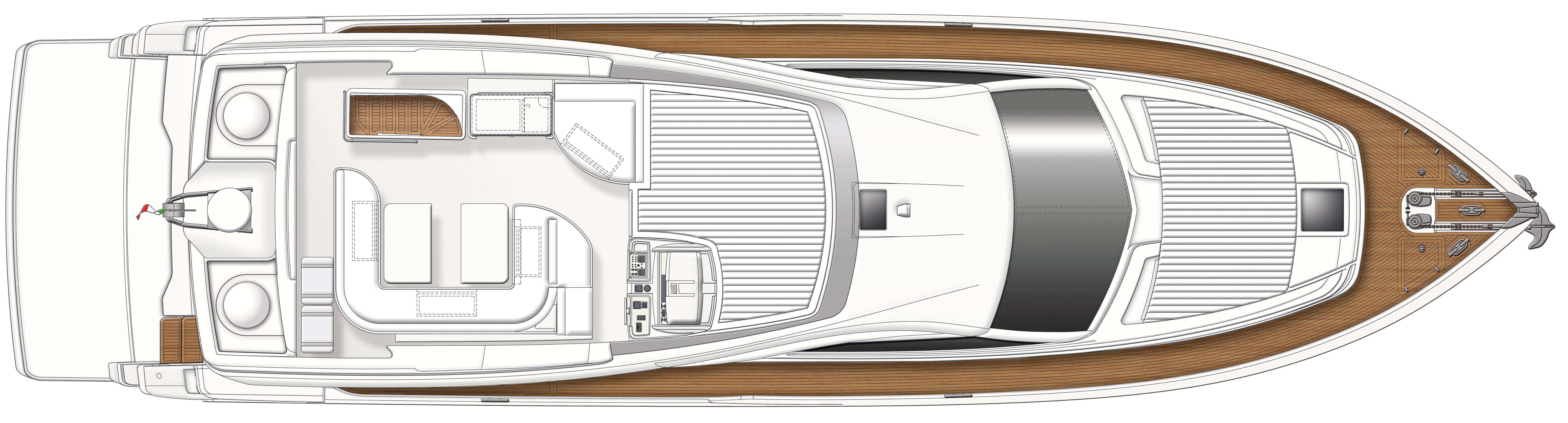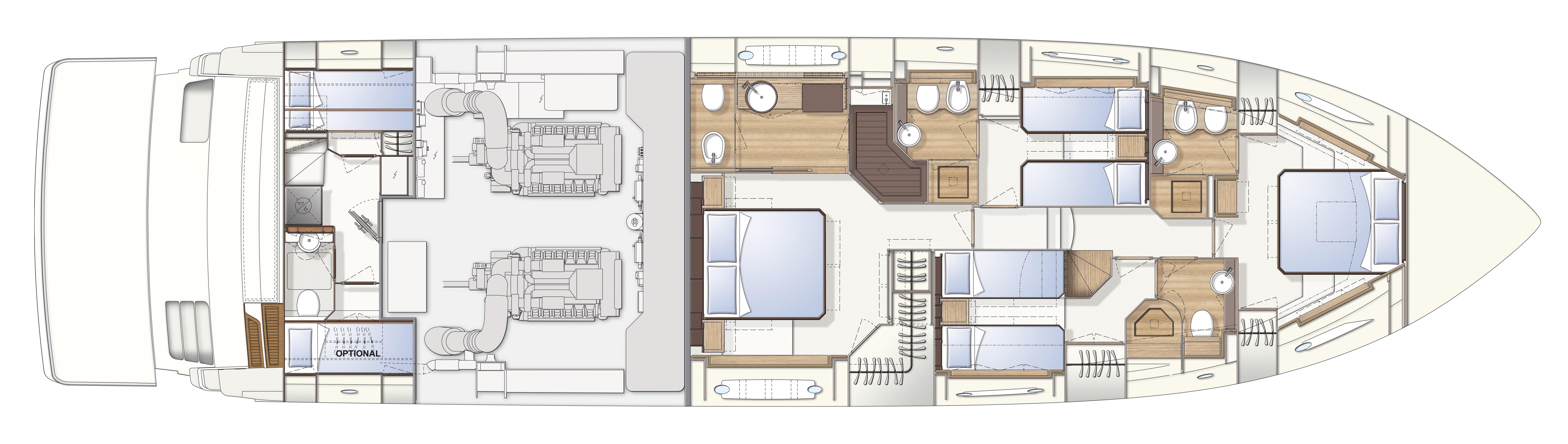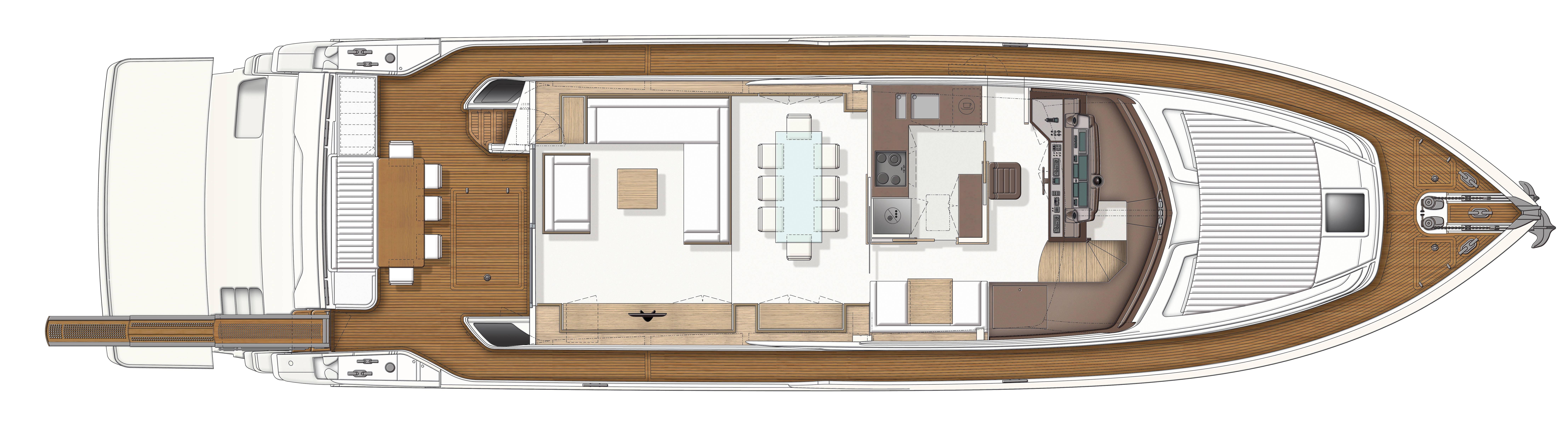 Ferretti Yachts 750 represents another step forward in the development of the Ferretti Yacht range over 70 feet, featuring a 22.75 m overall length and a 5.70 m full beam. Evolution of the successful Ferretti Yachts 720, it features many relevant innovations, both inside and outside. Result from the settled collaboration between Studio Zuccon International Project, AYT&D – Advanced Yacht Technology & Design and the Ferretti Group’s team of engineers, architects, and designers, Ferretti Yachts 750 immediately strikes the attention for its outer profile, which is even sleeker and sportier, thanks to the new flybridge with an elongated tail. The model will be presented in its standard version, without hard top; upon request, it can be equipped with a large bimini top, approximately 5 meter long. The flybridge is even more spacious, since it is davit-free. The sunbathing area of Ferretti Yachts 750 is available in other two versions, fitted with roll bar and built-in bimini top, or with hard top and awning. In the outer stern area the distinguishing feature is the electrohydraulic swim platform, more than 1.5 meter long. It can be lowered 50 cm underwater, making the launching of the tender easier. The swim platform can lift up to 450 kg and it can host a tender of approximately 4 meters. Ferretti Yachts 750 will be available with two different engines: two 1381 mph MTU 10V 2000 M84, or, as optional version, two 1524 mph MTU 10V 2000 M93. As for performance, with the standard engines the top speed is 30 knots, with a cruising speed of 27 knots, while with the optional engines, the maximum speed is 32.5 knots and the cruising speed is 29 knots.