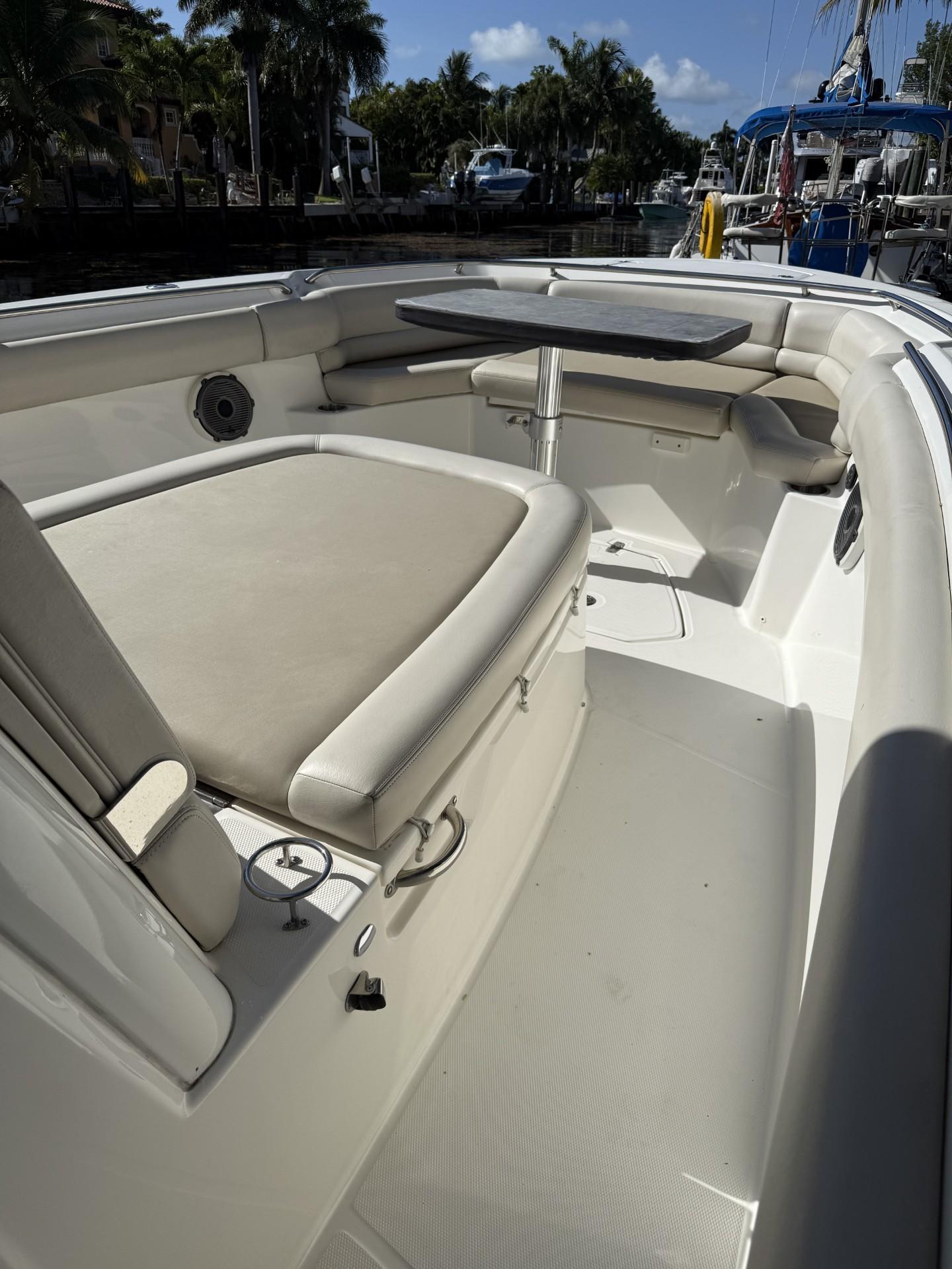 - Freshwater system (40 gallons) with sink in console, transom shower and anchor washdown