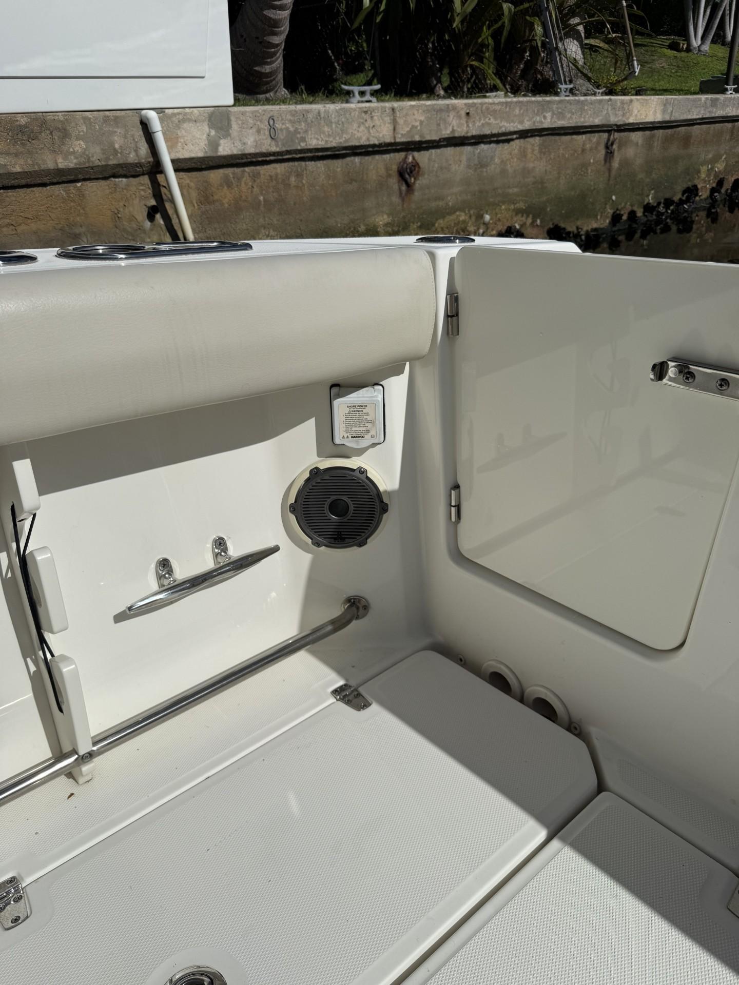 - Port aft storage at fishing prep area (can store a 5 gallon bucket)