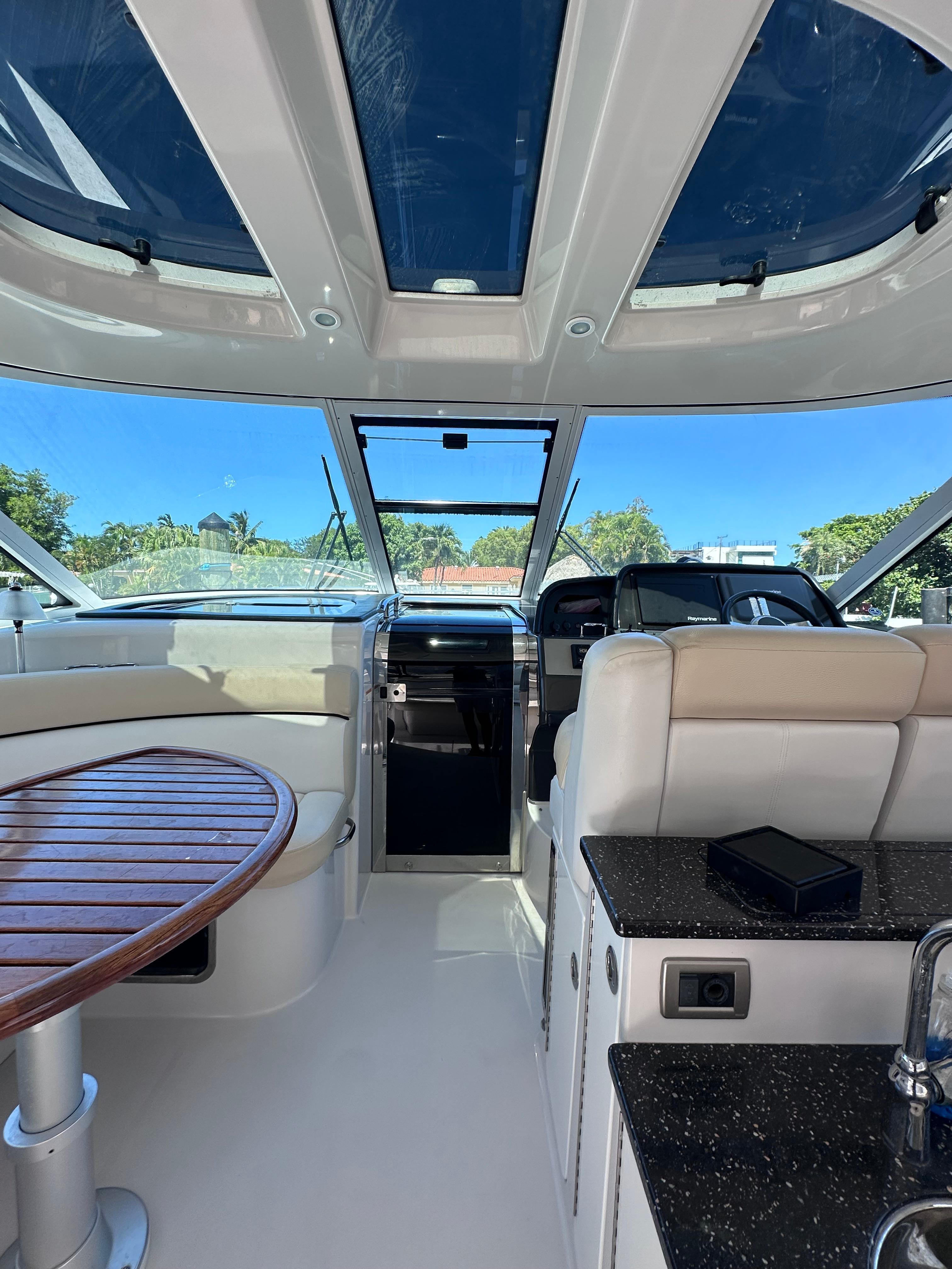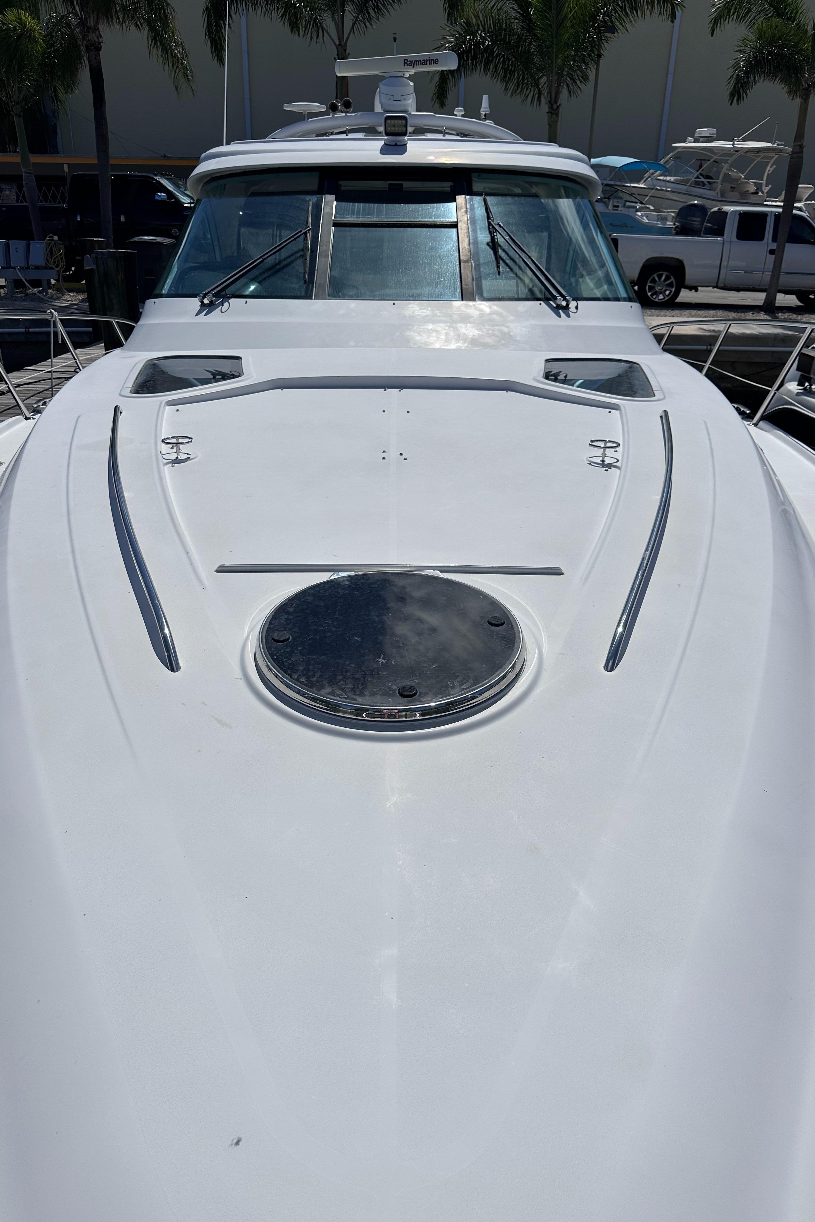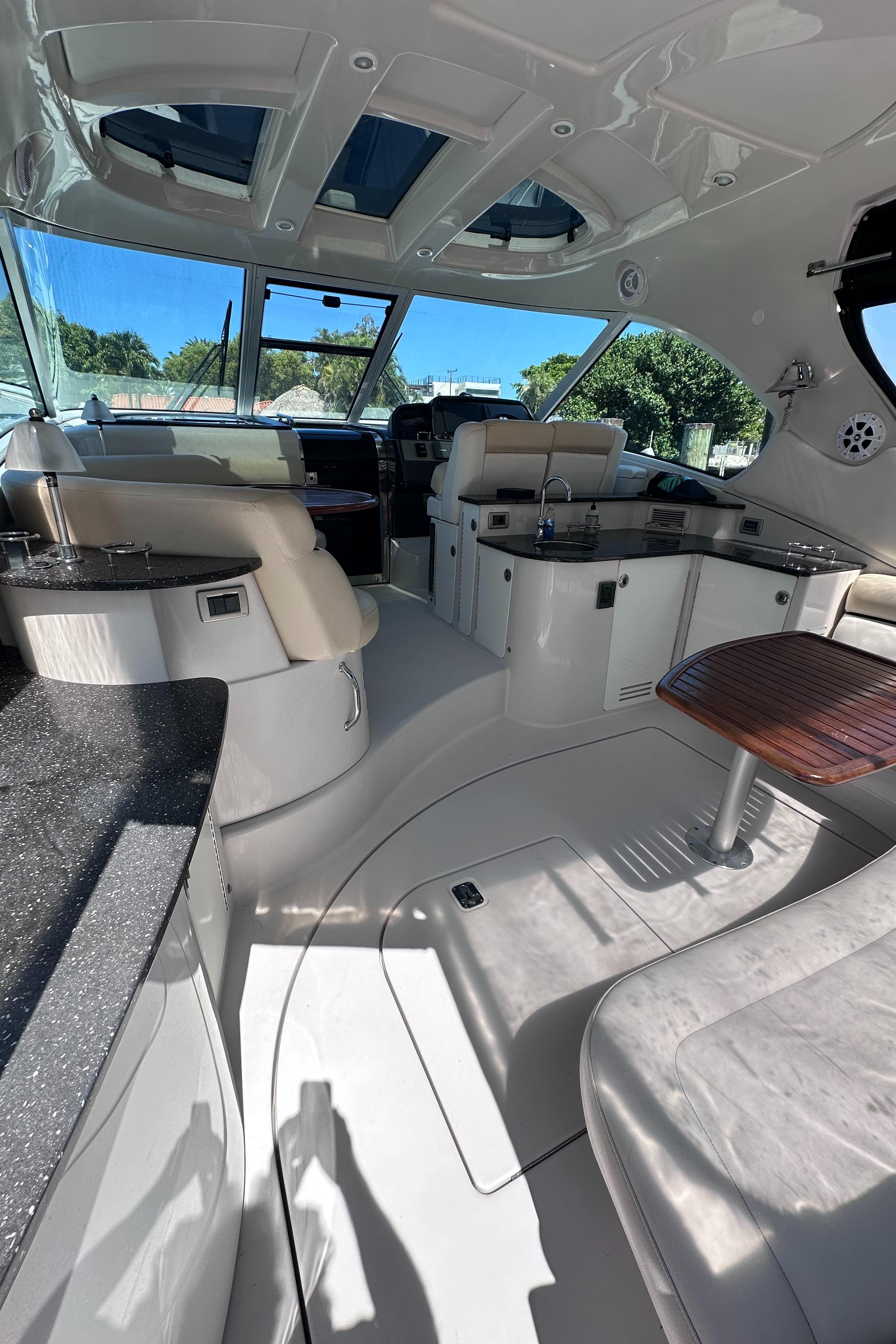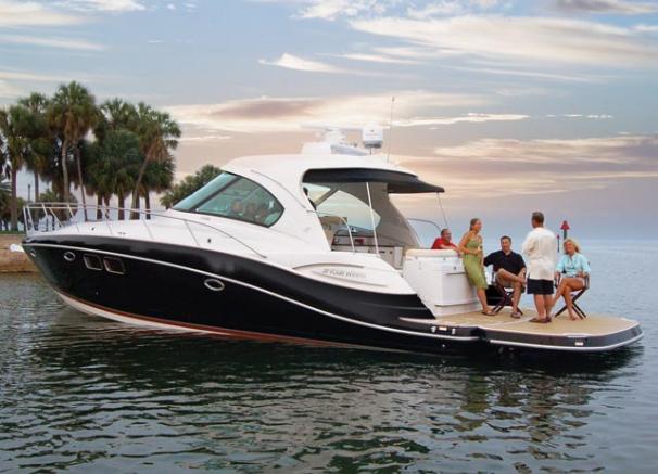 With generous space for many guests, seating in the V458 is spacious and intelligently-planned. A port dinette with removable table is spacious enough for dinner and easily converts to a lounge. The U-shaped stern seating is the ideal perch for sunseekers and a hot spot for socializing. Seats feature Aquaflex vinyl and convenient map pockets. Plus, on sticky summer days an 18,000 BTU air conditioner will moderate the heat for a more comfortable day of lounging. The cockpit includes sculpted marine carpet over the fiberglass liner. The V458 features a hard top with skylights, along with a vented center windshield. Custom-matched pillows are available, creating a warm, welcoming atmosphere from the first steps aboard. And, beautiful and functional Flexiteek flooring is available in the cockpit for an easy-clean and slip-resistant option that looks just like real teak. Built for entertaining, the V458?s on-deck refreshment center is the fast track for icy beverages and delectable snacks with its built-in blender, large solid-surface countertop, sink, refrigerator and icemaker. Of course, beverage holders are plentiful and made from stainless steel. The standard removable cockpit table is convenient for snacks and socializing. A flat screen cockpit television is another option for keeping abreast of the latest news and best in entertainment via the standard cable TV outlet. Beyond the natural music of the water, the V458 is equipped with a Sony AM/FM/CD stereo system. Sirius Satellite entertainment is also included with a complimentary six-month subscription.