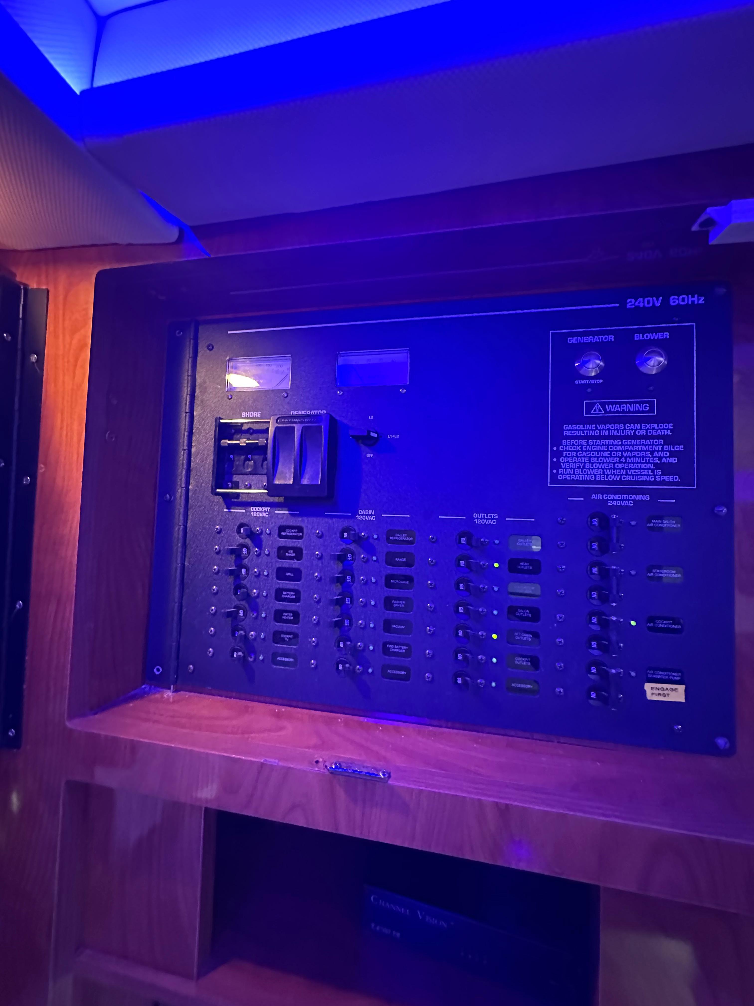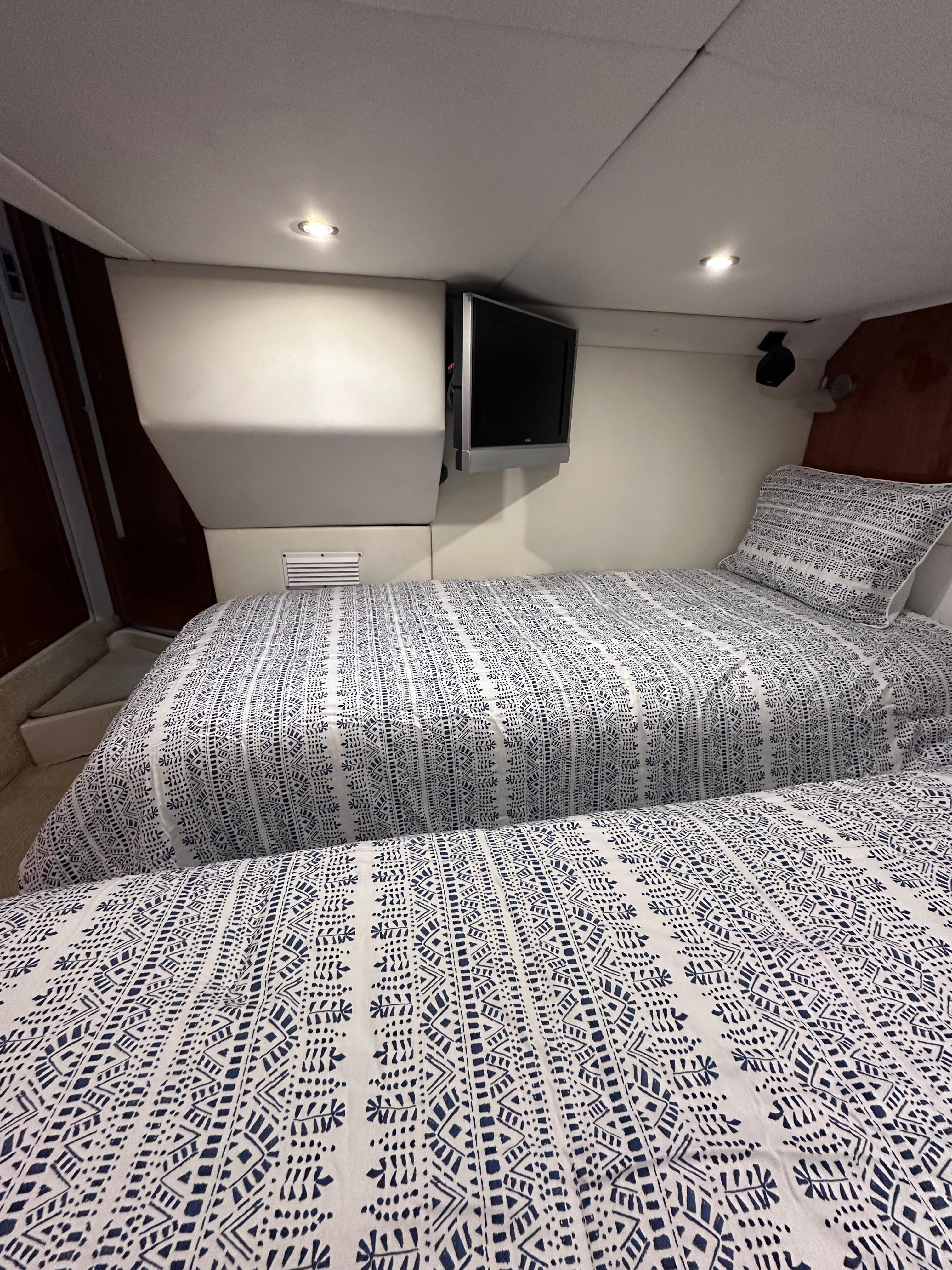 Additional DescriptionA few steps beyond the screen cabin door, the salon opens up to a spacious, well-appointed oasis. The dinette provides ample space for a comfortable family dinner, and with the adjustable-height table, the area can quickly be converted to a cocktail lounge. When there are extra guests, the dinette converts easily to a berth. The L-shaped galley is graced with generous solid-surface counter space and beautiful woodgrain cabinetry. Under-cabinet lighting makes coffee-making and meal prep a snap. The V458?s two-burner flush-mount stove, refrigerator/freezer, microwave, and trash receptacle are all discreetly mounted within the woodgrain encasements. Flooring in the galley area is beautiful teak and holly for easy clean-up. Two 16,000 BTU air conditioners keep the cabin cool and comfortable and safety is a given with the standard CO monitor. And when entertainment is in order, the salon boasts a wide screen TV and Bose® surround sound. Private spaces add to the homelike feel of the V458. Four Winns designed a forward stateroom with widescreen TV as a standard master suite. It is complete with a raised berth with innerspring mattress, overhead lighting, and under-berth storage. Mid cabin is also a private stateroom that comfortably sleeps two guests in oversized twin berths that can be joined with fill-in cushions. There is a TV with DVD player, and a workstation desk that does double duty with generous storage in its dresser drawers. Storage is also plentiful in the cedar-lined hanging locker and beneath cushions. Particularly useful during a long voyage is the optional washer and dryer combination located mid cabin. The cabin?s multi-zone lighting and window system sets the mood for entertaining and allows for isolated lighting. Window blinds are included in the salon. Plus, iPod/MP3 ports at the cockpit and cabin add to the V458?s easy entertaining capacity - to listen to a favorite music collection, or charge a cell phone with the 12-volt chargers. The V458 boasts a master head with separate shower area, along with a mid cabin head and shower. The master head and shower?s spacious design and function are added luxuries, equipped with a sanitation system, and separated hot water shower. The solid-surface vanity and sink are surrounded by plenty of storage, power receptacle, and a towel rack; all illuminated with overhead lighting. Ventilation is no problem with the screened port light and power ventilation fan. Tank level indicators in the cabin help to ensure fresh water and waste are attended to as needed. At mid cabin, an additional head is similarly-equipped for guests with a sanitation system, shower, solid surface vanity with sink, storage, mirror and towel rack.