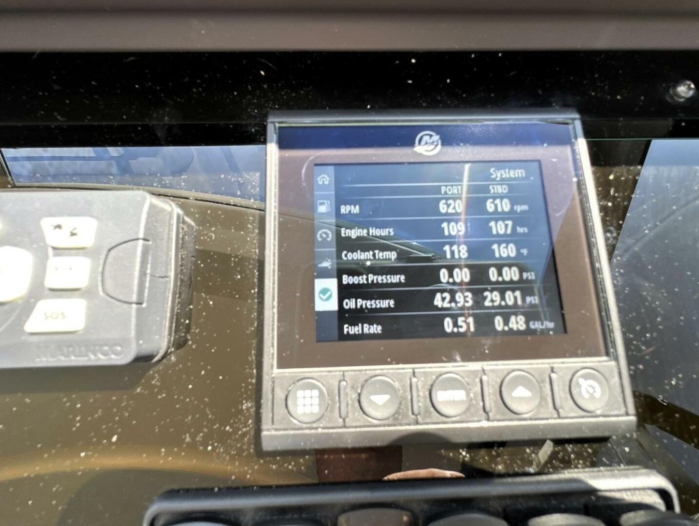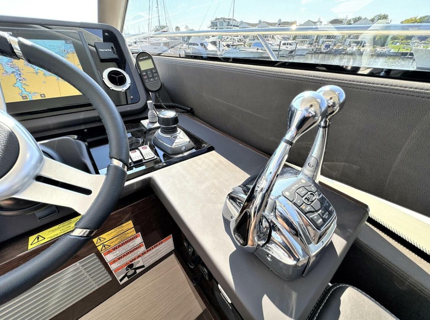 - Helm console with engine throttles and maneuvering joystick, full engine instrumentation, compass and cup holders