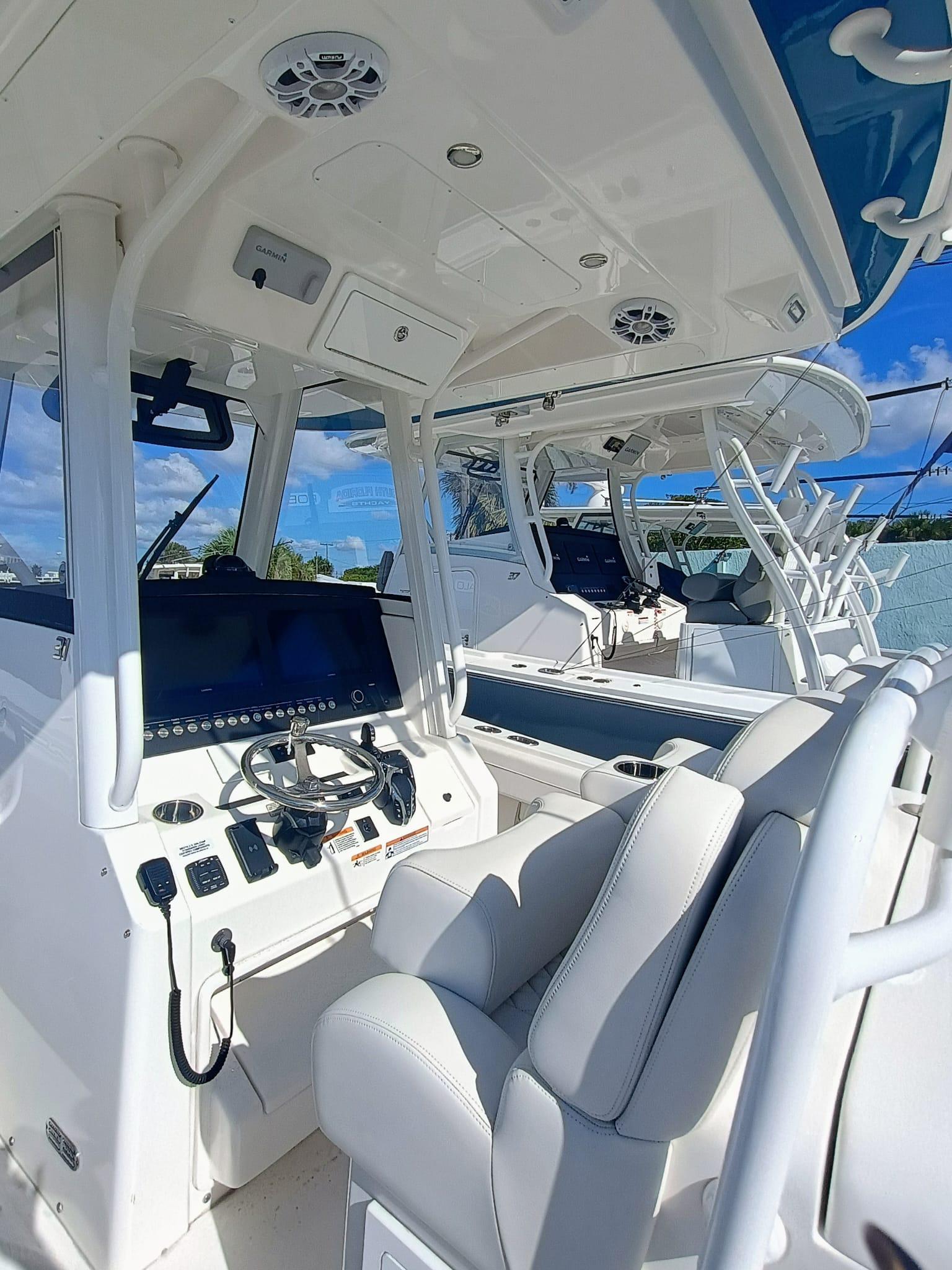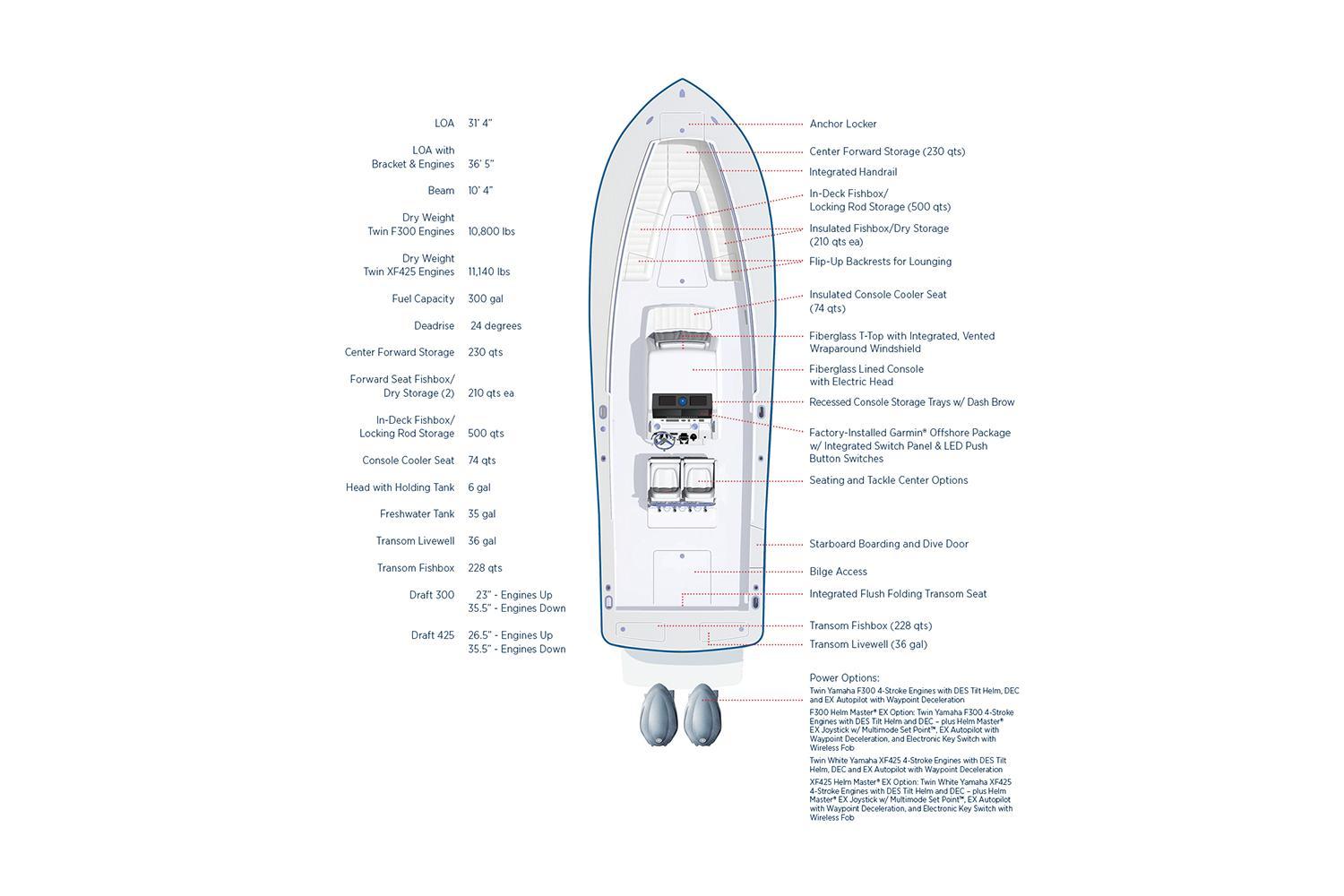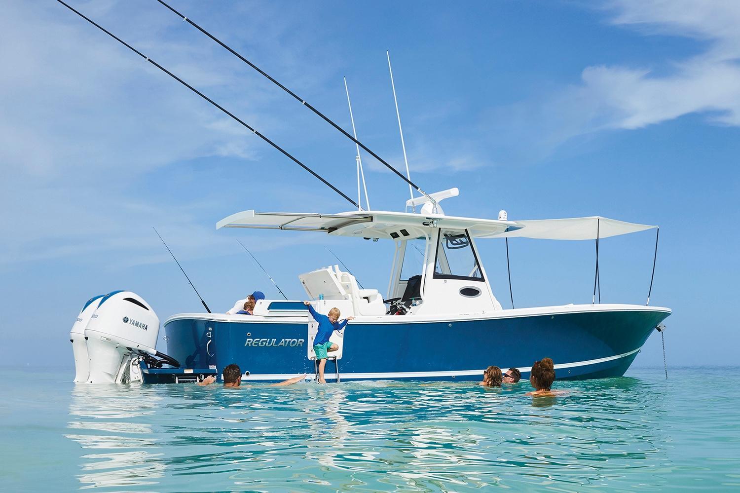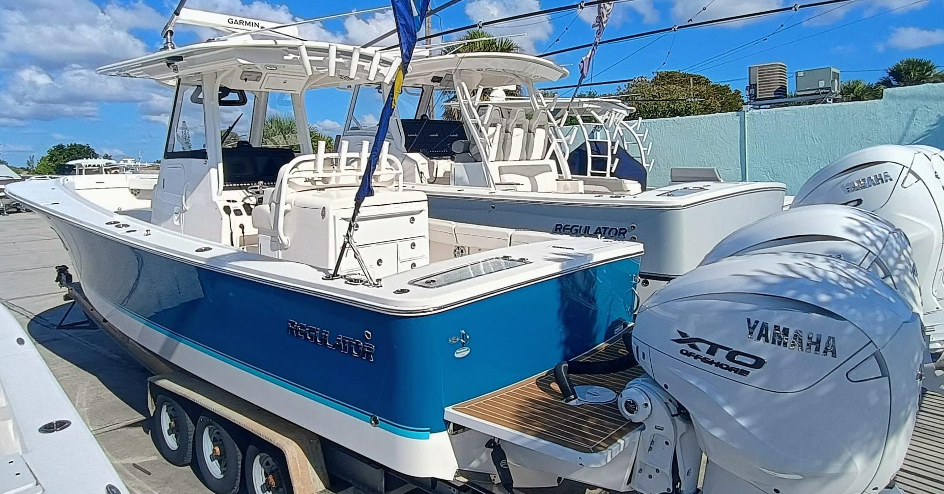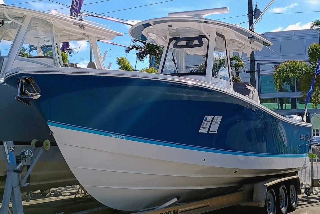 Welcome aboard the fastest boat in our fleet – reaching top speeds of 64 MPH when you opt for twin Yamaha 450s, the Regulator 31 overdelivers at every turn. Yamaha Helm Master® EX option gives you the power and flexibility to handle beautifully in any waters. Ready to fish? The massive cockpit, oversized tackle center, fishbox/livewell action, and optional Taco® Grand Slam 390 outrigger bases with 20’ Carbon Fiber telescoping poles deliver everything you need for a serious day of sportfishing. Upgrade to the 3X Deluxe Mezzanine Tackle Center for additional seating, storage, and dual-flanking rocket launchers that keep your rods at hand when the bite is hot. No matter how you outfit your ride, you’ll have plenty of deck space and offshore comforts including the starboard boarding and dive door, flip-up forward seat backrests, and optional forward sun shade and cockpit SureShade® to keep you cool in any waters.CONSOLE• Fiberglass T-Top with Surfboard Edges, Electronics Box,• Integrated Navigation/Dock Lighting, Spreader Lights,• and Multi-Colored LED Lights – Complete with Integrated, Vented• Wraparound Windshield and Windshield Wiper/Washer• White Powder Coat Package• Factory Installed Garmin® Offshore Package:• Two 16" GPSMAP® 8616 XSV Multi-Touch Widescreen• Chartplotter/Sonar Displays, VHF 215 AIS Radio• with Dual 8' Antennas, GMR™ 424 xHD 4kW Open-Array Radar,• Airmar® B275LHW with Wide Beam 1kW CHIRP Transducer• and Yamaha EX Autopilot, Plus Black Flushmount• Electronics Face and Remote Mic• Yamaha Next Generation Digital Boat Control System• with Tilt Helm Digital Electric Steering (DES), Multifunction• Digital Electronic Control (DEC), EX Autopilot with Waypoint• Deceleration, and CL5™ Multifunction Touchscreen Display• Ritchie® SuperSport Compass• Fusion® Apollo 770 Marine Stereo with AM/FM/WB, SiriusXM®• Ready, Wi-Fi Audio Streaming, Apple AirPlay 2, Bluetooth®,• with Integrated DSP and (4) Backlit Speakers• NEW Siren Trident with Siren 3 Pro• EZ-View Flushmount Electronic Mounting Face• with Access in Head Compartment• Triple Battery System with Switches and Marine Batteries• Illuminated Glove Box with Fiberglass Lid• Recessed Upholstered Console Storage Trays with Dash Brow• Integrated Switch Panel with Stainless LED Push Button Switches• 74 qt. Insulated Cooler Under Forward Console Seat• Vented Port Light in Console• Stand-Up Head Compartment with Electric Head,• 6 gal. Holding Tank, Interior Lighting, Mirror,• and Electric Tank Pumpout• Recessed Comfort Footrest with Storage Access• Vertical Rod Holders (6)• Solid Surface Countertop with Sink• Chilewich Flooring in Console• Stainless Wheel w/ Knob• USB Charging PortsDECK AND COCKPIT• 360° Coaming Pads• Stainless Steel 14X18 Trim Tabs with Indicator Switch• Cockpit Lighting• Bilge Pump with Automatic Float Switch• Pull Up Bow Cleats• Springline and Cockpit Cleats with Hawse Pipes• Stainless Steel Hardware Through-Bolted with Elastic Stop Nuts• Stainless Steel Transom Handrails• Molded Non-Skid Horizontal Surfaces• Engine Bracket with Ladder• 230 qt Forward Center Dry Storage Compartment• Forward Deck Anchor Locker with Anchor Rode & Overboard Drain• Stainless Steel Scuppers• Starboard Boarding and Dive Door with Removable Folding Ladder• USB Charging Ports in Forward Seating AreaSEATING AND FISHING EQUIPMENT• Forward Seating with Flip-Up Backrests (2)• Upholstered Forward Console Seating for Two• Integrated Flush Folding Transom Seat• 3X Deluxe Tackle Center: Helm Upholstered Companion• Seating with Armrests and Flip-Up Bolsters with Individual Folding• Footrests with SoftGrip Foot Rail; Seatback with Cup Holders and• Rocket Launcher; (6) Medium Plano Trays;• (2) Tackle Drawers in Cabinet• Insulated, Illuminated Forward Fishboxes (2)• Raw Water Wash Down and Livewell Plumbing• In-Deck Illuminated, Macerated Fishbox/Locking Rod Storage• 35 gal. Freshwater System with Wash Down and Transom Shower• (6) Stainless Steel Aft Gunwale Conventional Rod Holders• Power: Twin White Yamaha XTO Offshore® 450 4-Stroke Engines with DES Tilt Helm and DEC – Plus Helm Master® EX Joystick w/ Multimode Set Point™ and EX Autopilot with Waypoint Deceleration• Color Options: Featured Hull Color – Sides Only• 1a Color Choices: Laguna Blue• Armstrong Bracket White Armstrong Bracket• Bracket Options Synthetic Teak Marine Decking for Bracket• Fiberglass T-Top