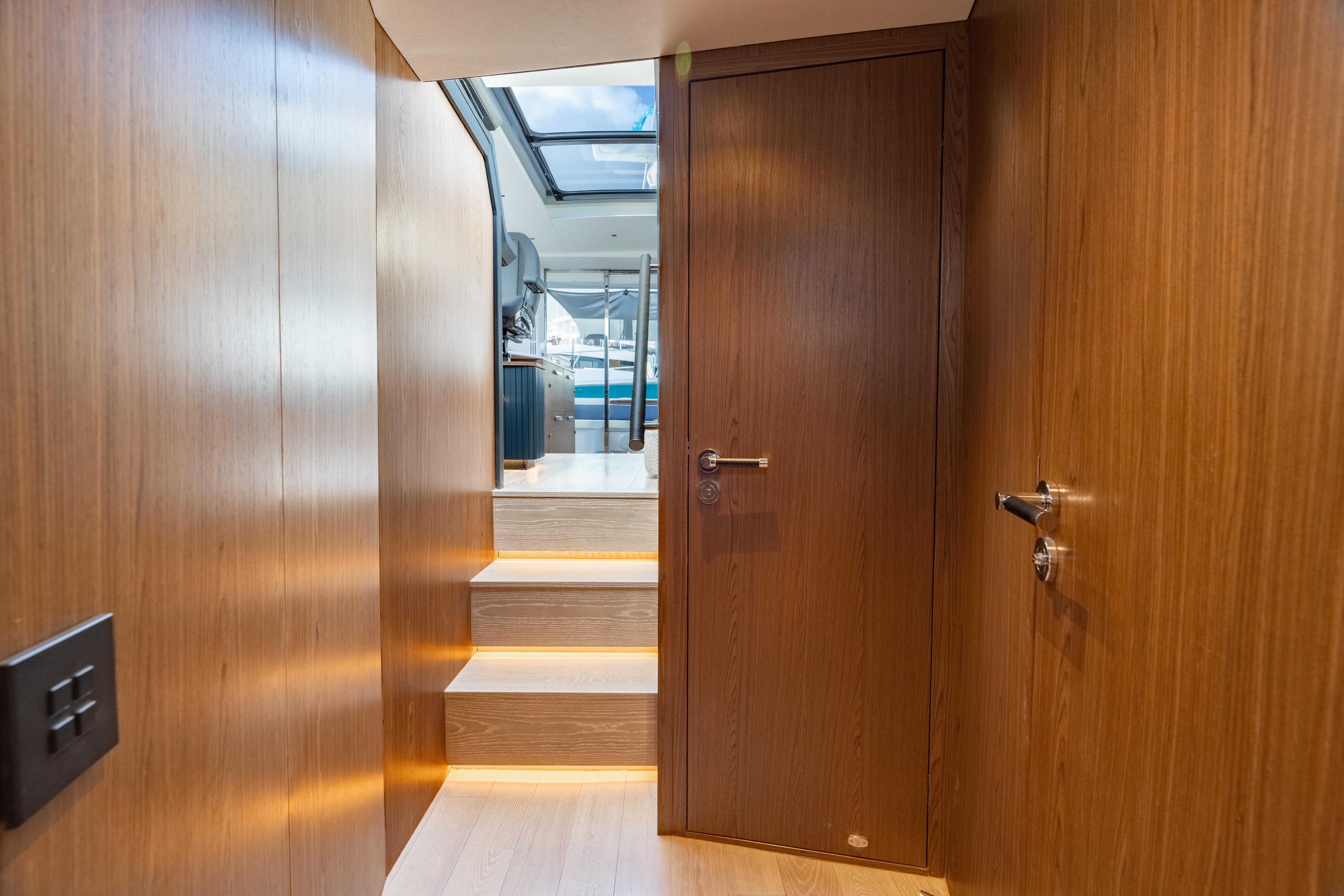 - Custom hinged or vertically sliding aft salon window, with polished stainless-steel trim, to create seamless entertainment spaces