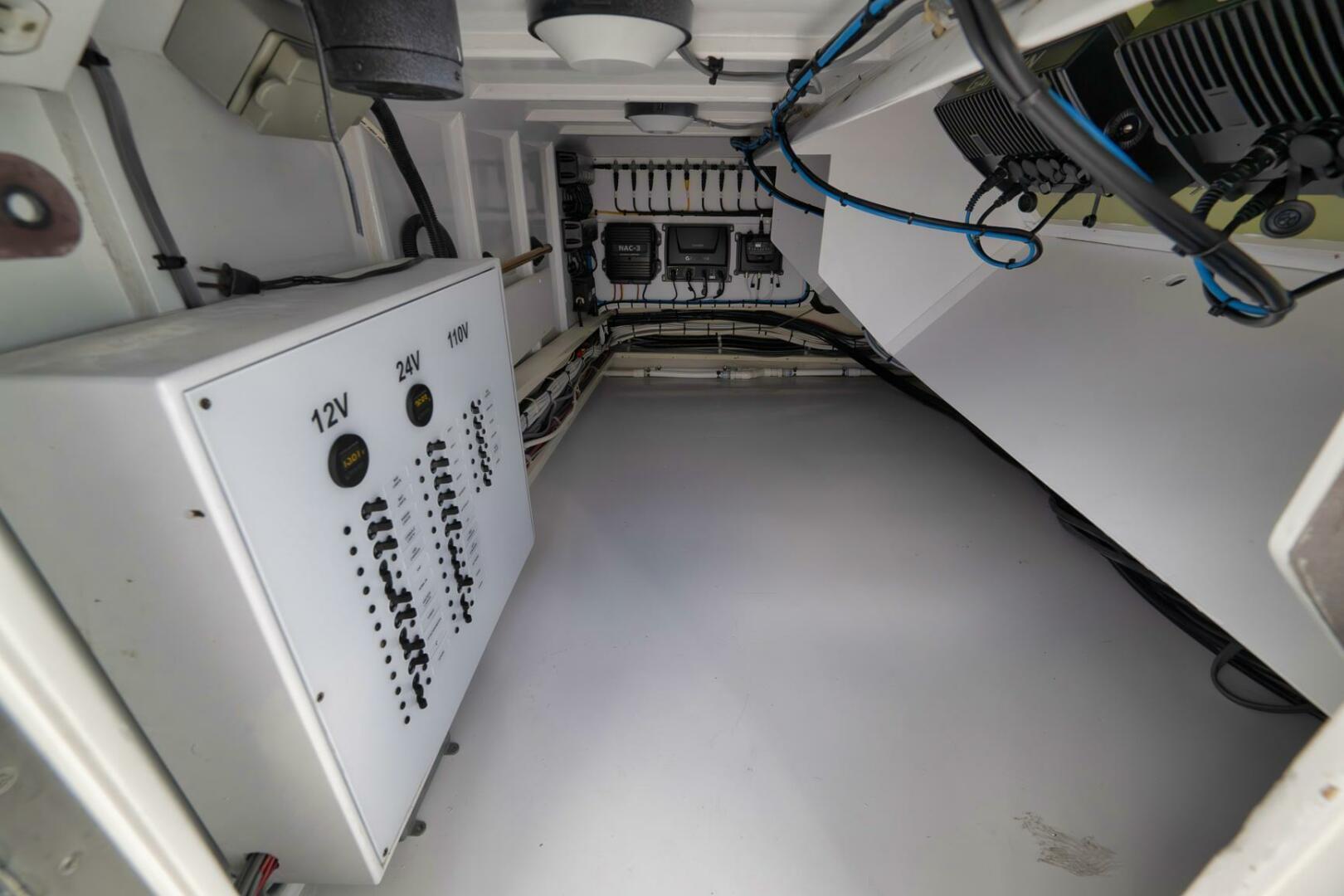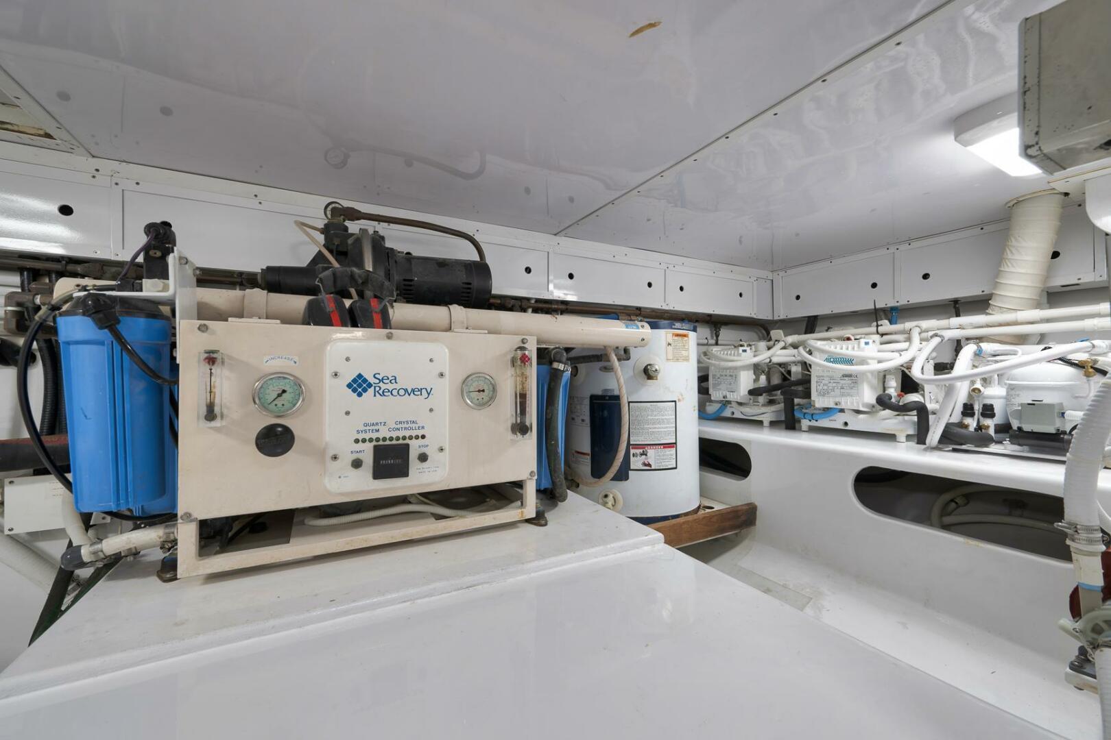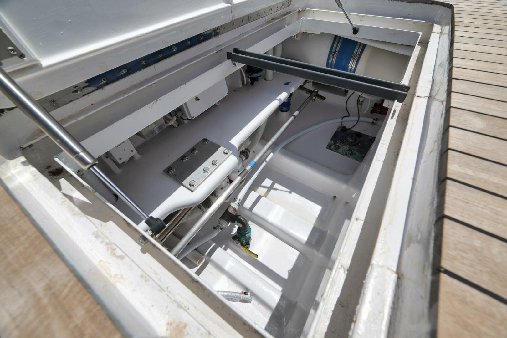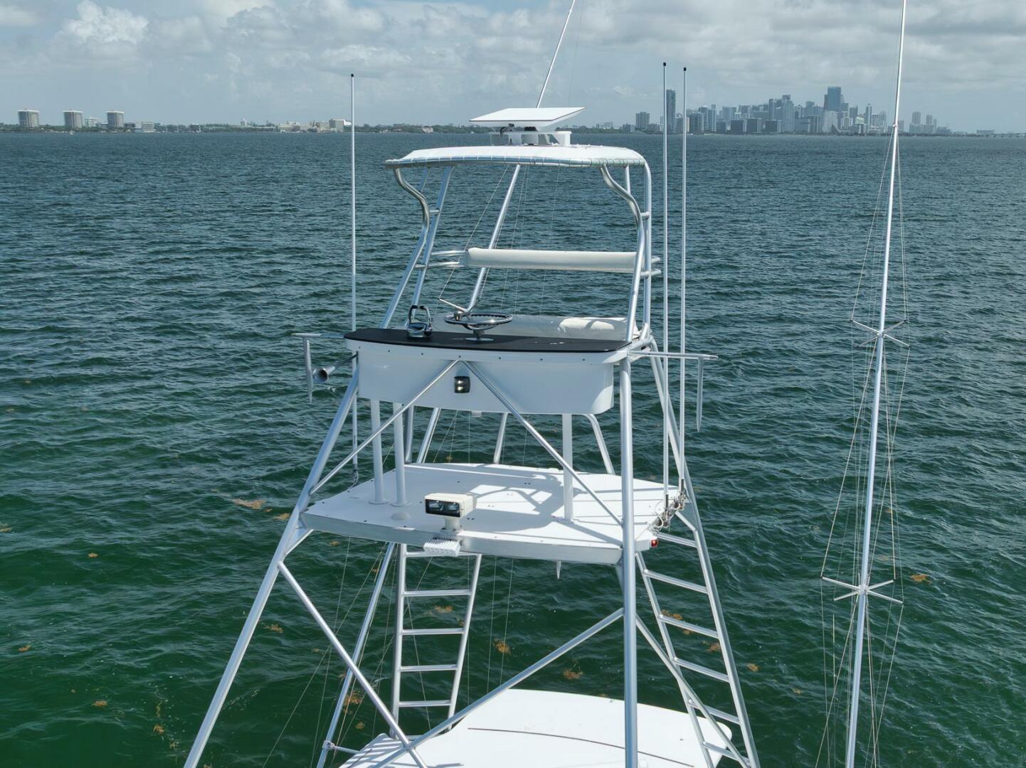 Below deck, the vessel boasts a spacious three state room, three head layout, offering exceptional comfort and privacy for the owner and guests. The companion way is outfitted with custom rod and tackle storage, ideal for easy access to your gear. There's a Kenmore standing washer and dryer unit for functional use during extended trips.
