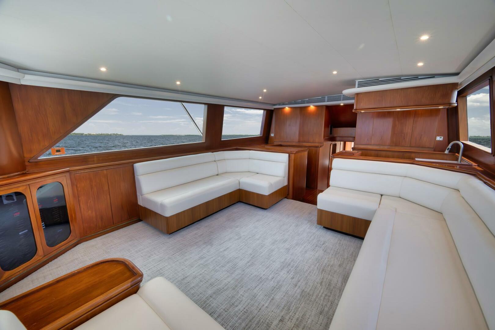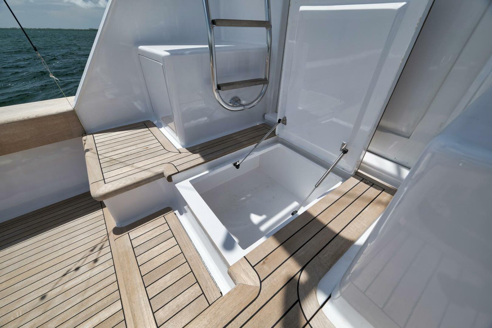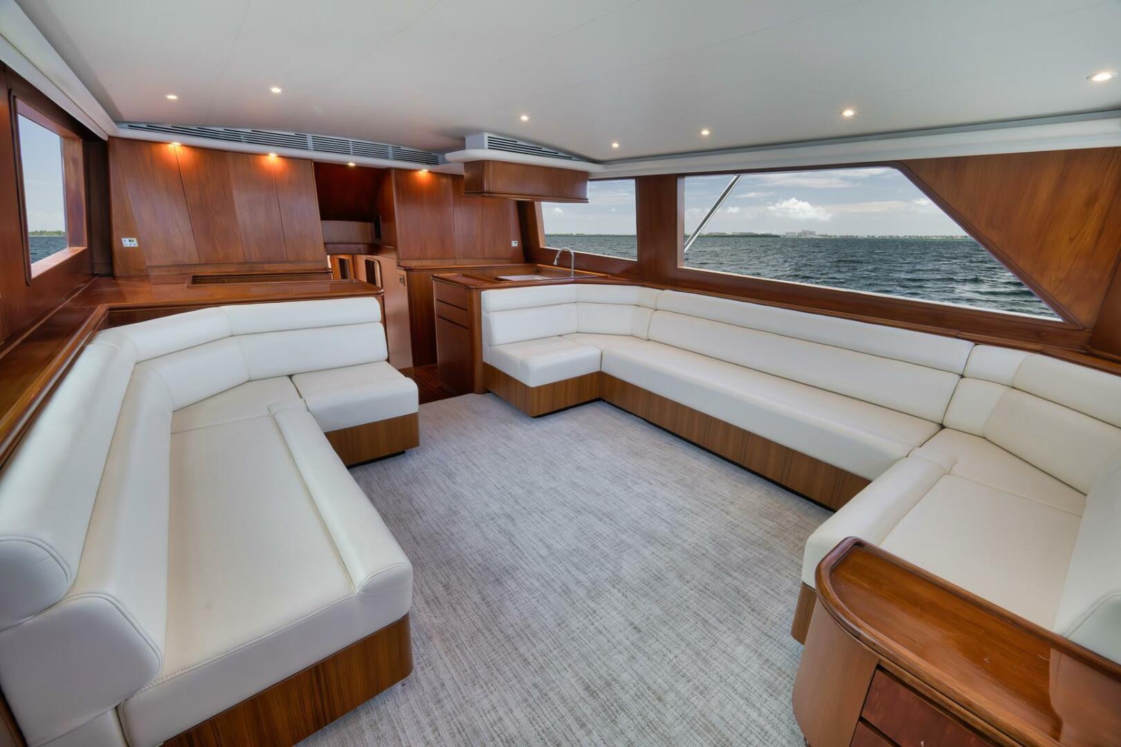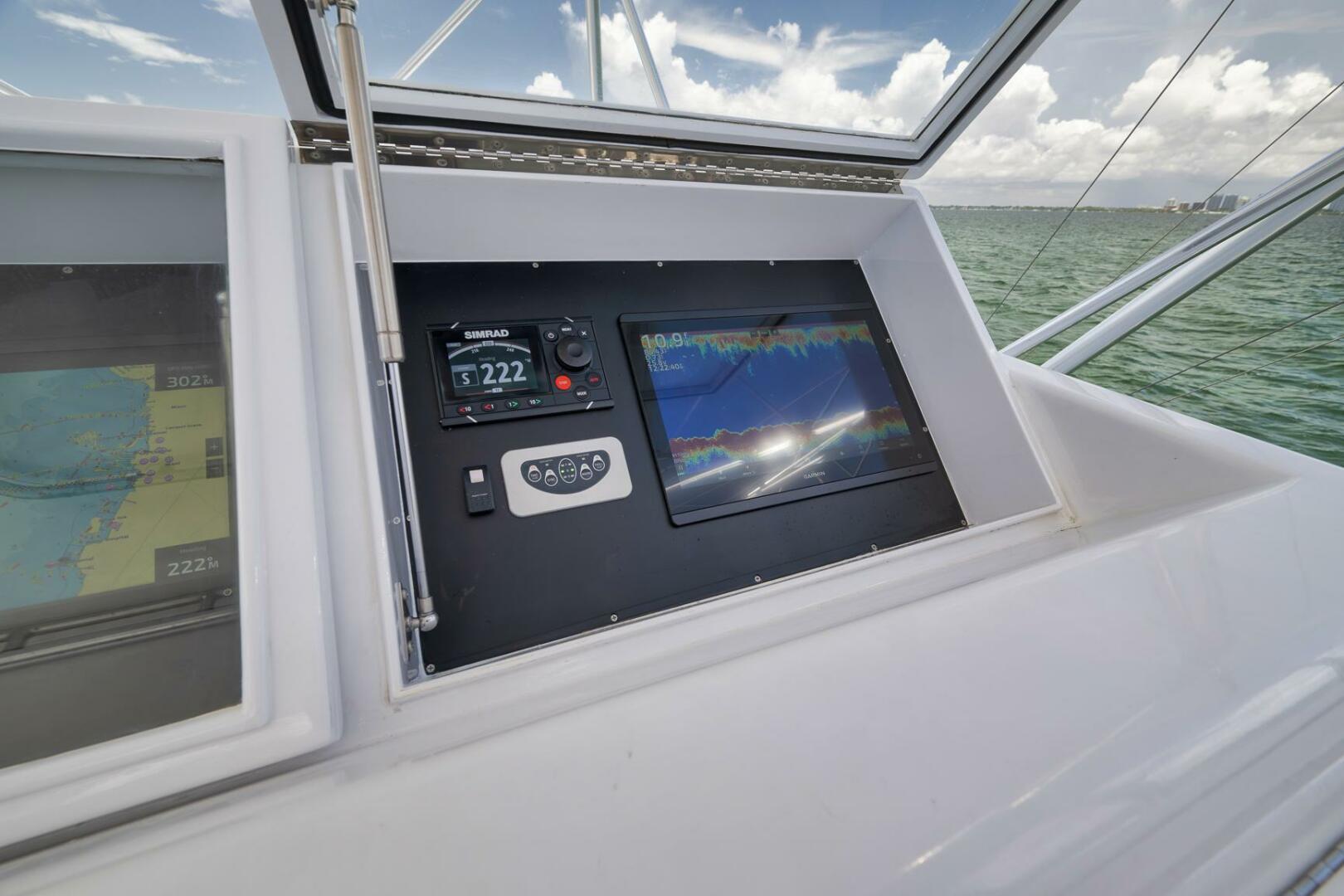 The salon of “Bird Dog” is elegantly appointed with new soft goods and wood finishes. Designed for both comfort and functionality, imagining the custom craftsmanship Jim Smith is known for. Upon entering the salon, passing through the electric door entry, you enter to a spacious and open layout featuring L shaped settee to port, upholstered in premium ultra-leather for durability and comfort. U-Shaped settee to the starboard as well, upholstered in premium ultra-leather. Both of them have endless storage beneath for tackle. The teak finishes throughout the salon and galley offering ample storage and housing entertainment systems and power supply panel. With all the decor and updated soft goods, LED lighting provides that traditional blend of sportfish style and modern comforts.