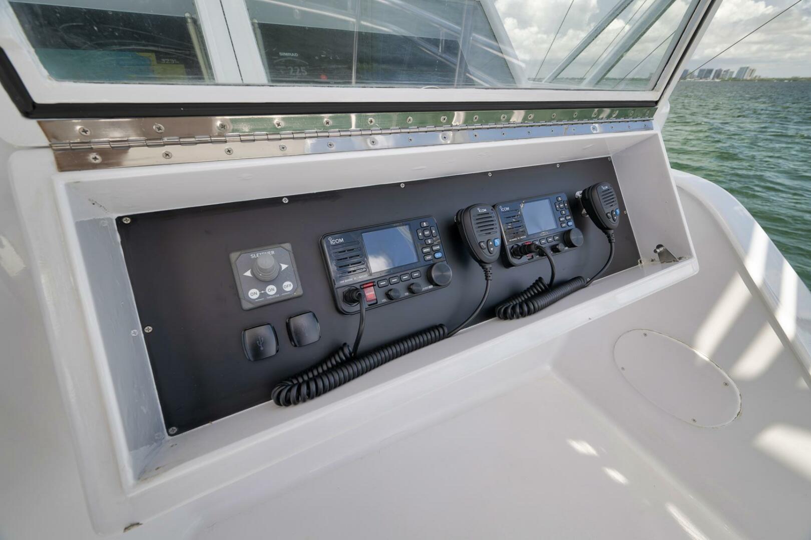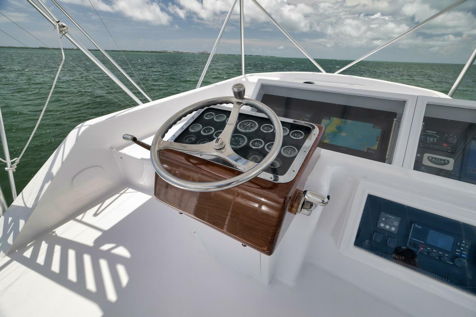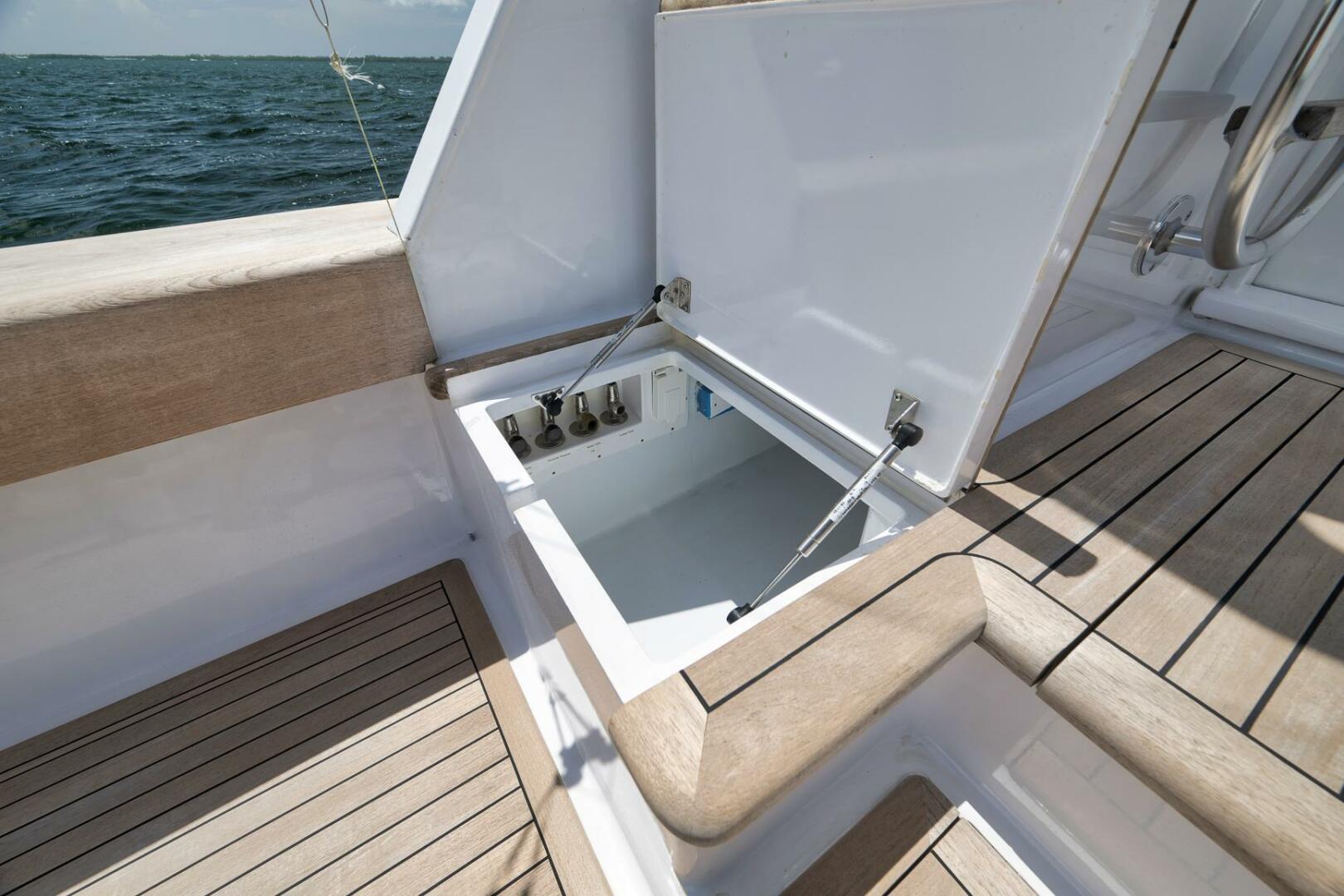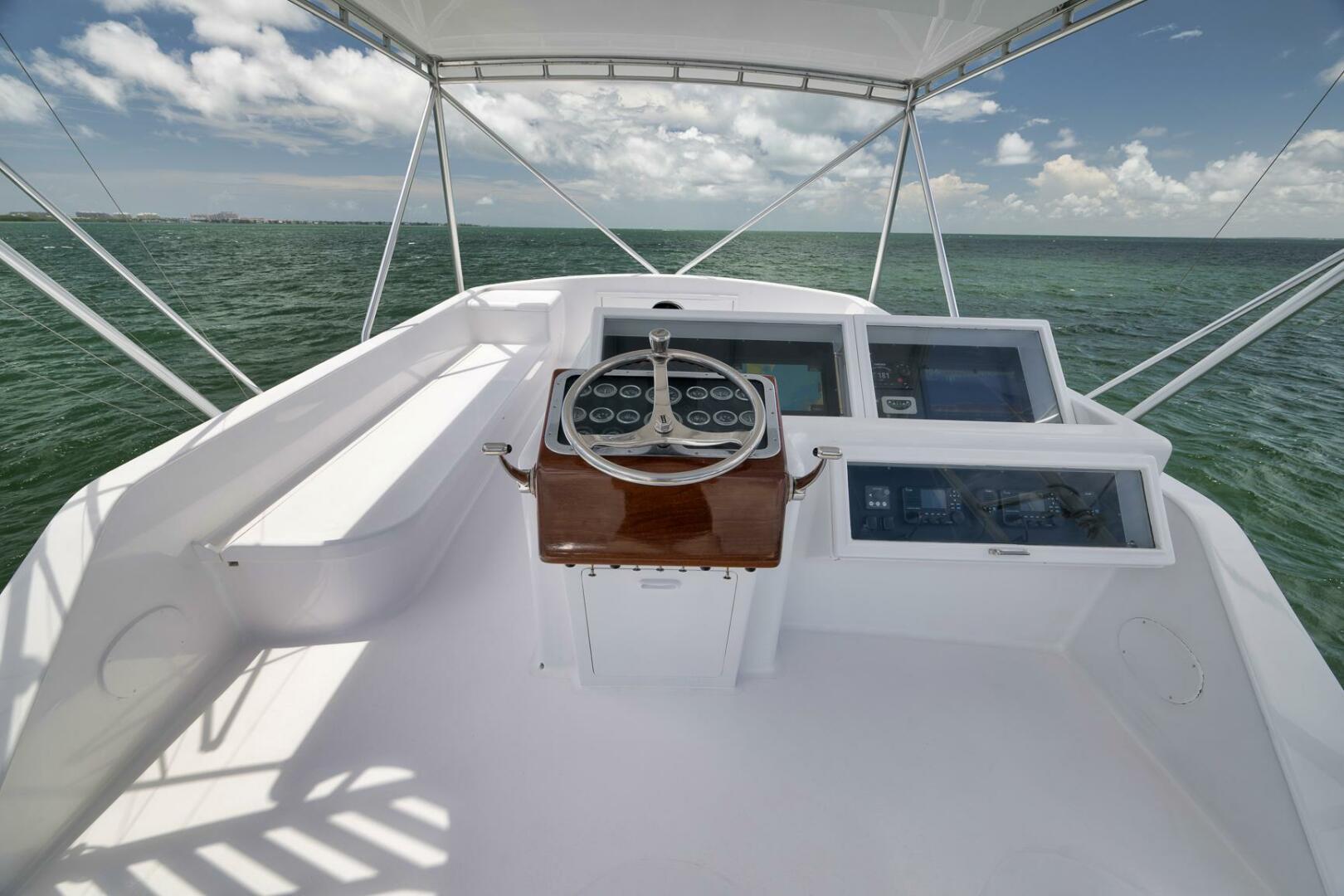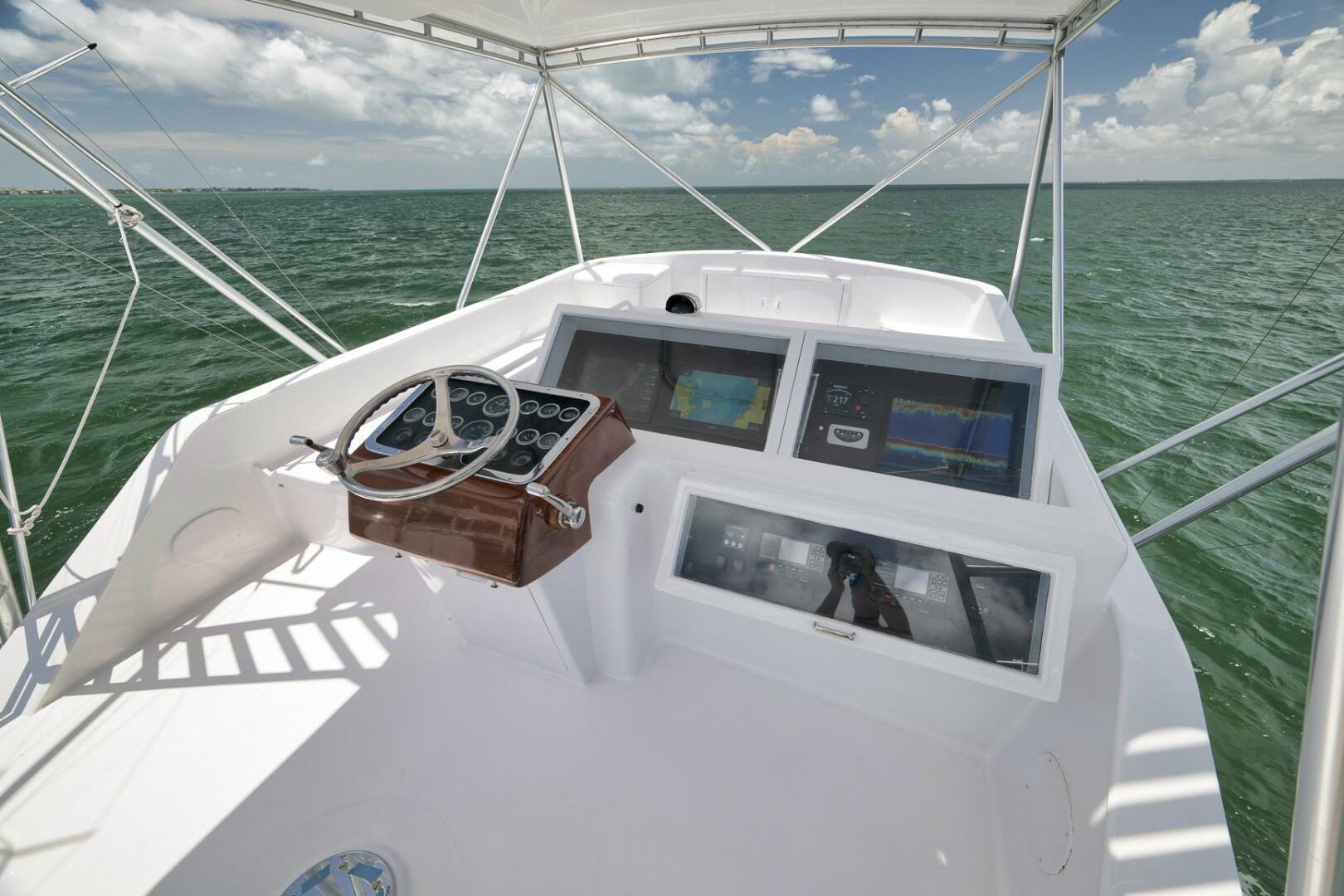 The salon of “Bird Dog” is elegantly appointed with new soft goods and wood finishes. Designed for both comfort and functionality, imagining the custom craftsmanship Jim Smith is known for. Upon entering the salon, passing through the electric door entry, you enter to a spacious and open layout featuring L shaped settee to port, upholstered in premium ultra-leather for durability and comfort. U-Shaped settee to the starboard as well, upholstered in premium ultra-leather. Both of them have endless storage beneath for tackle. The teak finishes throughout the salon and galley offering ample storage and housing entertainment systems and power supply panel. With all the decor and updated soft goods, LED lighting provides that traditional blend of sportfish style and modern comforts.