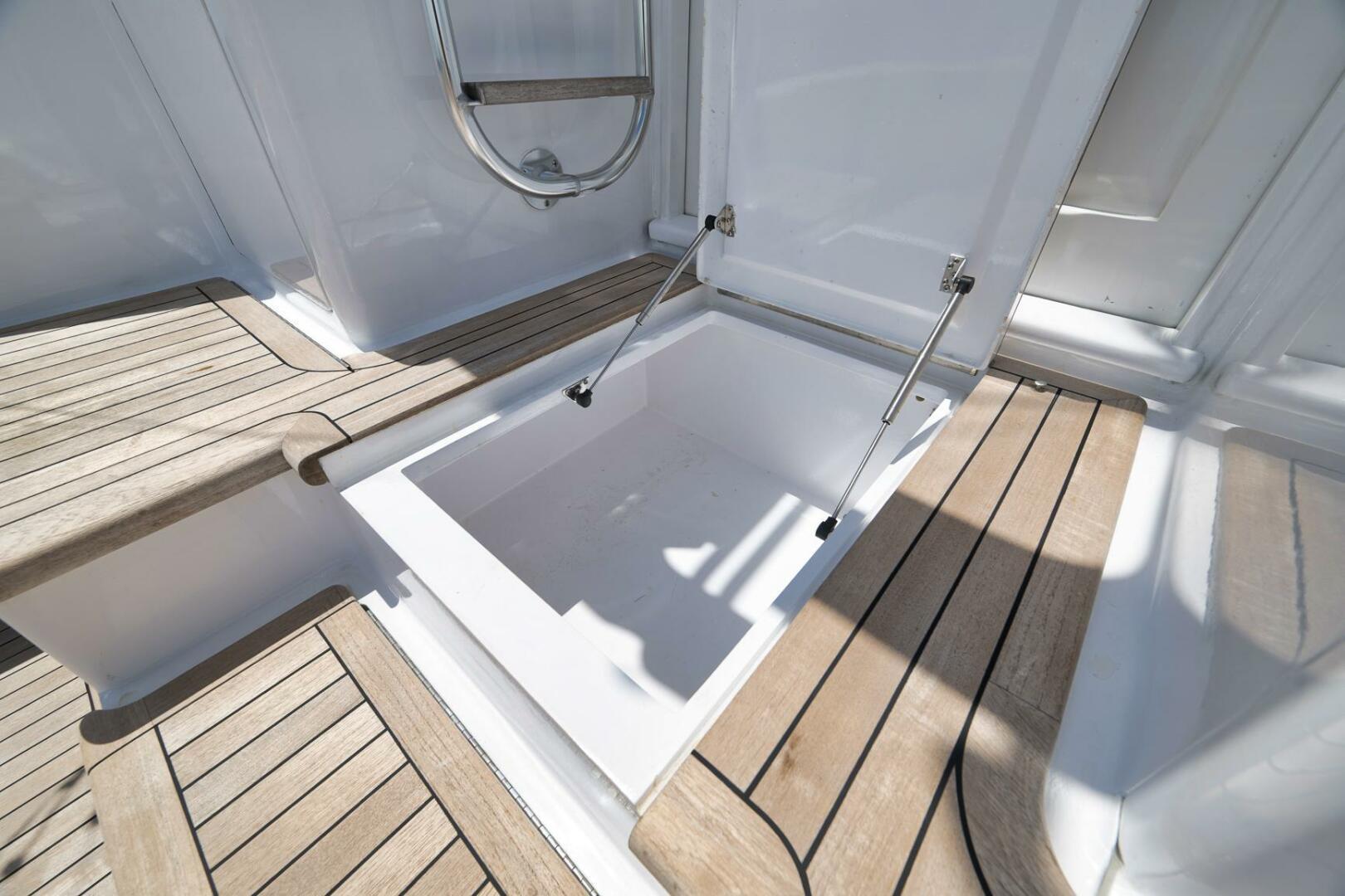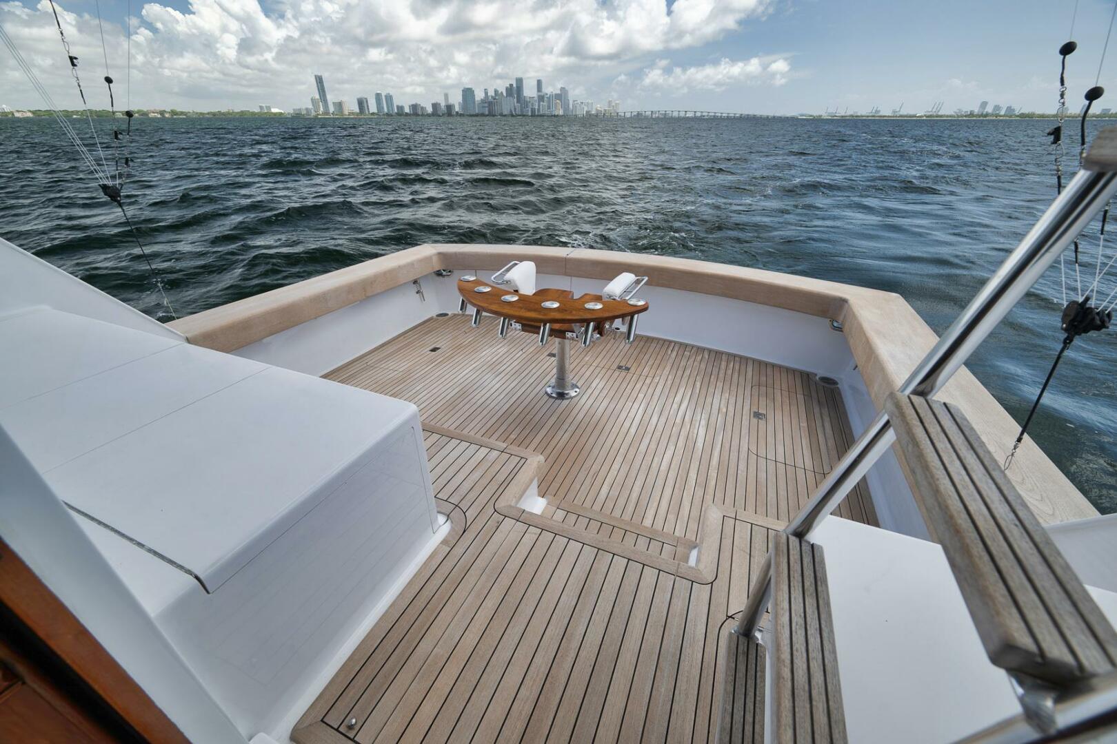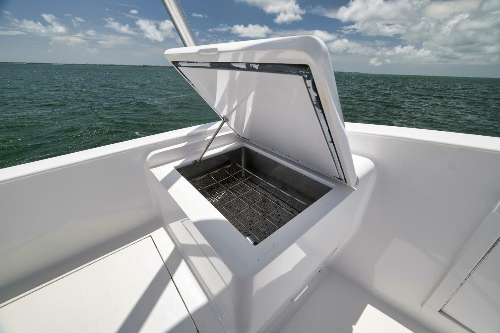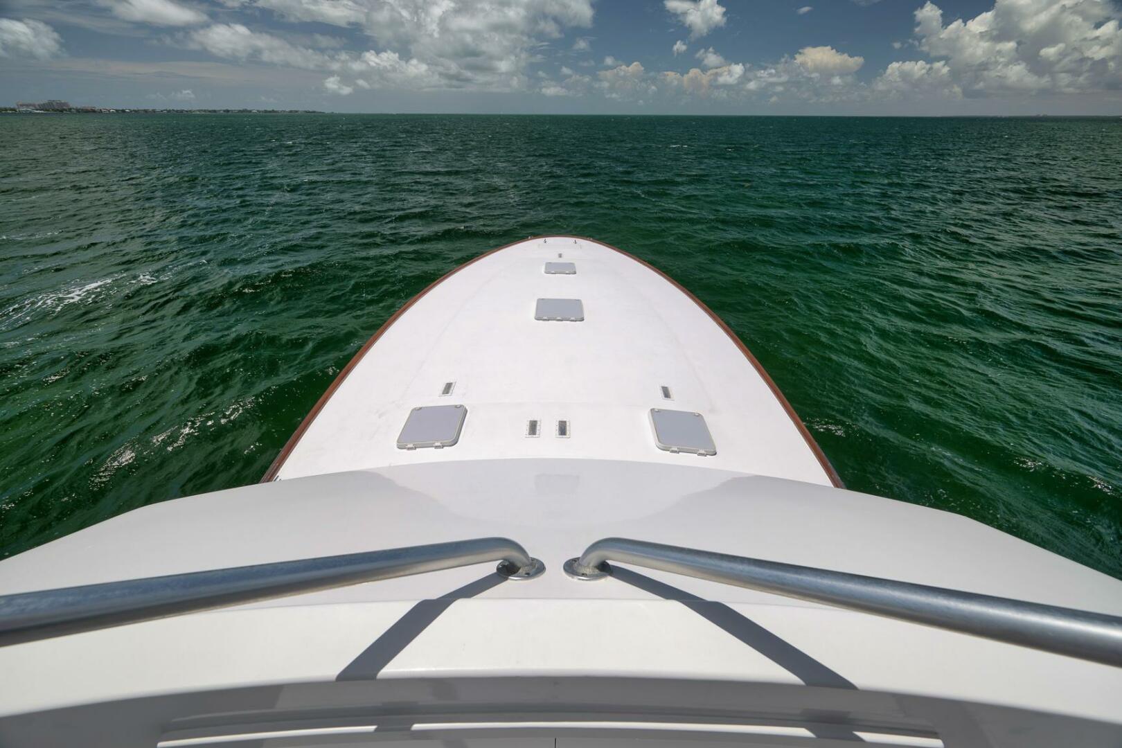 The salon of “Bird Dog” is elegantly appointed with new soft goods and wood finishes. Designed for both comfort and functionality, imagining the custom craftsmanship Jim Smith is known for. Upon entering the salon, passing through the electric door entry, you enter to a spacious and open layout featuring L shaped settee to port, upholstered in premium ultra-leather for durability and comfort. U-Shaped settee to the starboard as well, upholstered in premium ultra-leather. Both of them have endless storage beneath for tackle. The teak finishes throughout the salon and galley offering ample storage and housing entertainment systems and power supply panel. With all the decor and updated soft goods, LED lighting provides that traditional blend of sportfish style and modern comforts.