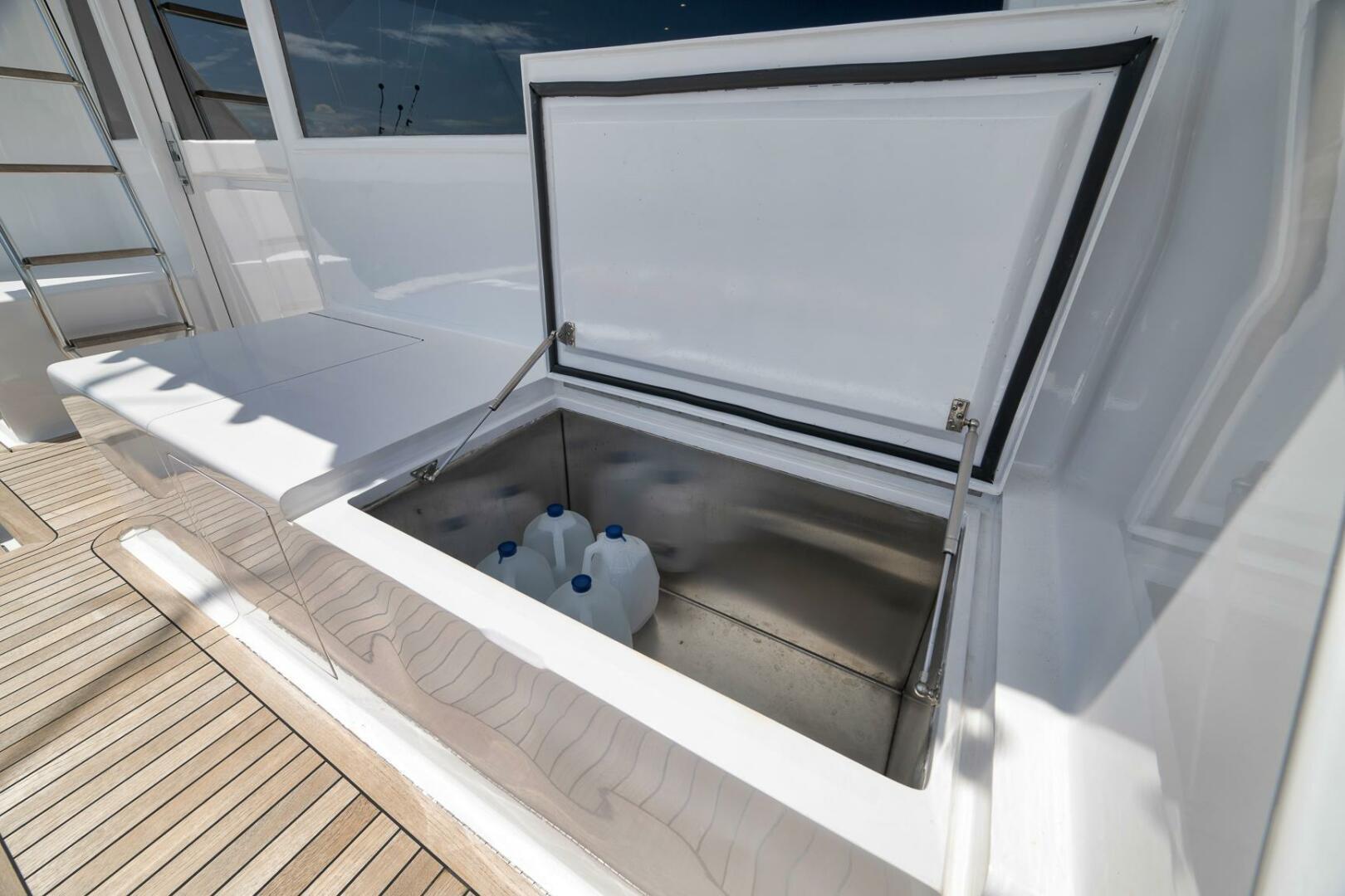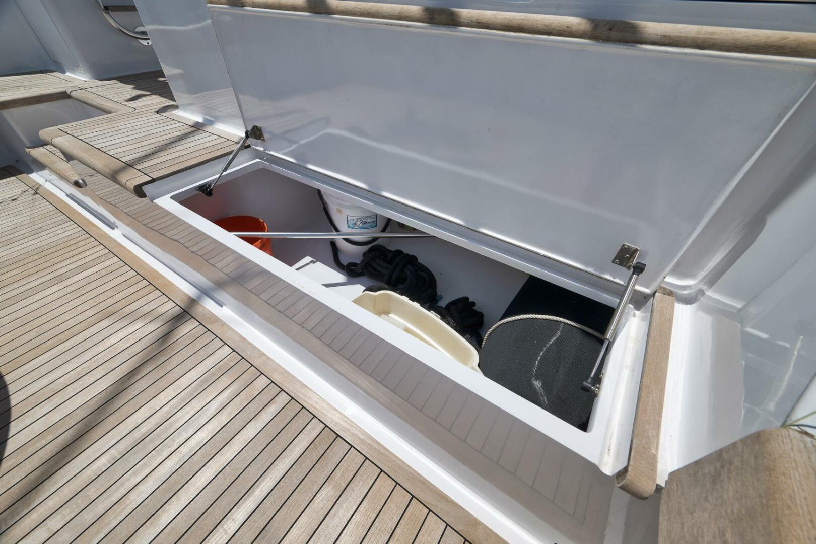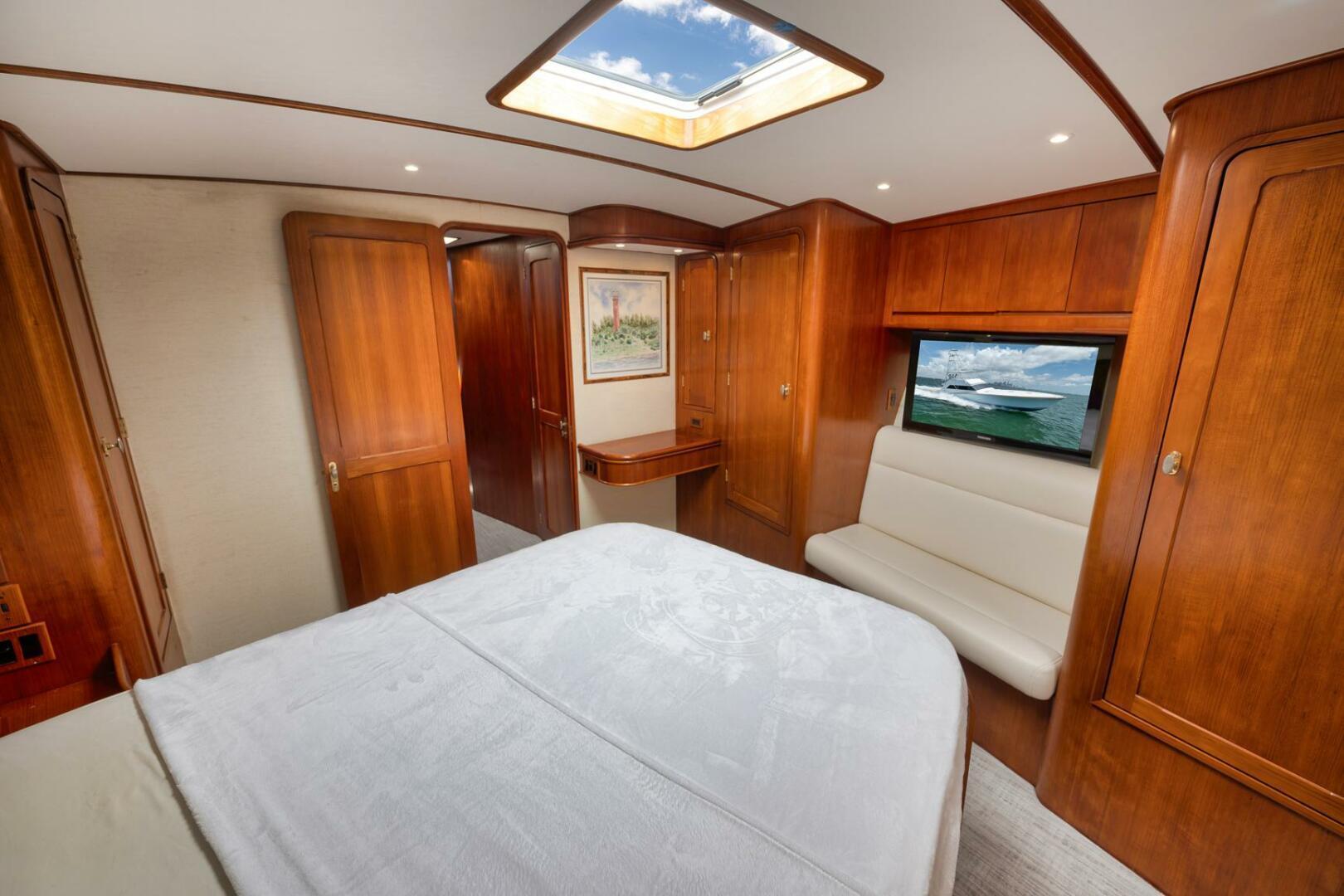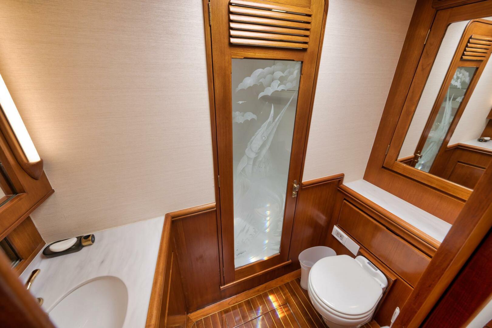 The Galley is located forward of the salon offering a spacious and well equipped area for meal preparation. It features new Corian countertops, teak cabinetry and ample storage throughout. Appliances include custom stainless steel freezer and refridgeration, Bosch microwave, Miele cooktop, stainless steel sink and ice maker. The Galley area also provides a small wet bar area with bottle storage. Teak and holly floors, LED lighting, as well as plenty of natural lighting provides excellent visibility with beautifully soft color tones.