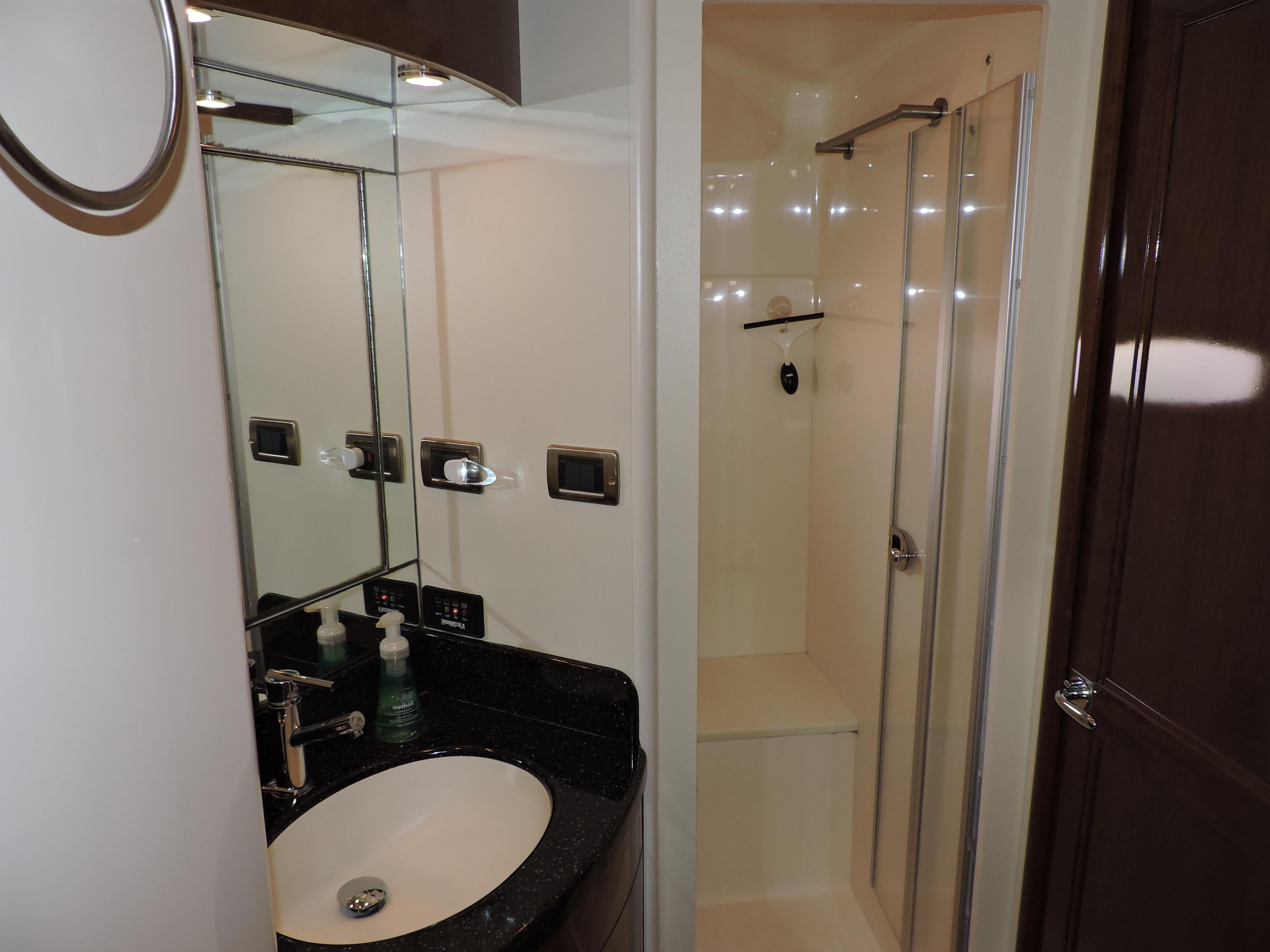- Retractable hand shower w/ wall-mounted holding bracket, towel bar, recessed overhead lighting, screened portlight w/ privacy glass