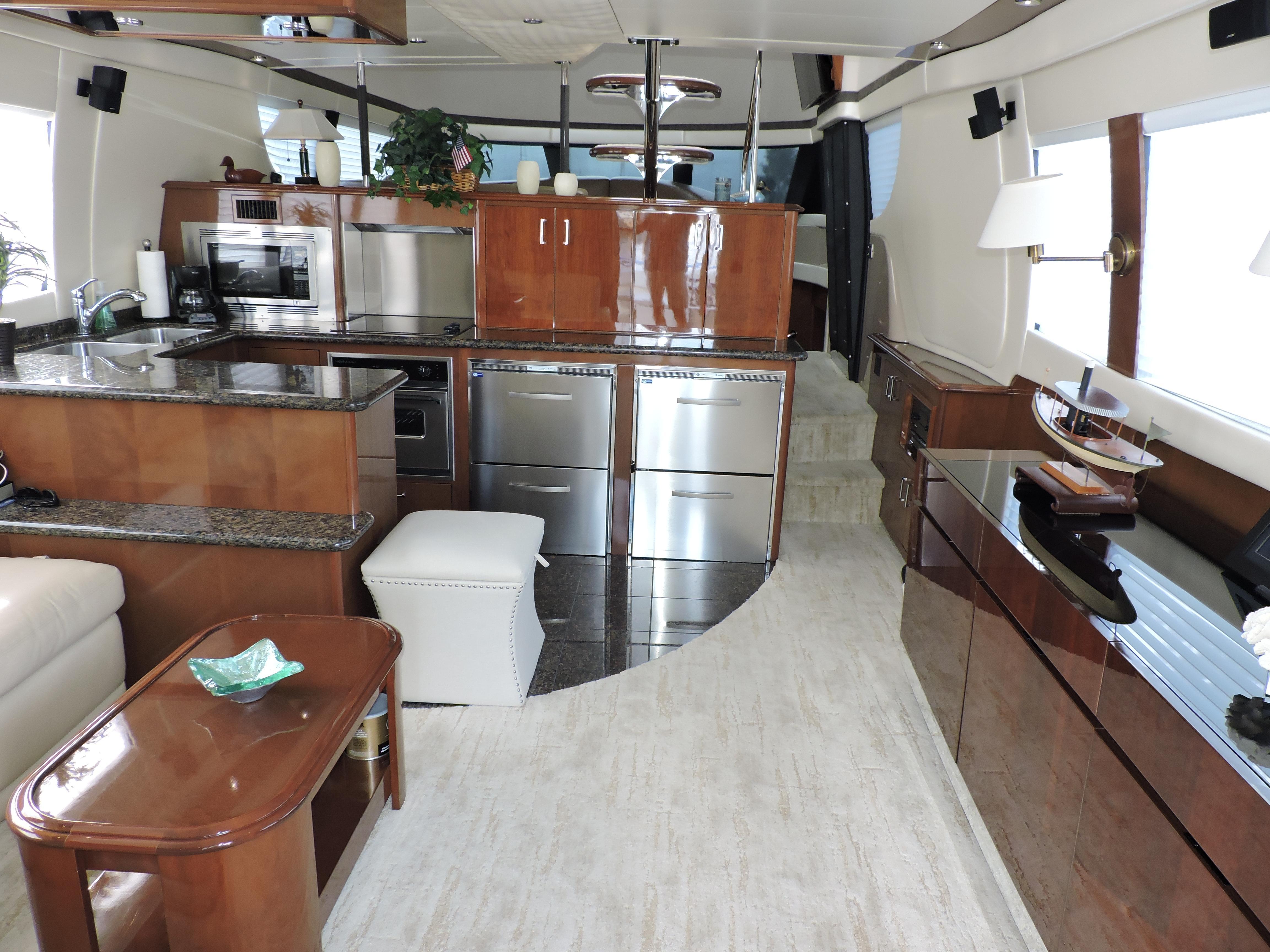 - Wet bar w/ sink, prep surface to port, prep surface, In-counter storage, Freezer and refrigerator below to starboard