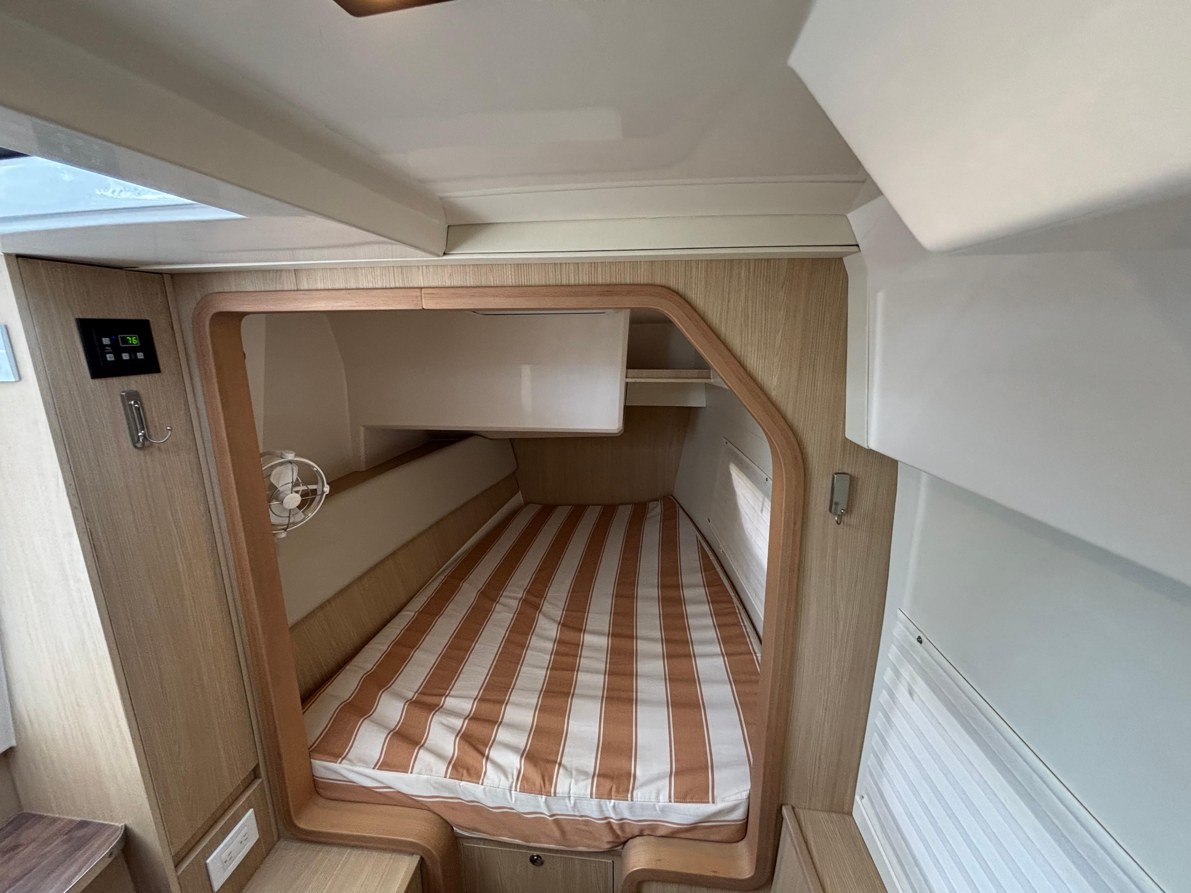 - Galley to starboard with Corian surface, 80 L/2.8 c ft fridge/freezer, storage, wash basin