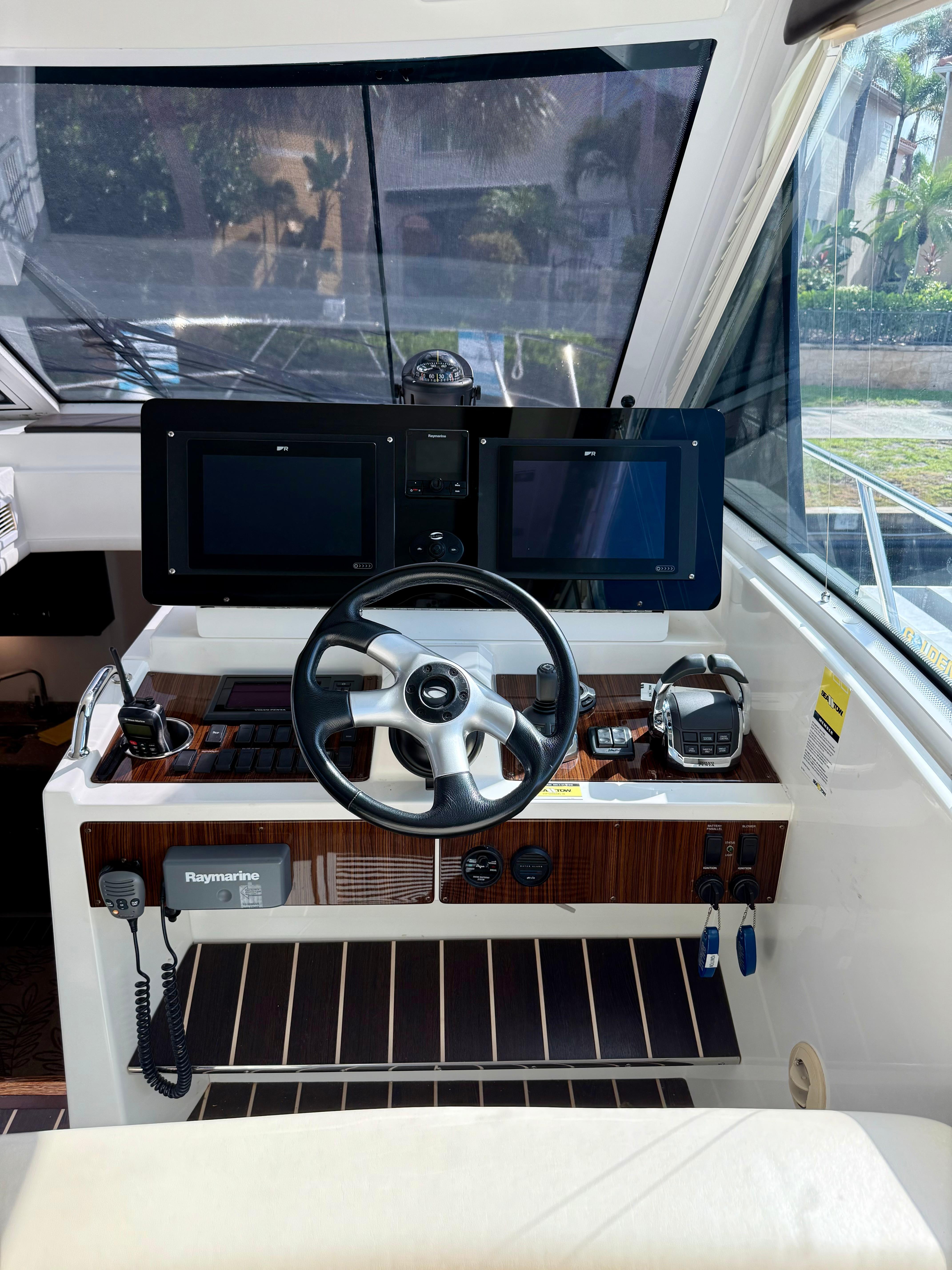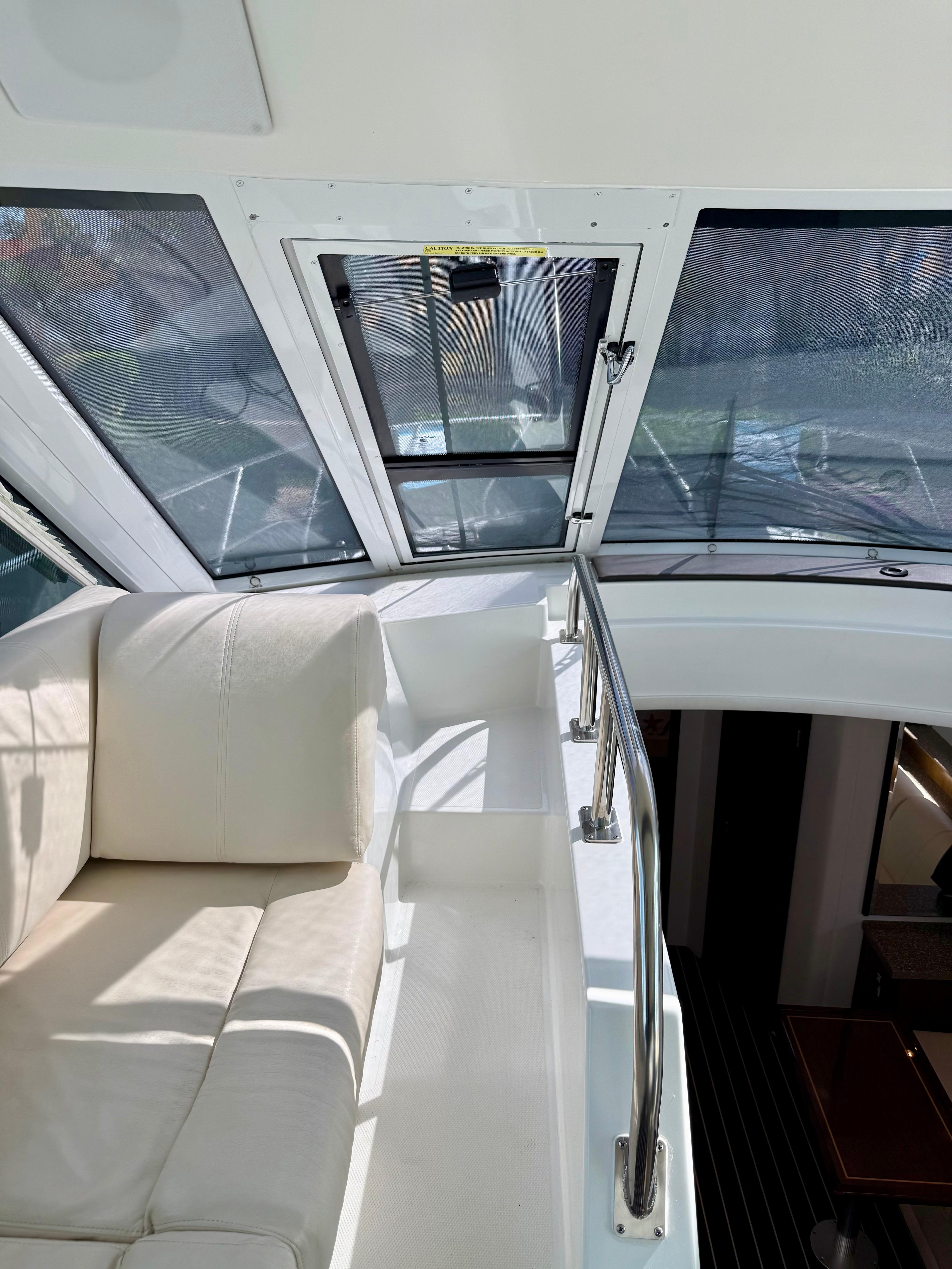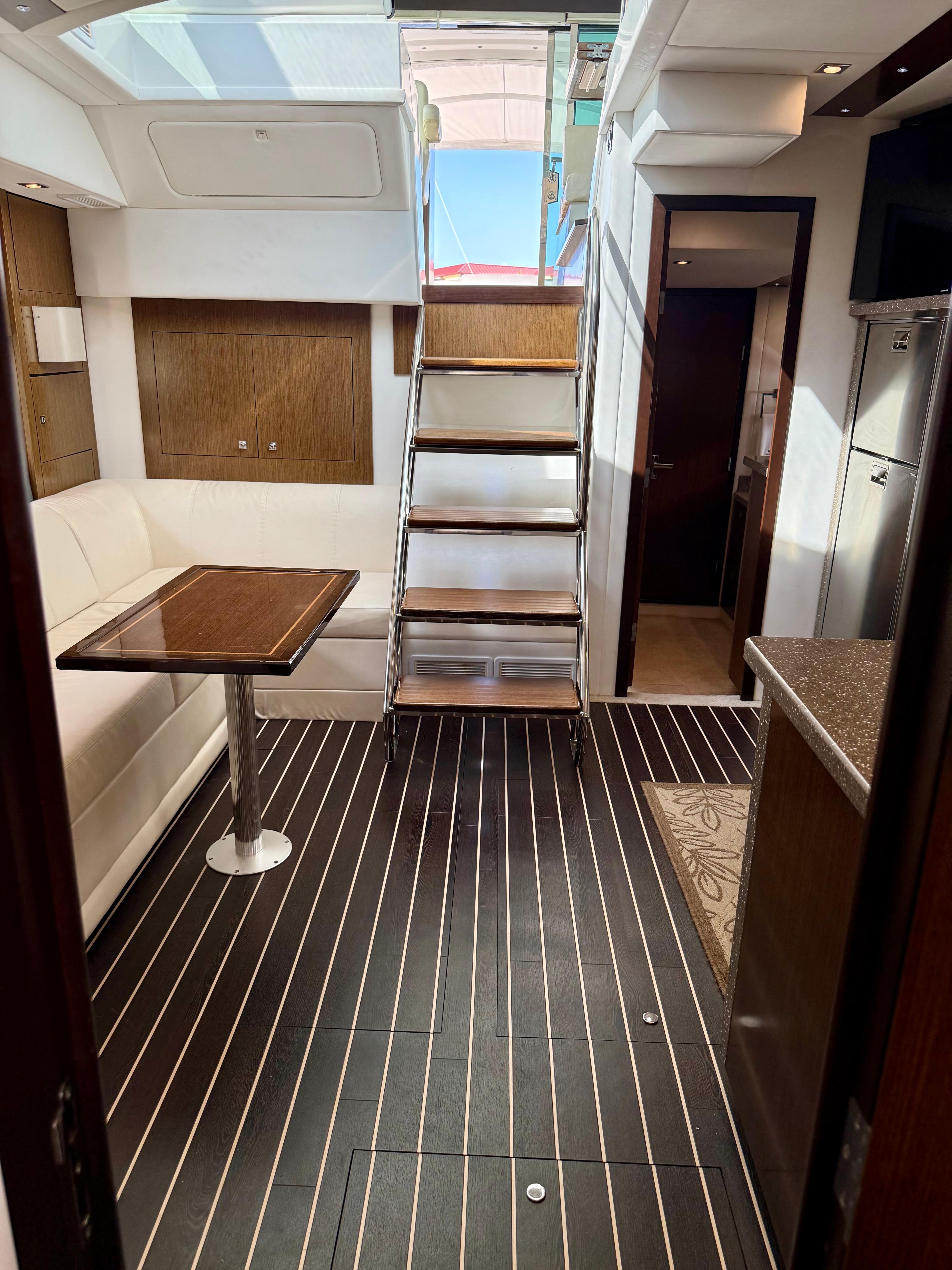 Enter a huge sliding door that really opens up the outside cockpit to the inside Helm and upper Salon areas. This area includes Captain seating for two, companion seating, dinette, and beverage storage, pop up flat screen TV, wood flooring, electrical sun-roof, window treatments, and custom décor. Continuing forward through the WALK THROUGH windshield for safe and easy access to the Bow and Sun Pad deck.