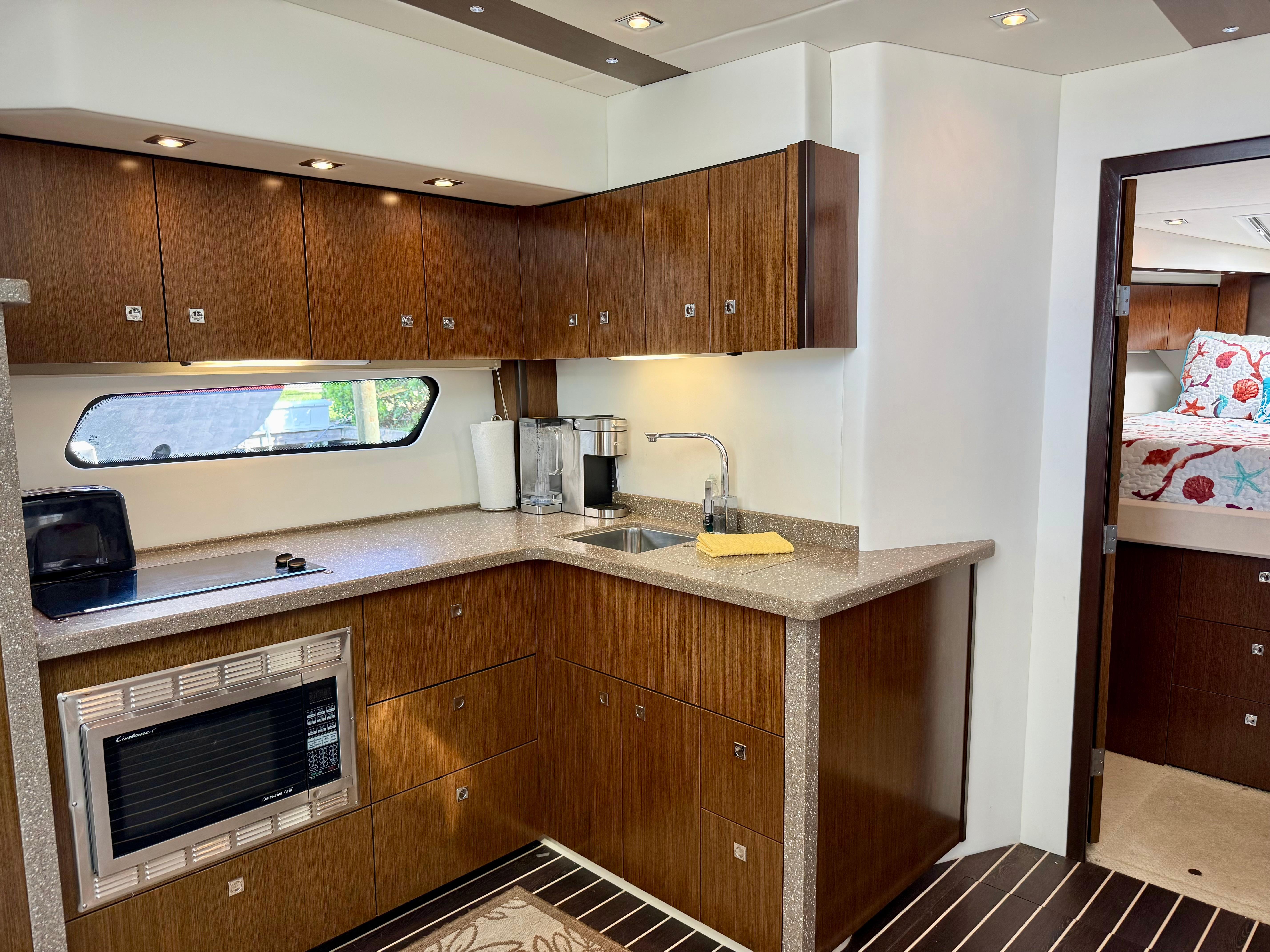 Coming from the helm area you step down in to the huge Gourmet Galley and lower Salon area. This area feels much bigger than it is because the ceiling is cut back for natural open lighting and a open ceiling. The lower salon has a large L-sofa, flat screen TV, Gourmet galley, custom décor, award winning interior, wood flooring. Good size windows below give a open feeling as well.